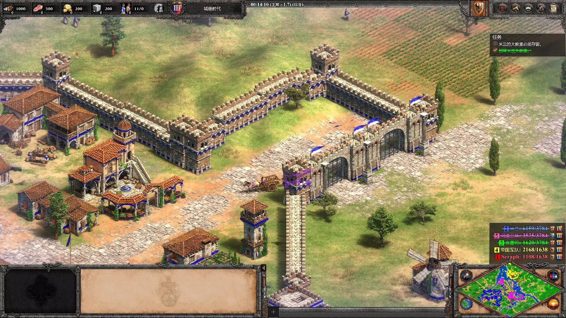 真正的至高君主 在《帝国时代2》第三个巴巴罗萨任务“教宗之争”中,在没有获得任何村民的情况下招降米兰的大教堂。 下图中的城门固定有商队出入,直接拉上开局4个僧侣和一个炮灰坐船过河,从这里进城摸到大教堂处。招降前记得存个档。