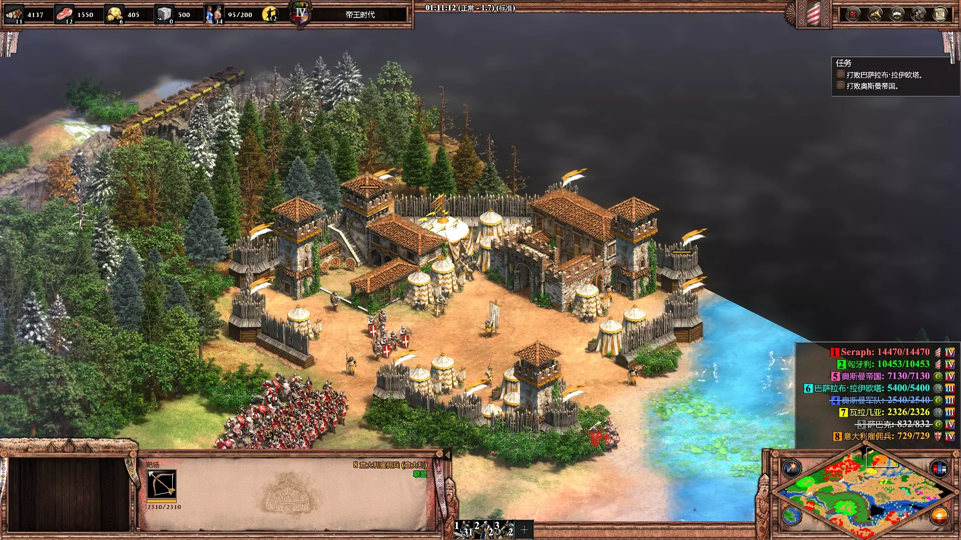 谁想来点意式披萨? 使用非意大利文明训练1000名意大利佣兵。 这个成就稍微特殊一点,需要开启一局2v2对战,盟友必须选择意大利文明,这样你才能在兵营中生产意大利佣兵。由于人口肯定会不够,记得及时手动删除单位或用投石车清理敌方单位来腾出人口。