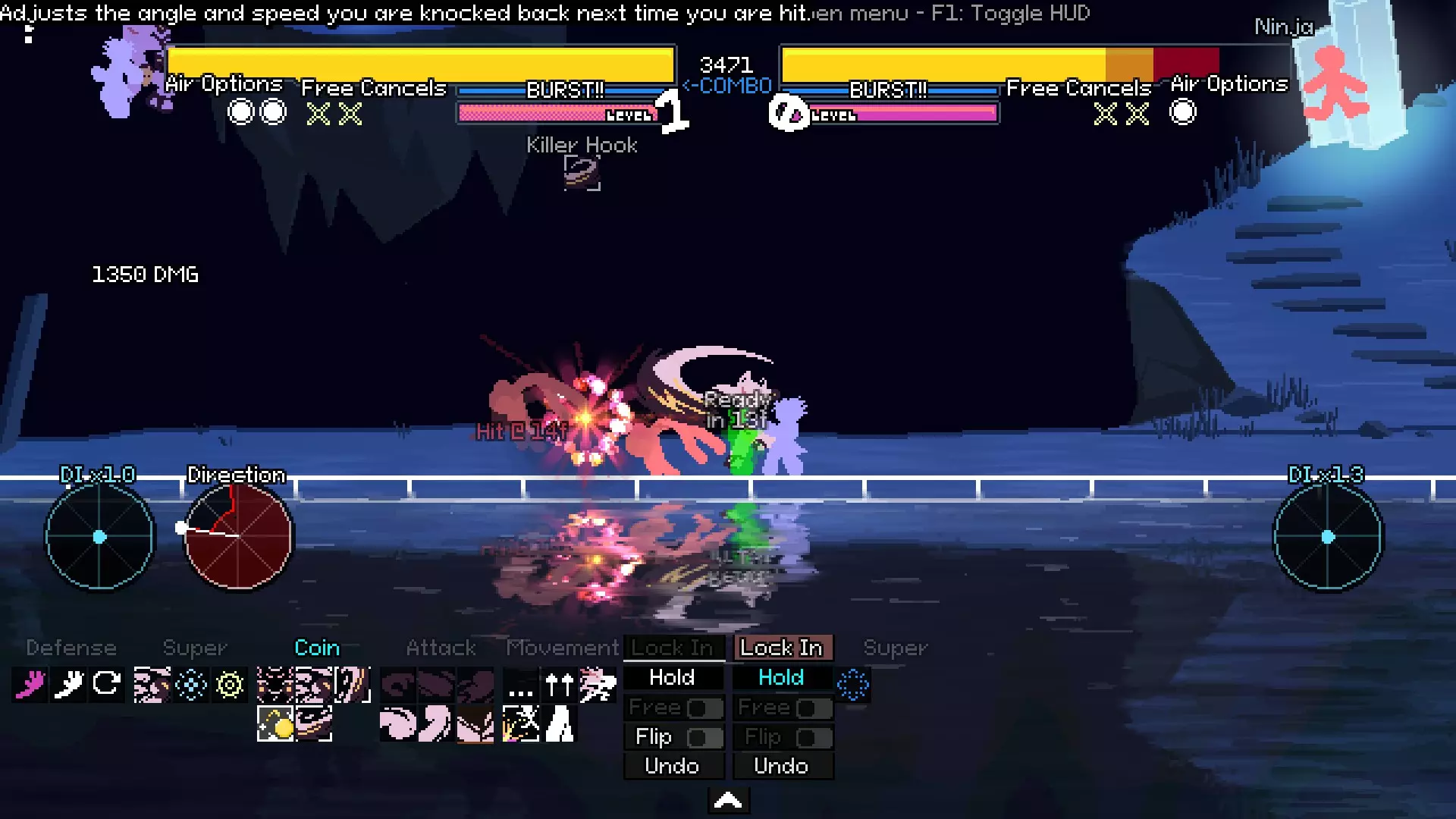 使用特殊技(不召唤替身)和轻拳。空中连招虽然不长也不算强力,但效果也不错。可以通过调整特殊技的方向来修正它们。 尽量将对手控制在你附近,这样能增加他们用方向输入(DI)回避连招的难度。 连打、投掷以及超必杀技【Flurry】和【No Trace Left】是终结技,因为它们的打击力度非常强。 如果对手全程用方向输入(DI)回避了你的连招,遇到这种情况不要慌。像这样向敌人投掷硬币: