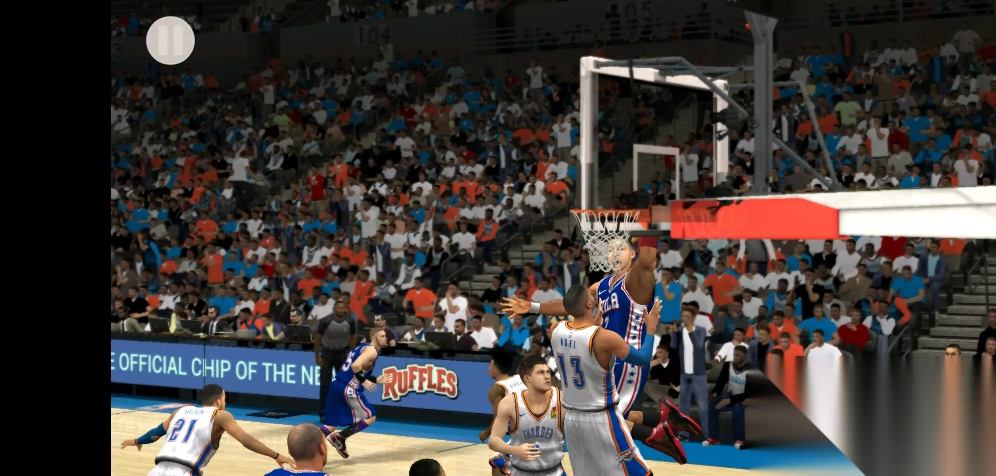 要完成这个动作,需要像普通的【扣篮】(从上方投掷)一样助跑,按住加速键和左摇杆,将右摇杆向上推,然后立即向下推并保持按住,直到出现【投篮条】(投掷条),当投篮条充满【绿色区域】(绿色部分)时,松开右摇杆。如果操作正确,大多数情况下都能完成精彩的扣篮。但即使一切都做得完美,射门也可能因为各种原因失败(比如对方防守球员很强、你可能被推搡、动画被打断等等)。这个技巧在你与防守球员形成一对一的时候很有效。当然,你也可以这样冲进人群,但就算你是超人,这也会非常低效。 额外徽章
