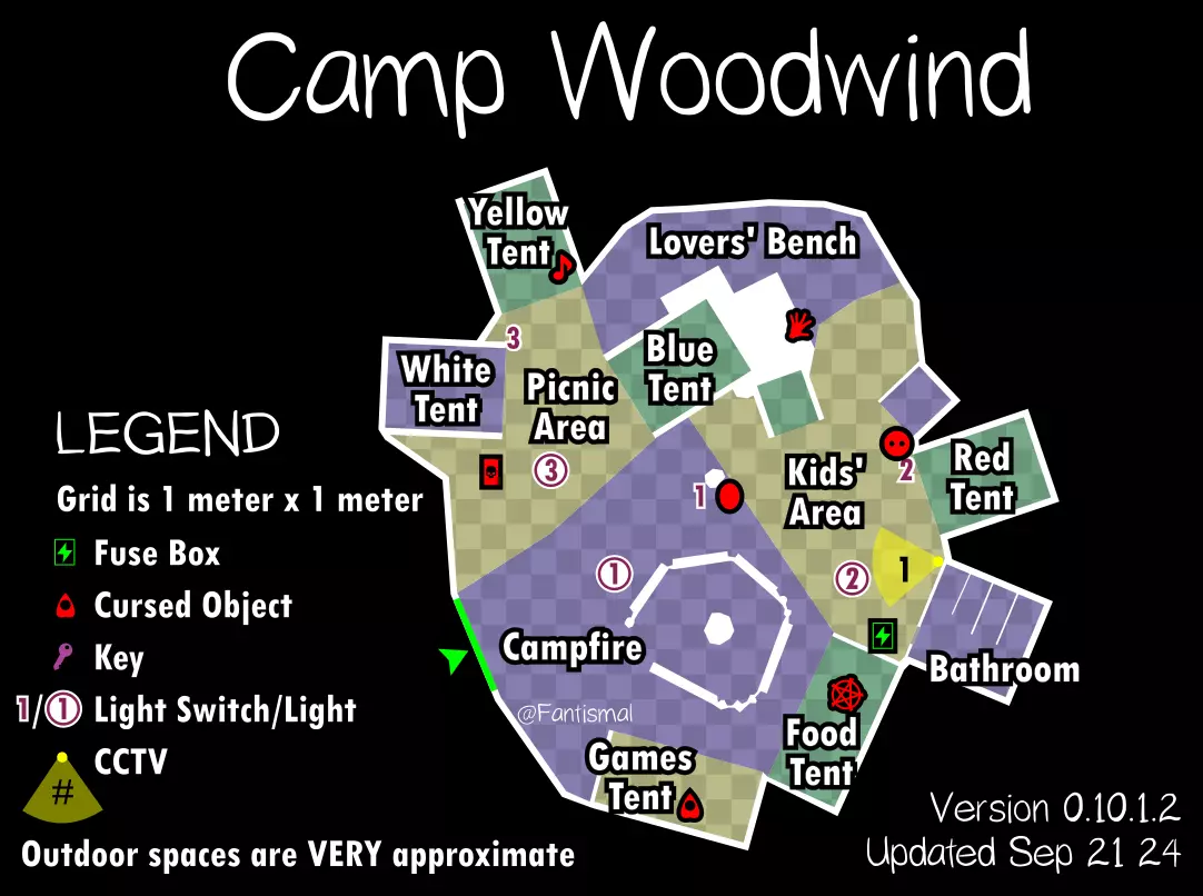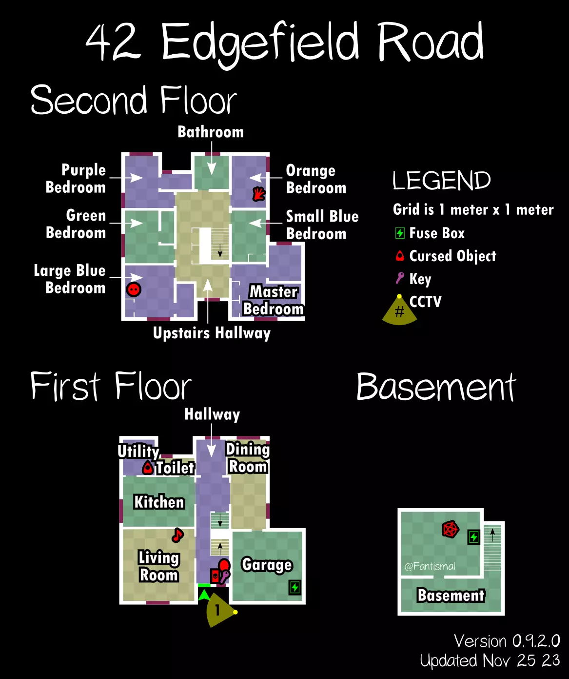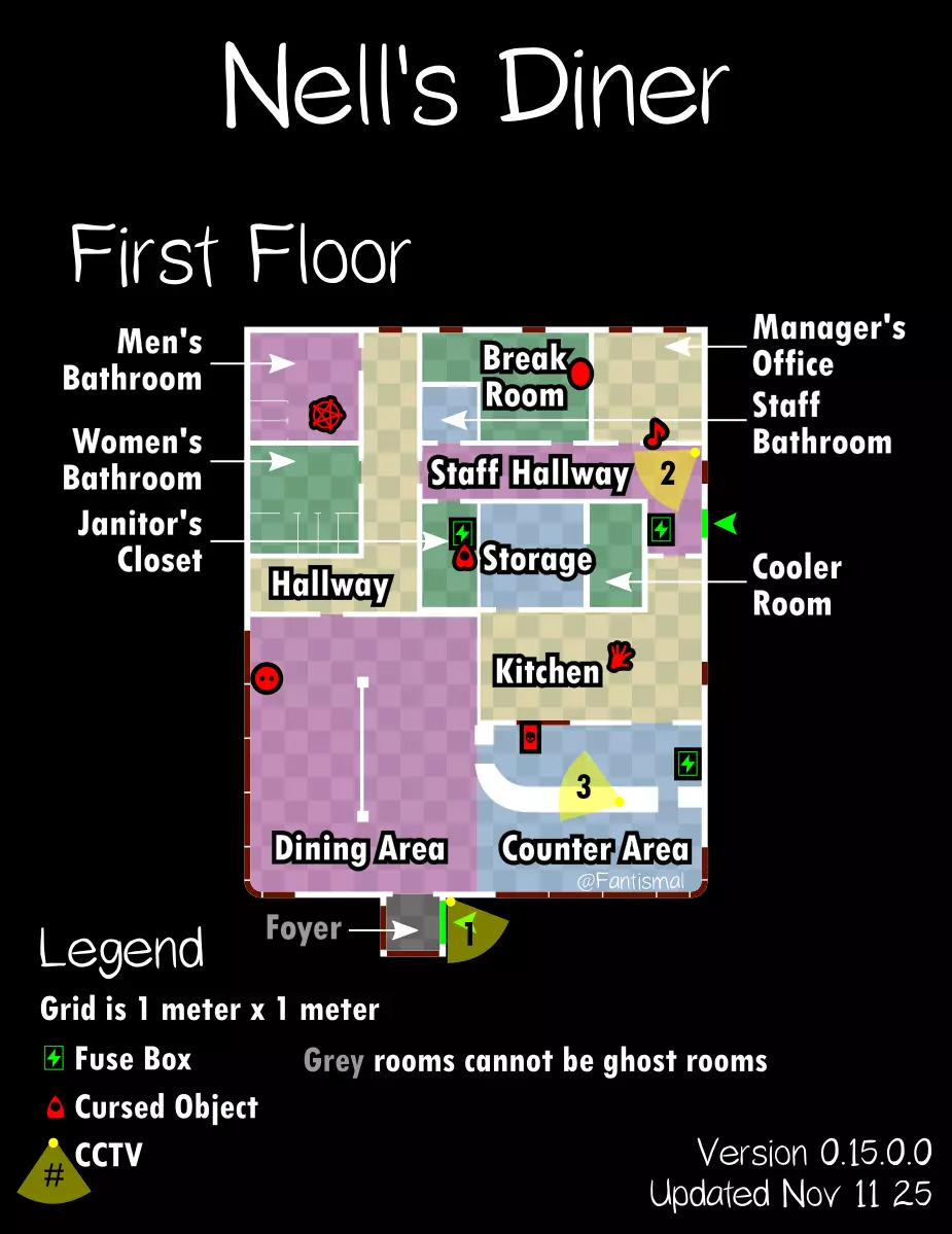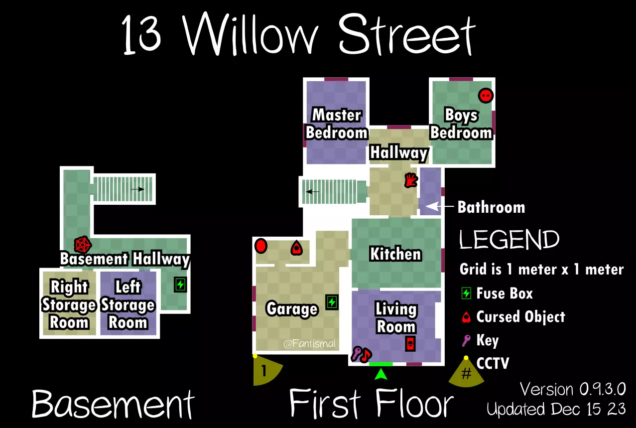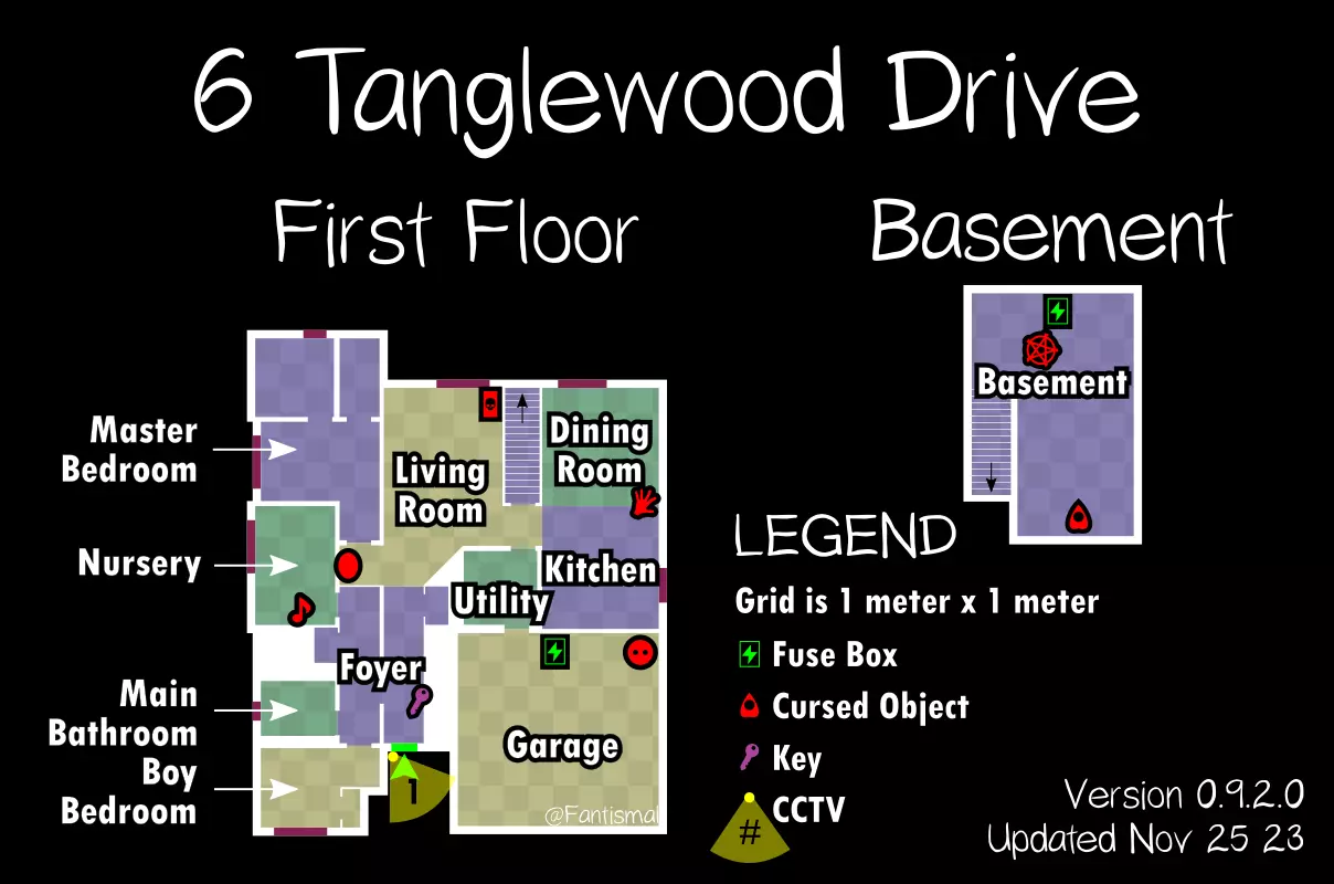 倒吊人 - 立即杀死你(1%概率) 笔记: 愚者卡牌在狩猎期间会覆盖其他任何卡牌效果。 未使用的女祭司卡牌不会叠加效果。 所有诅咒物品提示: 每局游戏只会生成一个诅咒物品。 使用任何诅咒物品后,其他诅咒物品将失效。 诅咒狩猎持续时间更长,且会跳过准备阶段。 使用任何物品前请检查理智值! 地图布局(社区制作) 玩家自制的《恐鬼症》所有官方地图可视化布局——有助于导航、诅咒物品刷新点、电闸位置确定和计划制定。 6号唐格伍德大道