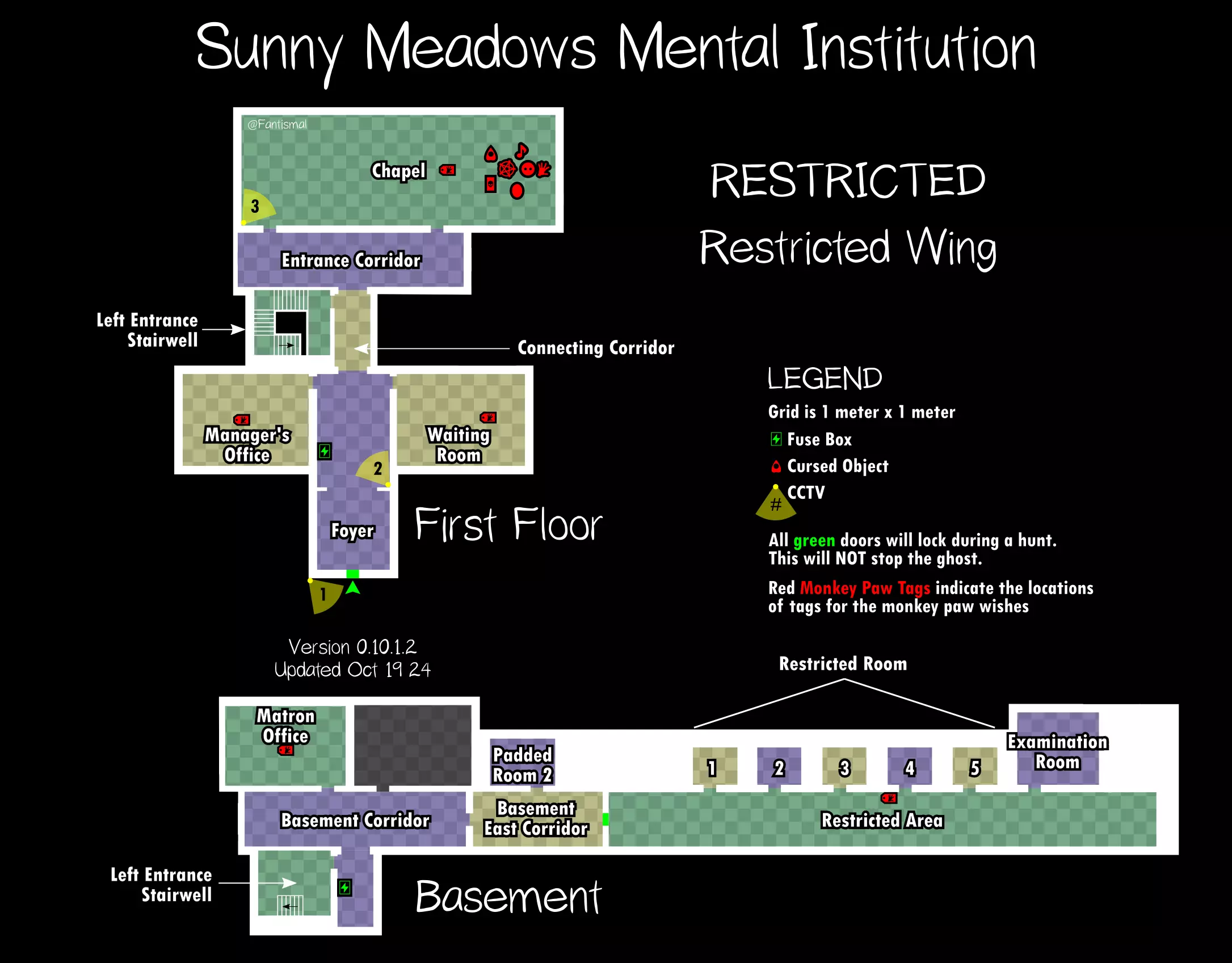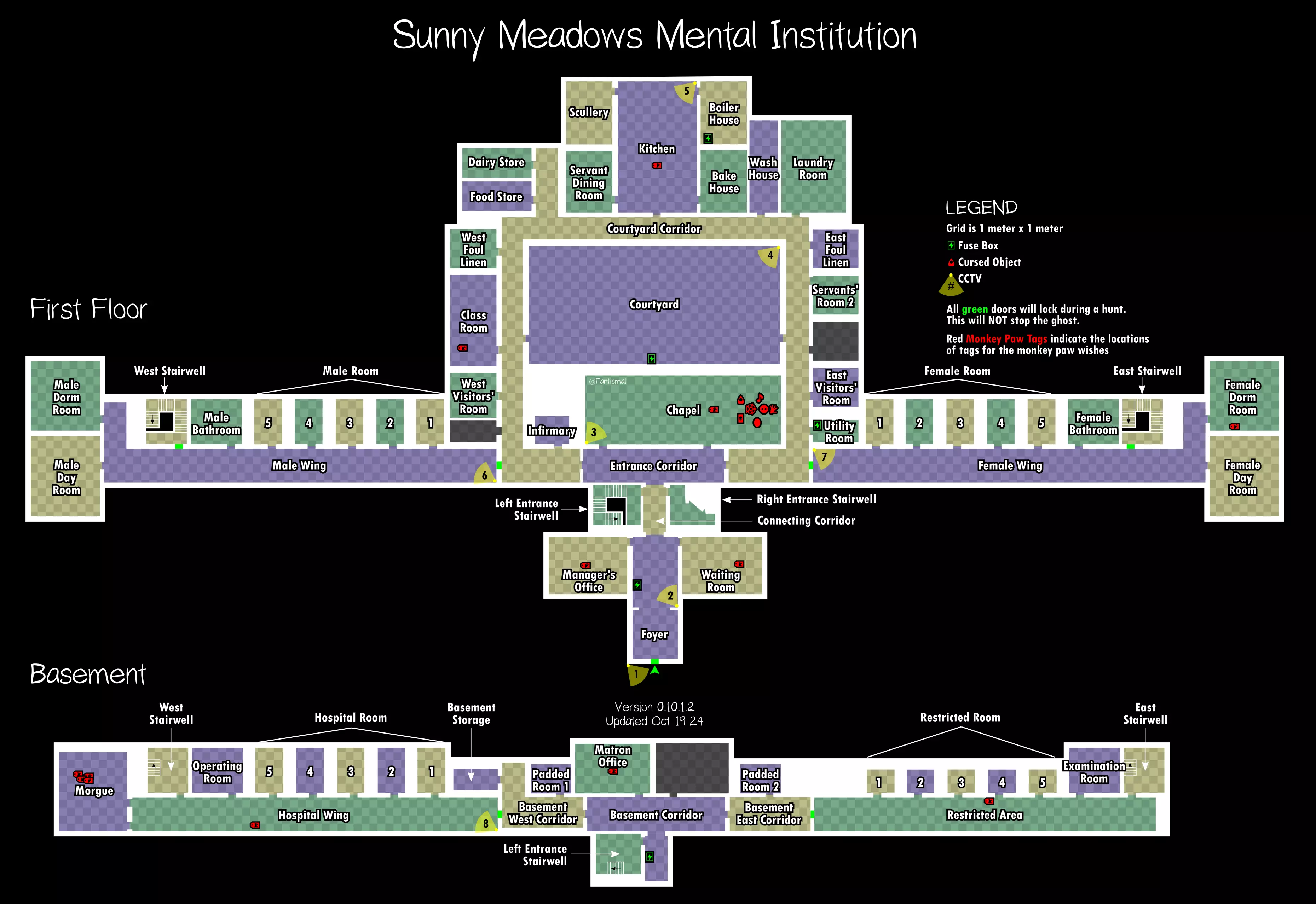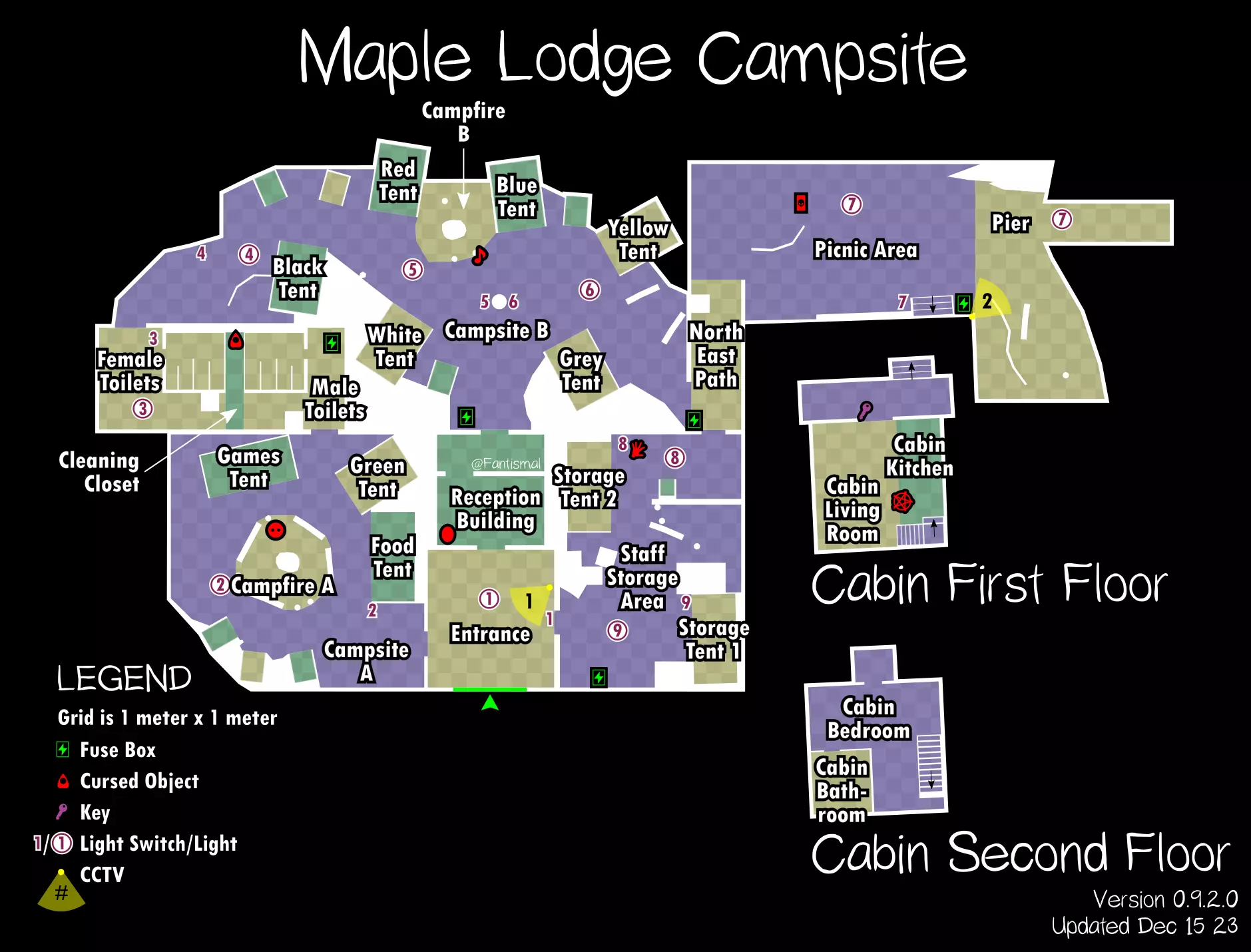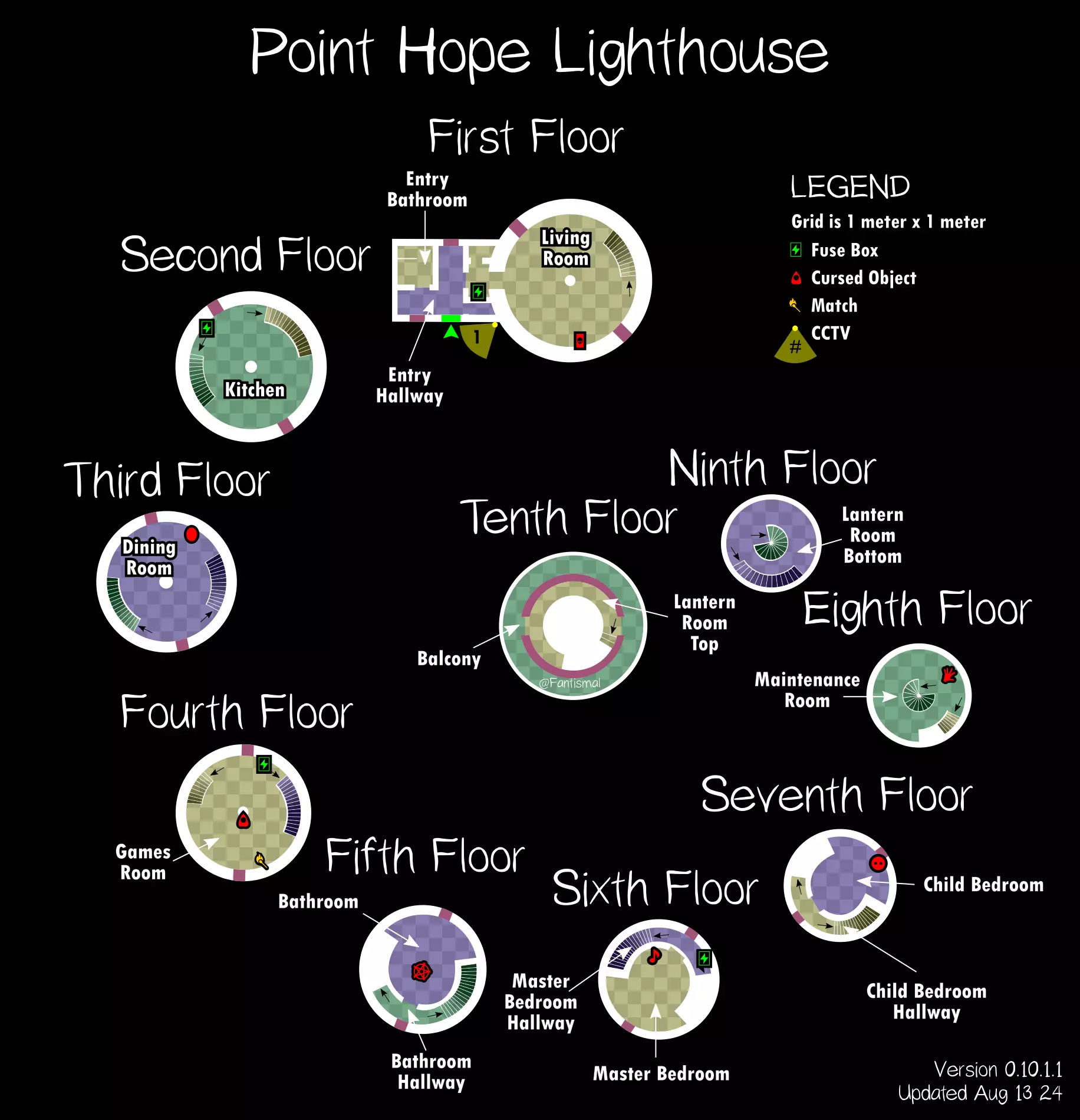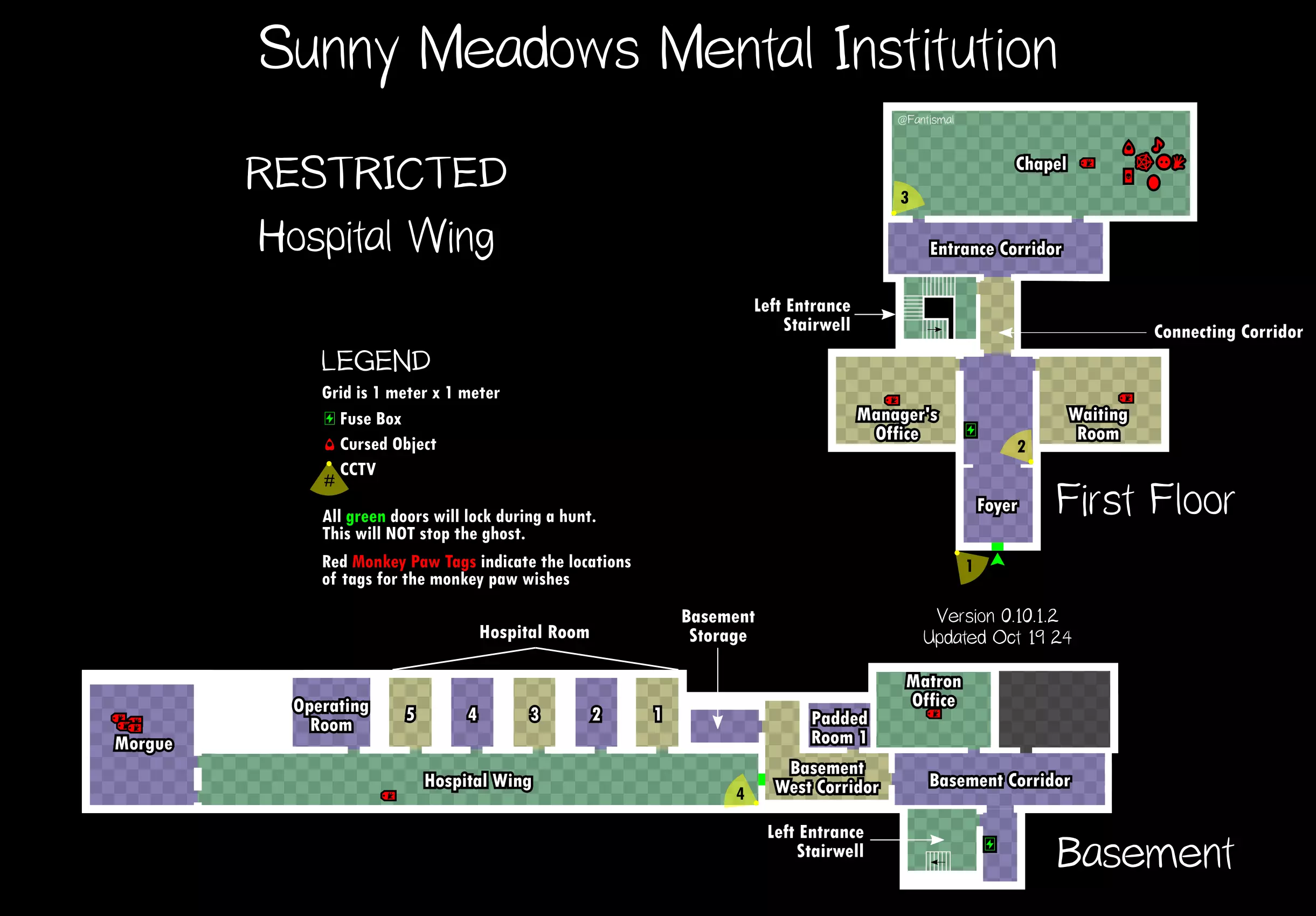 倒吊人 - 立即杀死你(1%概率) 笔记: 愚者卡牌在狩猎期间会覆盖其他任何卡牌效果。 未使用的女祭司卡牌不会叠加效果。 所有诅咒物品提示: 每局游戏只会生成一个诅咒物品。 使用任何诅咒物品后,其他诅咒物品将失效。 诅咒狩猎持续时间更长,且会跳过准备阶段。 使用任何物品前请检查理智值! 地图布局(社区制作) 玩家自制的《恐鬼症》所有官方地图可视化布局——有助于导航、诅咒物品刷新点、电闸位置确定和计划制定。 6号唐格伍德大道