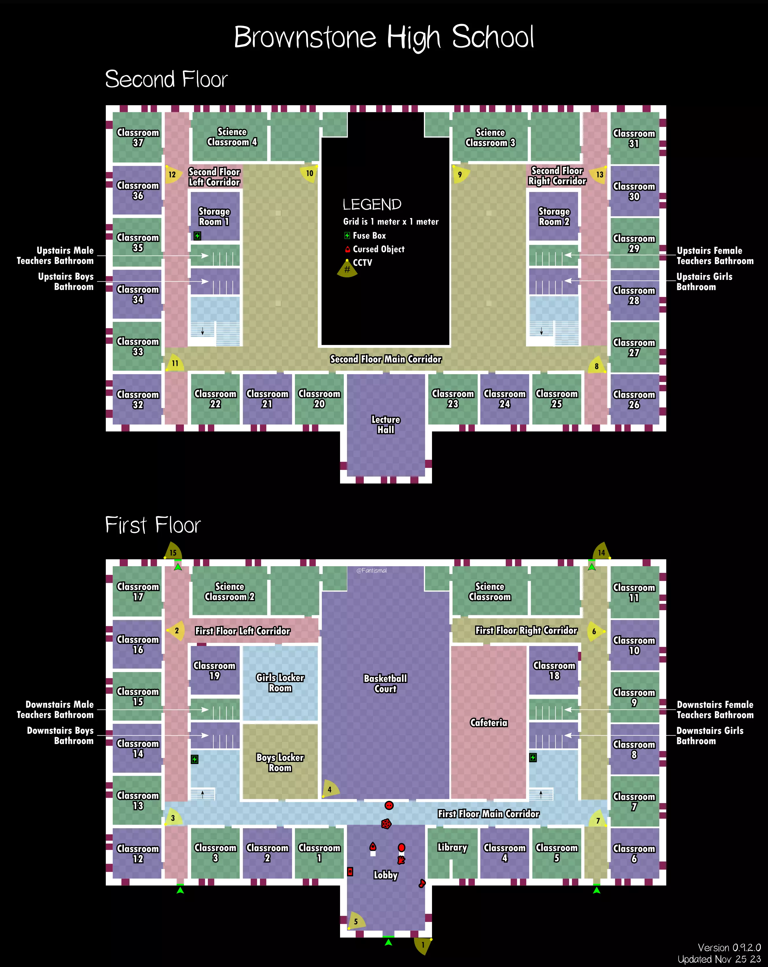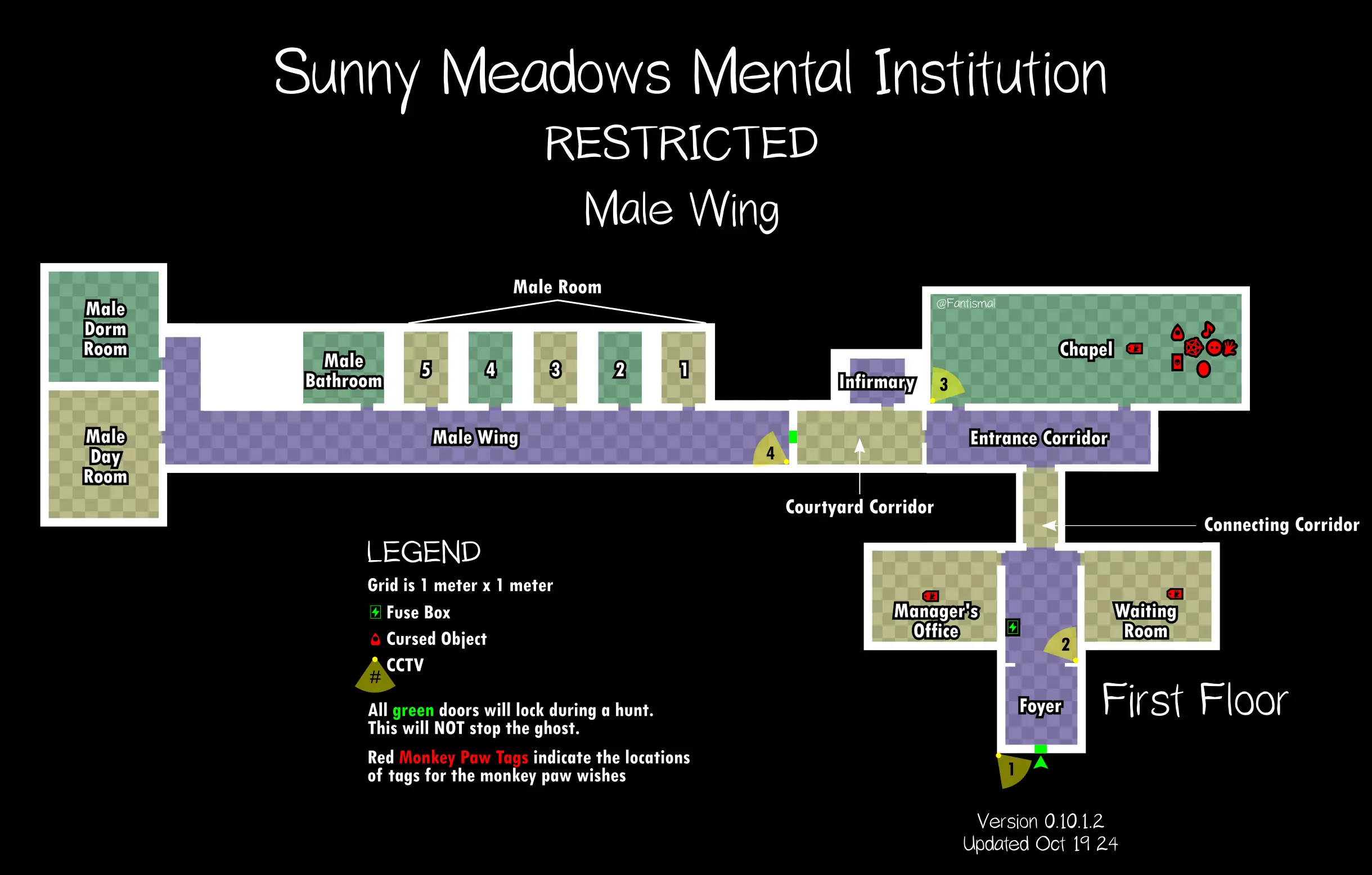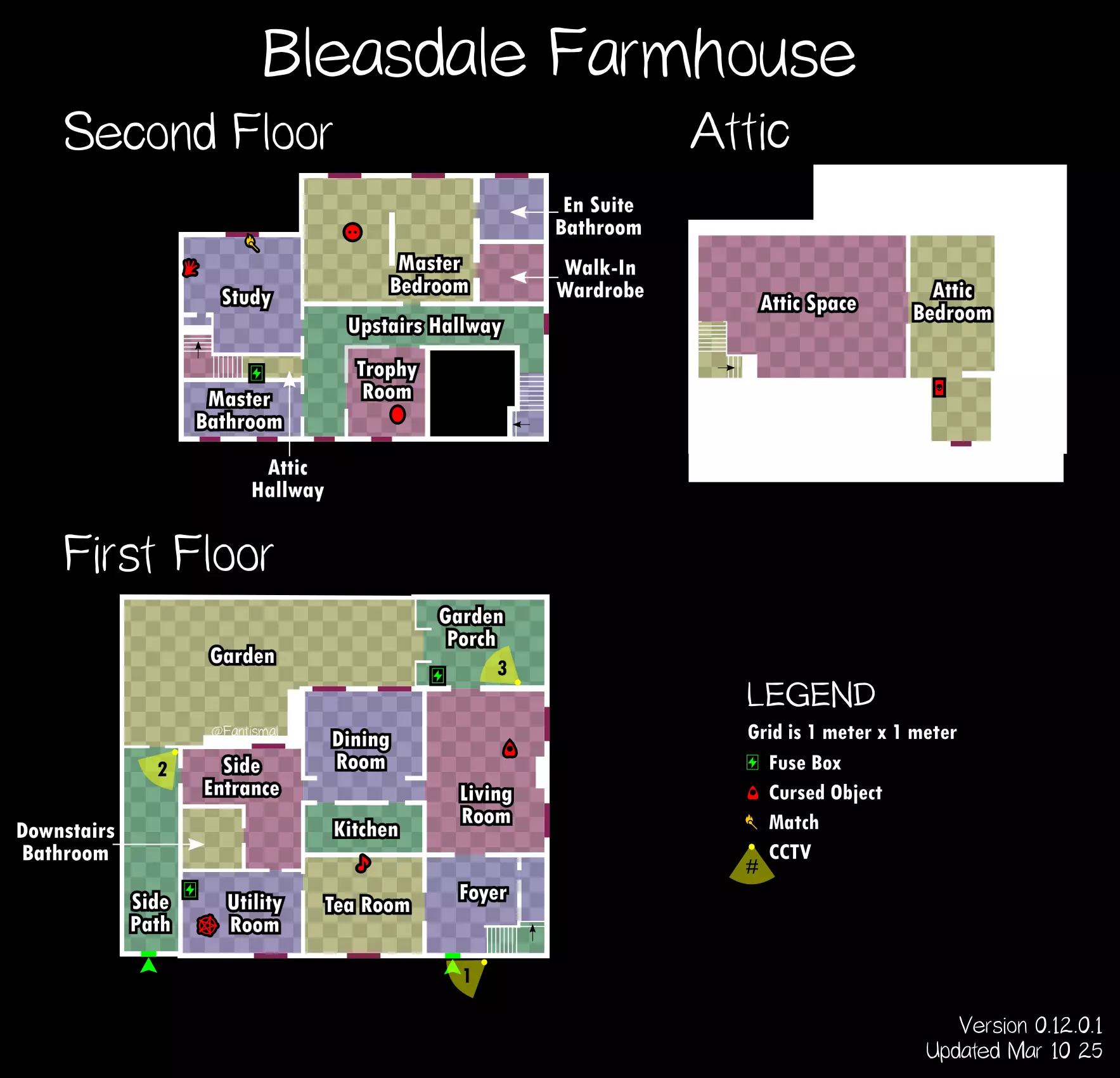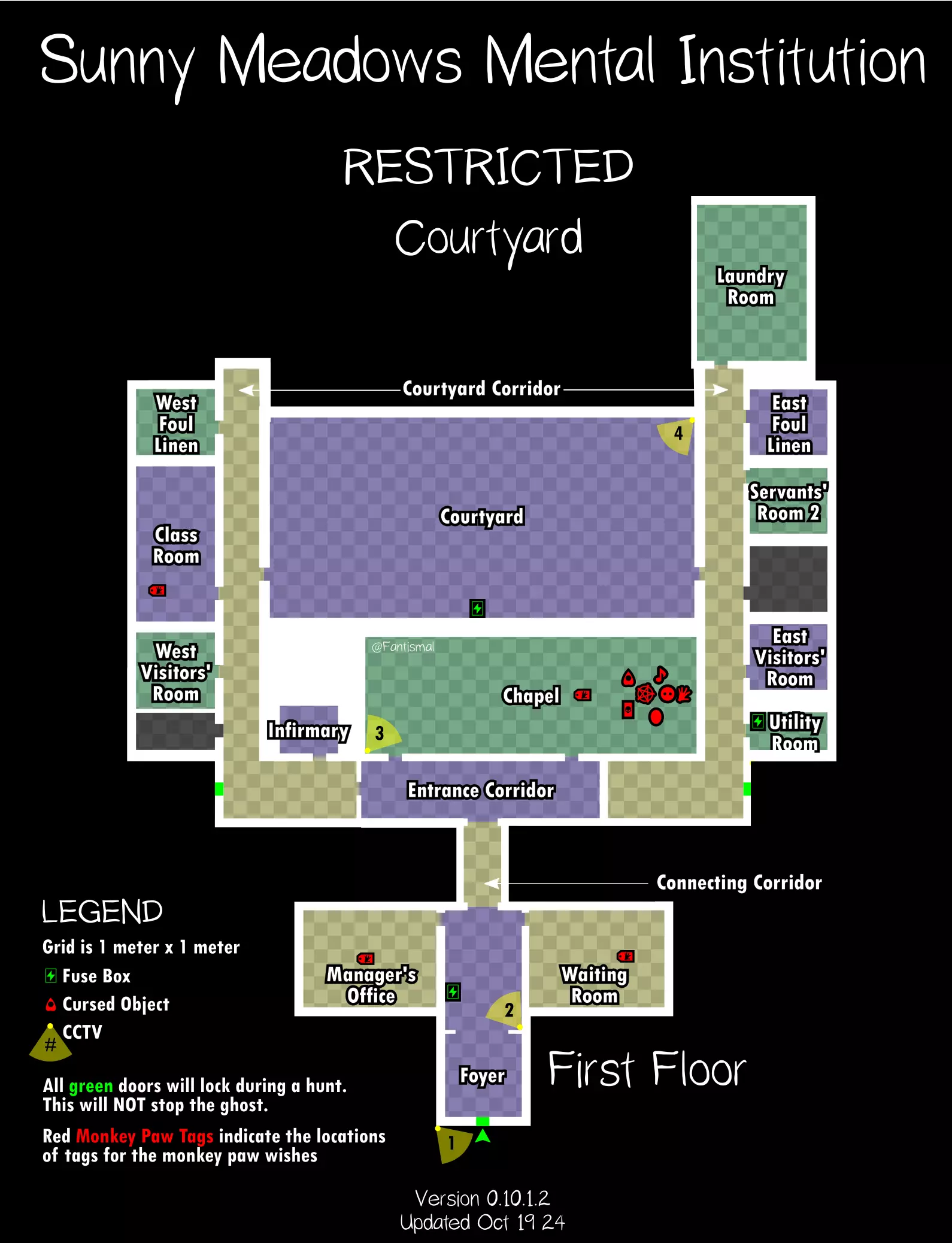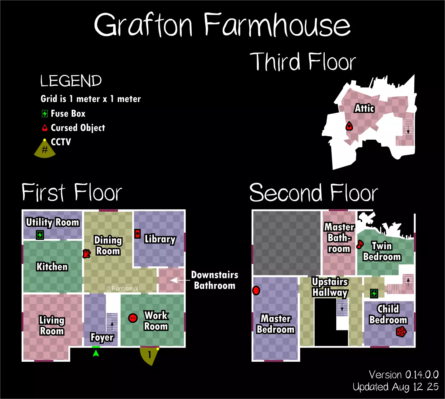倒吊人 - 立即杀死你(1%概率) 笔记: 愚者卡牌在狩猎期间会覆盖其他任何卡牌效果。 未使用的女祭司卡牌不会叠加效果。 所有诅咒物品提示: 每局游戏只会生成一个诅咒物品。 使用任何诅咒物品后,其他诅咒物品将失效。 诅咒狩猎持续时间更长,且会跳过准备阶段。 使用任何物品前请检查理智值! 地图布局(社区制作) 玩家自制的《恐鬼症》所有官方地图可视化布局——有助于导航、诅咒物品刷新点、电闸位置确定和计划制定。 6号唐格伍德大道