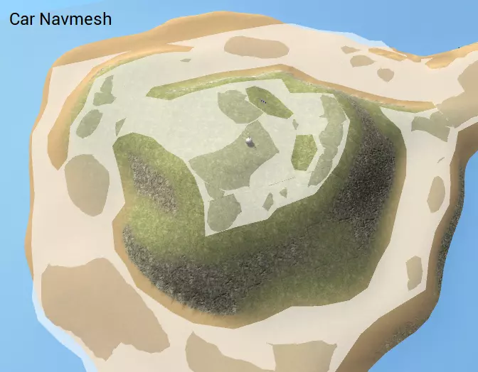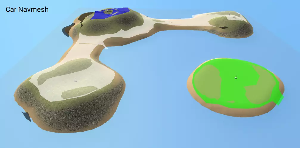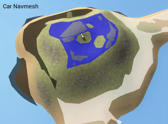 这张截图展示了生成的步兵导航网格。注意可以看到两个导航网格表面,一个白色,一个蓝色。它们颜色不同意味着AI无法从一个表面走到另一个表面——在这种情况下这是合理的,因为它们是两个不同的岛屿。通过按左右箭头键,我们可以查看其他生成的导航网格。这是生成的车辆导航网格。