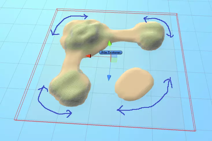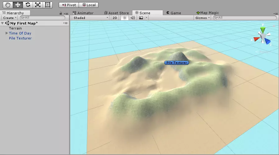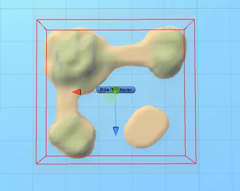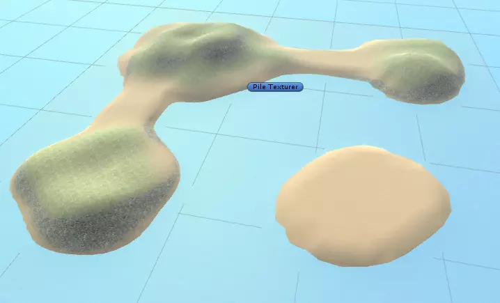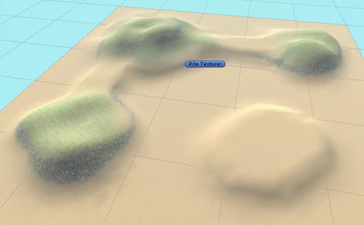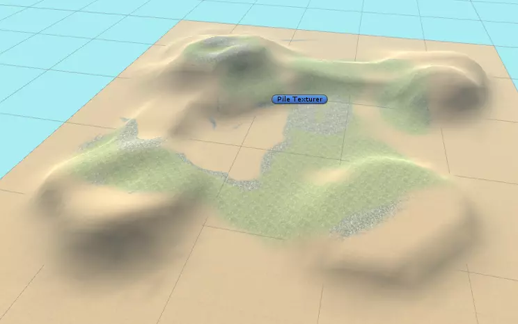 你会注意到我没有更改地形的纹理,这可以让【Pile Texturer】对象来帮我们完成。要使用它,选择【Pile Texturer】对象,然后在检查器视图中点击【Apply Texture】按钮。这就是操作后的结果: