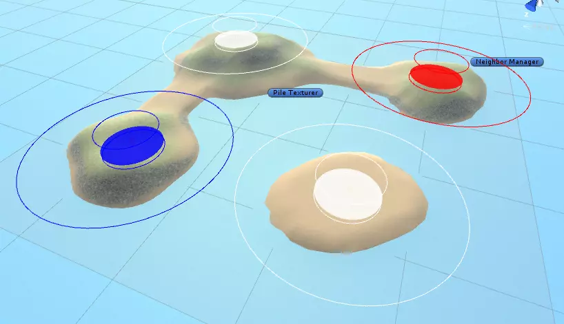 最后,我们要添加一个【邻居管理器】,其位置在Prefabs/Map Elements/Must Haves/Neighbor Manager。AI会使用邻居管理器来确定从何处攻击哪个旗帜。你可以通过在检查器的Neighbors列表中添加元素来在邻居管理器中设置连接。每个连接需要两个占领点,你还可以指定连接是通过陆地、水域还是两者皆可。连接将在场景中显示为粉色线条,根据连接类型还会带有绿色或蓝色的球。这些线条能让你看到地图的整体布局。 这是我使用的邻居管理器设置: