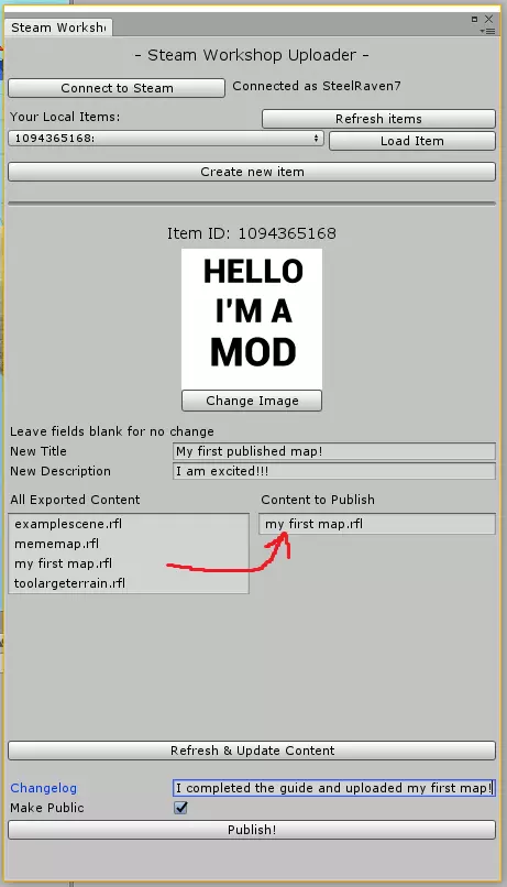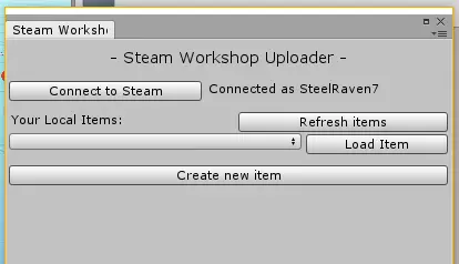发布至Steam创意工坊 您是否有想要与全世界分享的地图?太好了,这正是Steam创意工坊的用途! 发布至Steam创意工坊前,您需要完成以下步骤: 1. 确保您最近运行过【路径扫描】,以保证导航网格缓存是最新的! 2. 运行【路径扫描】后导出地图,确保最新的导航网格缓存已与地图捆绑。 3. 确保Steam在后台运行,且您已登录自己的Steam账户。 4. 确保您没有在后台运行《战地模拟器》。 5. 准备一张512x512分辨率的.png图片作为炫酷图标,用于展示您的地图或地图合集!确保该图片大小不超过2MB! 准备好发布了吗?首先,通过点击“Ravenfield工具->发布至Steam创意工坊”打开Steam创意工坊发布窗口。点击“连接”以将上传器与Steam连接。如果连接成功,窗口应显示为类似以下的状态。