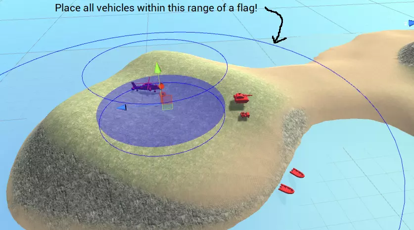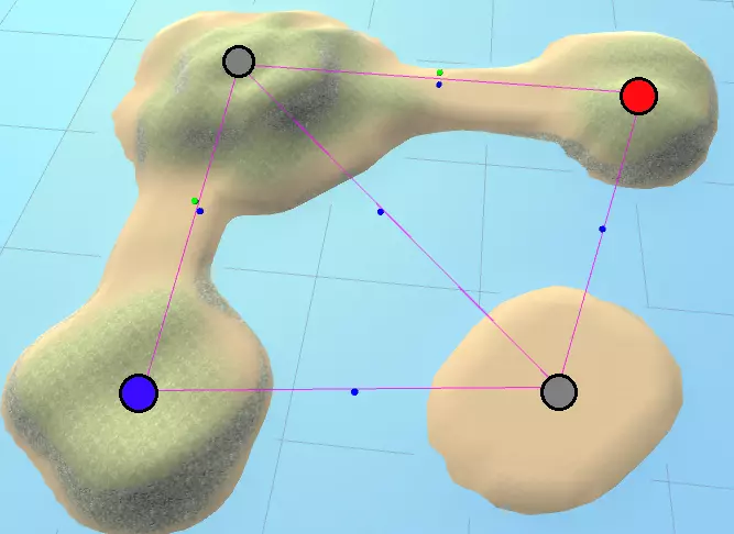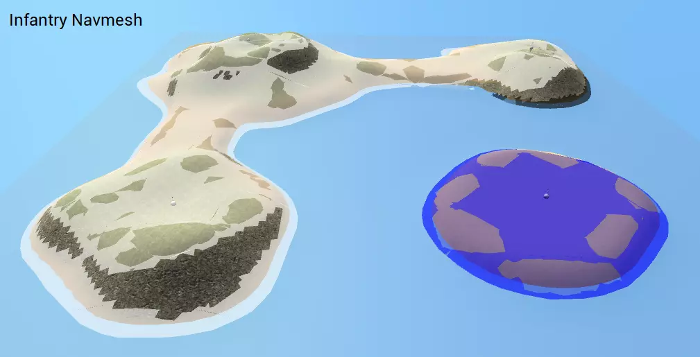 太好了!海洋不再是黑色的了,这意味着AI可以抵达那里!我们还能看到两个船只生成器被可视化为球体,以及它们与海洋的连接方式。有关船只生成器如何连接海洋的更多信息,请参阅【深度寻路】部分。 最后,你可以选择放置【登陆区】预制件(位于Prefabs/Map Elements/Landing Zone),以帮助AI找到运输船靠岸的位置。默认情况下,进攻的AI小队会将船尽可能停靠在目标【占领点】附近,但这并非总是最佳策略。例如,当在红色主基地点靠岸时,最近的登陆点可能会被悬崖阻挡。