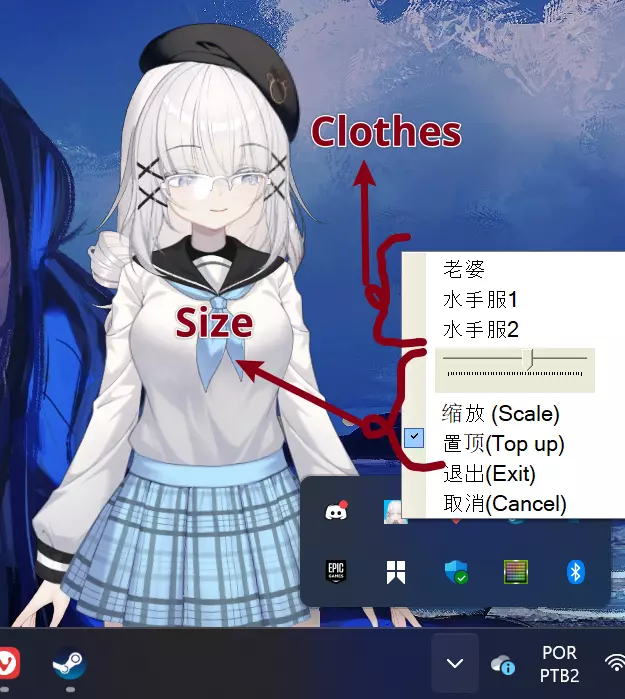 注意:她也应该能在游戏中正常运行,如果不行,请按照“妻子调整”部分检查她的设置,如果仍然不行,可以尝试上述图片或以下步骤。 我曾经遇到过屏幕显示为黑色或其他颜色背景的情况,然后我采用了IT领域的基础解决方法,结果如你所见,问题解决了。 如果对你不起作用,可以尝试以下“妻子调整”步骤: 按住鼠标左键点击她,然后使用滚轮改变她的大小。 你也可以右键点击(如下图所示)任务栏右下角她的面板,在那里你可以手动调整她的大小并更换衣服。(感谢Chaco提供此信息)额外说明:勾选【置顶】选项可使该应用保持在其他应用/游戏等上方,取消勾选则不会始终显示。您也可以点击【退出】来关闭应用。