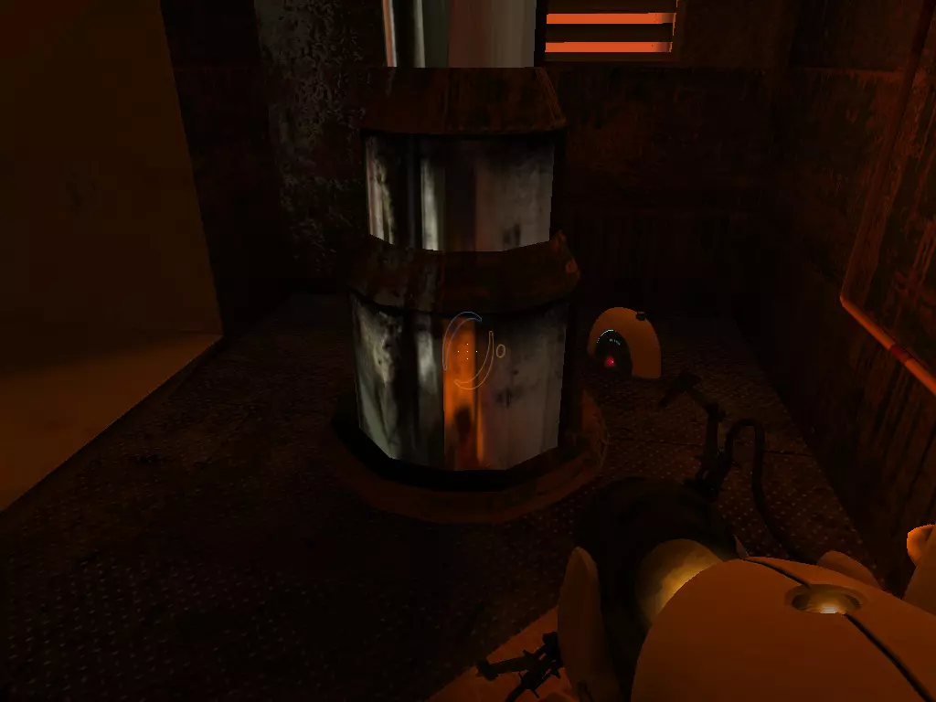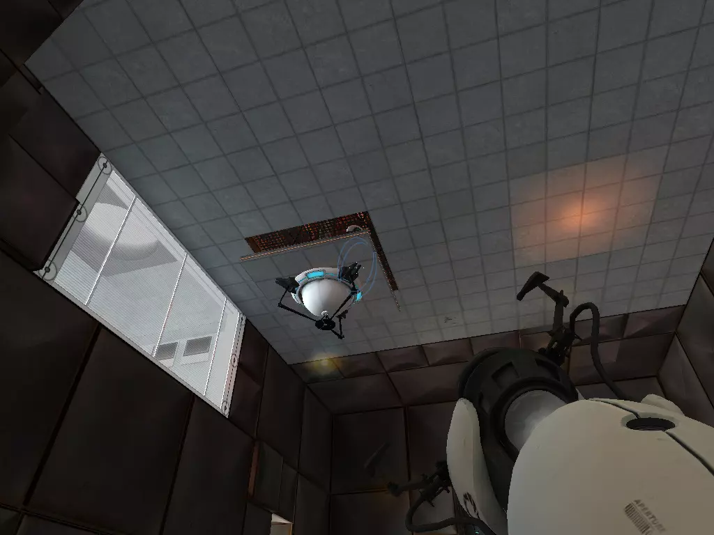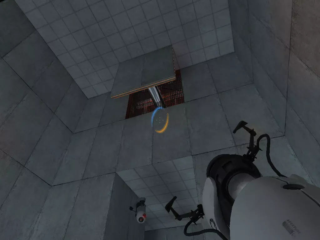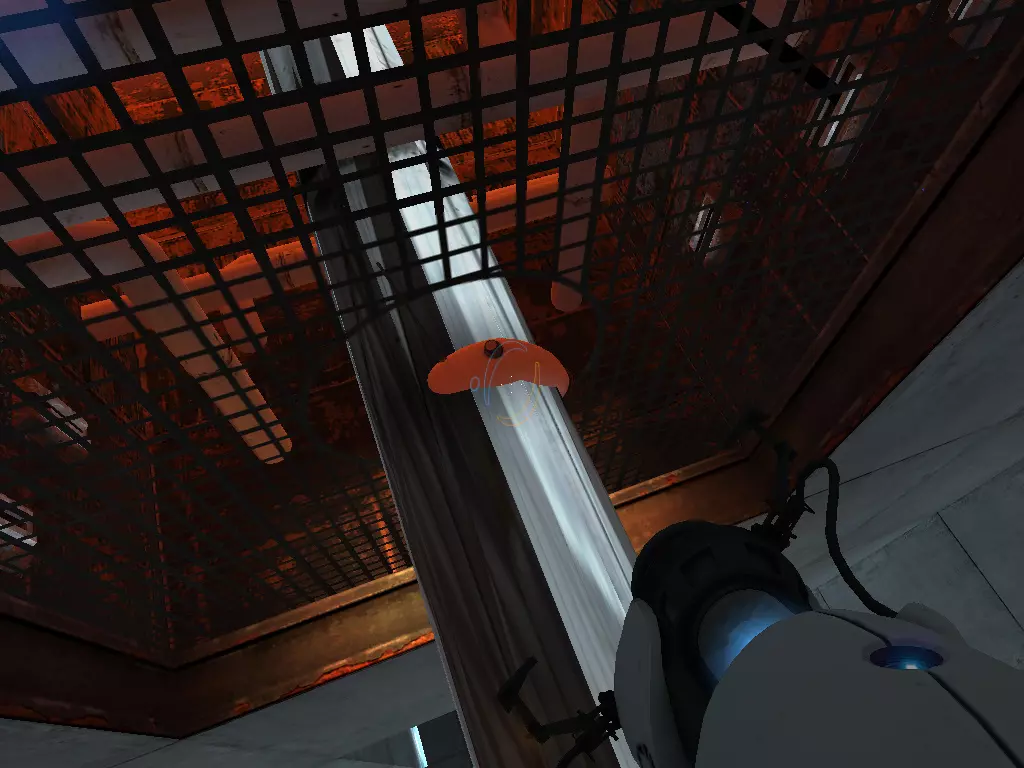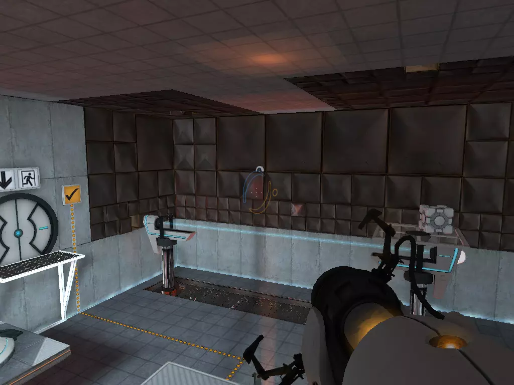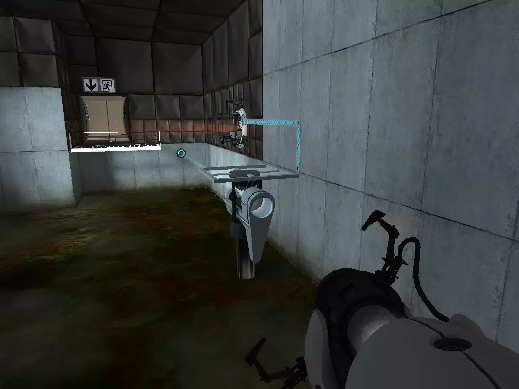 在到达火箭炮塔之前,我们从下方继续前进。这条短途路径的尽头有一个带活塞平台的小房间。玩过《传送门:序曲》的玩家肯定记得这个房间。我们可以在那里接收到信号。