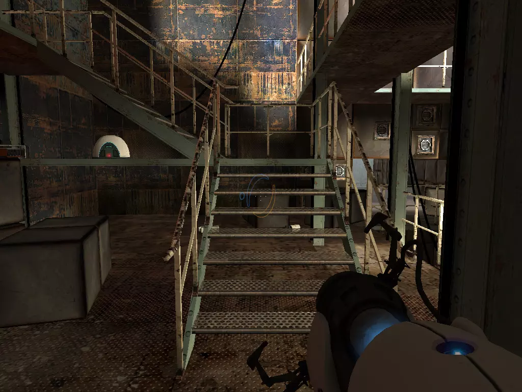 工作区域 [24/26] 我们要在这里拿这个接收器。对着这个楼梯用传送门射击,然后从那里拿走收音机。