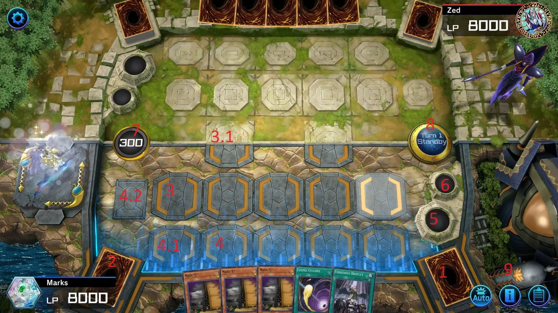 1 -> 这里是你的主卡组。 2 -> 这里是你的额外卡组。融合怪兽、同调怪兽、超量怪兽和连接怪兽都放在这里。 3 -> 这个区域以及与它同一行的其他所有区域都是主要怪兽区域。 3.1 -> 这里是额外怪兽区域。从额外卡组召唤怪兽时,如果该区域未被占用,你可以选择将其放置在这里。注意,额外怪兽区域只有2个,并且它们将场地从中间分开。这是因为你和对手都可以随时使用其中任意一个区域,但每次只能使用一个。如果你已经在其中一个区域放置了怪兽,就不能在另一个区域召唤怪兽了。4 -> 这一整排下方区域是你的魔法卡和陷阱卡区域。 4.1 -> 此区域以及同一行最右侧的区域为灵摆区域。你仍可以在此区域正常发动魔法卡和陷阱卡,但如果要发动灵摆效果,则必须将灵摆卡放置在此区域。 4.2 -> 此区域是场地魔法卡的专用区域。每方场上只能同时有1张场地魔法卡表侧表示存在。如果你已经有一张场地魔法卡,并且想要发动另一张,新的场地魔法卡会替换当前的场地魔法卡,被替换的场地魔法卡将送入墓地。 5 -> 说到墓地,它位于这里。当你需要丢弃卡牌或你的卡牌被破坏时,卡牌会进入墓地。理解墓地中的卡牌并不一定意味着它们已脱离游戏这一点非常重要。存在多种与墓地中卡牌互动的方式,因此要密切留意对手送入墓地的卡牌。 6 -> 这里是【除外区】(Banish Pile)。与墓地类似。进入这里的卡牌并未脱离游戏,但要回收被除外的卡牌难度大得多,甚至有些卡组在重要卡牌被除外后就会输掉比赛。所以如果你想让对手陷入困境,就应该将他们的卡牌送入这里。 7 -> 这是你的回合剩余时间(以秒为单位)。如果时间归0,你将输掉决斗。8 -> 此按钮显示当前决斗处于第几回合以及每回合的阶段变化。点击该按钮会打开一个窗口,显示在你的回合中可以进入哪些阶段。 9 -> 这3个按钮非常重要。标有“AUTO”的按钮用于设置游戏询问效果触发的时机。它有3种模式:自动、开启和关闭。自动模式下,游戏会在对手行动触发效果时常规性询问你是否要发动效果;开启模式下,游戏会对所有行动(包括你自己的行动)都进行询问;关闭模式下,游戏将停止询问,直到你再次切换为自动或开启模式。推荐且默认设置为自动模式。中间按钮会显示场上的各种详情,右键为游戏记录。 4 - 回合阶段 点击右侧场地中间的按钮(第3部分,第8点)后,会打开以下窗口: