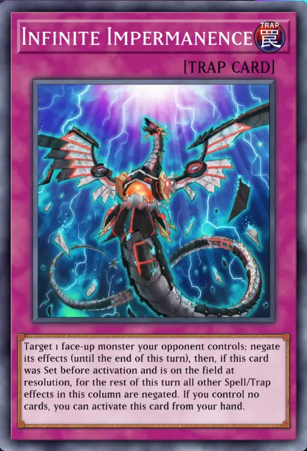 陷阱卡的卡片以淡粉色为主色调,名称旁有陷阱符号,并且在插图正上方标有关键词【陷阱卡】。 【无限泡影】的效果是无效1只怪兽的效果,但它还有一个额外效果:如果它是在盖放后被翻开才发动的,那么它会无效自身所在纵列的所有魔法卡和陷阱卡,要注意纵列是垂直方向的,而行是水平方向的。 它还拥有一个替代发动条件,即当你场上没有卡片时,可以直接从手牌发动它,无需先盖放并等待1回合才能使用,但这样会失去无效纵列的额外效果。Imperm是游戏中最优秀的陷阱卡之一,你肯定会经常见到它。 2 -> 现在来说说永续陷阱卡: