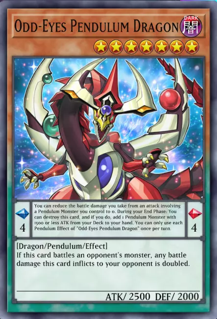你应该已经注意到这张“杰作”——我是说,这张卡牌里包含了多少内容了。总之…… 灵摆怪兽可以像其他怪兽一样被召唤。但请注意以下几点:灵摆怪兽可以是上述任何一种类型。没错,存在同时也是灵摆怪兽的融合怪兽、同调怪兽等等。要区分它们,只需记住灵摆怪兽的底部总是绿色的。另一个非常重要的点是,灵摆怪兽有两个文本框和两个箭头,一个蓝色一个红色,箭头下方各有一个数字。 较小的文本框是它的灵摆效果。只有当灵摆怪兽被放置在灵摆区域(第3节,第4.1 topic)时,才能使用这个效果。 蓝色和红色的箭头被称为灵摆刻度。它们正下方的数字是进行灵摆召唤的等级限制。我们首先来关注这里作为示例的特定怪兽。 异色眼灵摆龙是暗属性、7星的灵摆龙族怪兽,和其他所有灵摆怪兽一样,它的文本框中有关键词“灵摆”,以强调它确实是灵摆怪兽。 好的,我们来看效果。首先是灵摆效果: 1 -> 异色眼的第一个灵摆效果是,你可以将你用自己的灵摆怪兽进行战斗时受到的任何伤害减少至0。 2 -> 第二个效果是,在你的结束阶段,你可以破坏异色眼灵摆龙,并从你的卡组将1只攻击力1500或以下的灵摆怪兽加入手牌。两种效果每回合都只能使用一次,且【必须处于灵摆区域】才能使用。 现在来看它的怪兽效果: 1 -> 这里简单来说,异色眼对对手怪兽造成的任何伤害都会翻倍。 灵摆怪兽确实不简单。大家再坚持一下,我们马上就讲完了。 接下来是最后一种怪兽类型。 8 -> 我们终于讲到连接怪兽了。