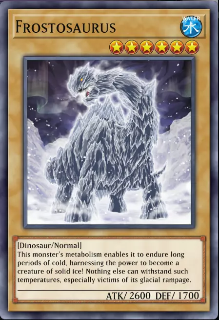 像这类普通怪兽没有效果,卡片边缘呈黄色。不过有几个要点需要注意: - 卡片右上角、名称旁边的蓝色符号是属性。游戏中共有7种属性,而我的老朋友冰霜龙属于水属性。 - 卡片名称和插图之间的星星代表等级。由于冰霜龙有6颗星星,所以它是6级怪兽。 - 由于普通怪兽没有任何效果,在其文本框中只需关注关键词(即写在方括号[]中的内容)。冰霜龙的关键词是Dinosaur和Normal,这意味着它是一只普通恐龙族怪兽。 很简单吧?我们继续下一个。这位年轻女性是一只拥有效果的怪兽【效果怪兽】