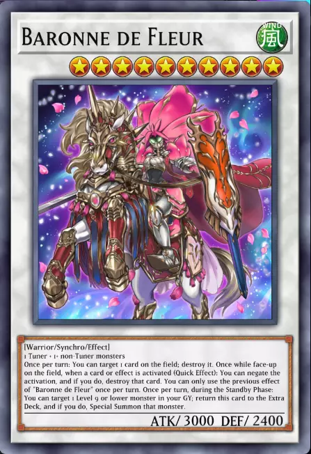 鲜花女男爵是游戏中最优秀的同调怪兽之一,下面来看看她的效果: 1. 第一个效果非常直接:选择场上任意一张卡并将其破坏。 2. 第二个效果是一个速攻效果,当有卡发动时,你可以直接无效其发动并破坏被无效的卡。需要注意的是,这个效果在她在场时只能使用一次,也就是说,如果你想再次使用这个效果,需要将鲜花女男爵从场上移除后重新召唤。 3. 第三个效果有助于实现这一点,它的效果是在准备阶段,你可以选择自己墓地中一只等级9或以下的怪兽,将鲜花女男爵返回额外卡组,然后召唤选择的那只怪兽。男爵是一张泛用性很高的卡牌,你在对局中肯定会经常见到它,而且你也会想把它加入自己的卡组。 之后我会在第5节中更详细地说明如何召唤这里提到的每种类型的怪兽。 6 -> 这个厉害的家伙是XYZ怪兽(Xyz Monster)。