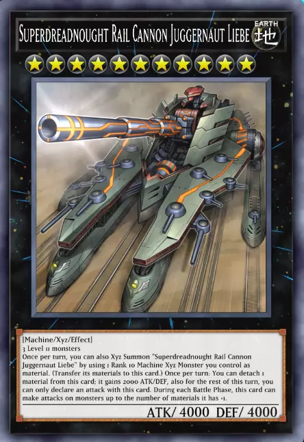XYZ怪兽的卡片边框为黑色,其文本框中有关键词【XYZ】。它们也拥有类型和属性,但现在卡片上的星星不再代表等级。XYZ怪兽的星星被称为阶级。这点要特别注意。 我们这里的例子,即“Juggernaut Liebe”,是一只地属性、阶级11的机械族XYZ怪兽。 和融合怪兽、同调怪兽一样,它会注明召唤所需的素材,这里需要3只11星怪兽。 “Juggernaut Liebe”通常在想要一次性造成大量伤害以通过攻击直接获胜时被召唤。但它具体有什么效果呢?1.首先,它为我们提供了一种特殊召唤条件,即如果你的场上有1只10阶机械族XYZ怪兽,你可以仅用那1只怪兽来召唤它,而无需原本要求的3只11星怪兽。 2.它的第二个效果是,当你取除1个用于召唤它的素材时,它的攻击力会上升2000,但在此回合你只能用它进行攻击。 3.最后,它可以进行的攻击次数等于其素材数量加1,也就是说,这张卡至少能进行2次攻击。 稍后我会解释XYZ怪兽的“取除素材”是如何运作的。目前我们先专注于仅通过外观来区分不同类型的卡片。下一个要介绍的怪兽需要多花一点注意力。 7 -> 这里我们有一个臭名昭著的【摇摆怪兽】(Pendulum Monster)