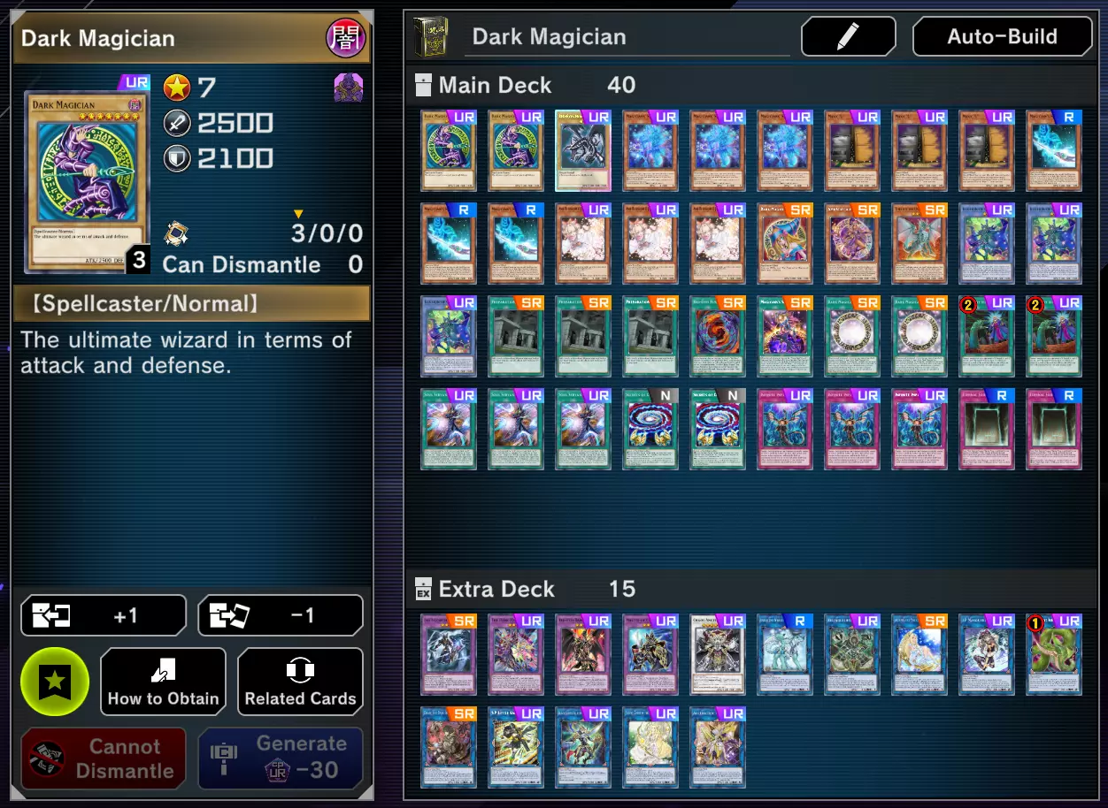 电子龙在对手场上是唯一拥有怪兽的情况下,可以从手牌对自身进行特殊召唤。此召唤无需消耗或解放。 以下所有召唤方式均视为特殊召唤: 3.仪式召唤: 如前所述,进行仪式召唤需要有具备仪式召唤效果的卡片。此外,还需要解放等级总和与想要召唤的仪式怪兽等级相等的怪兽。 4.融合召唤: 与仪式召唤类似,进行融合召唤需要有具备融合效果的卡片,以及进行融合所需的怪兽。需要注意的是,融合怪兽会被放置在额外卡组中,也就是说,不需要将它们手牌中就能进行召唤。 5 -> 同步召唤: 同步召唤需要场上至少有两只怪兽:一只调整怪兽和一只非调整怪兽,且它们的等级之和等于你想要召唤的同步怪兽的等级。当满足同步召唤的条件时,你的额外卡组会发出黄色光芒,表明可以从那里召唤怪兽。 6 -> 超量召唤: 超量召唤需要场上有两只等级相同的怪兽。和同步召唤一样,当满足召唤条件时,额外卡组会发光。 需要强调的是,用于召唤超量怪兽的素材怪兽在召唤后会被叠放在超量怪兽下方作为超量素材。这是因为XYZ怪兽通过解放自身的一个素材来获得效果。 7 -> 灵摆召唤: 在灵摆区域放置两个刻度不同的灵摆怪兽后,即可进行灵摆召唤。灵摆召唤可以从手牌或额外卡组中召唤表侧表示的怪兽。 在示例中,我使用了刻度4和刻度9的灵摆怪兽,因此可以灵摆召唤等级5、6、7、8的怪兽。 和通常召唤一样,每回合只能进行一次灵摆召唤。 8 -> 连接召唤: 当你要召唤的怪兽的连接数值等于场上的怪兽数量时,可以进行连接召唤,但有一些附加条件。例如,一个连接-3怪兽可能需要2只或更多怪兽来召唤,但你如何只用2只怪兽召唤连接-3呢?很简单,使用1只连接-2怪兽和任意1只其他怪兽。 和同调怪兽以及超量怪兽一样,当从额外卡组召唤连接怪兽时,额外卡组会发光。 连接怪兽必须先召唤到额外怪兽区域,后续的连接怪兽可以召唤到前一个连接怪兽箭头所指向的区域。连接怪兽的红色箭头总是指向某个区域,如果该区域被占用,你必须使用占用该区域的怪兽来召唤连接怪兽。 7 - 卡组构筑 现在让我们来组建卡组。 如前所述,卡组分为两部分:主卡组和额外卡组。主卡组的卡牌数量在40到60张之间,额外卡组的卡牌数量在0到15张之间。 组卡时需要牢记一件非常重要的事:卡组的稳定性。 我来详细说明一下。 这是我基于经典的黑魔术师构建的卡组,它尽可能追求竞技性,以便能与当前环境中的主流卡组抗衡。