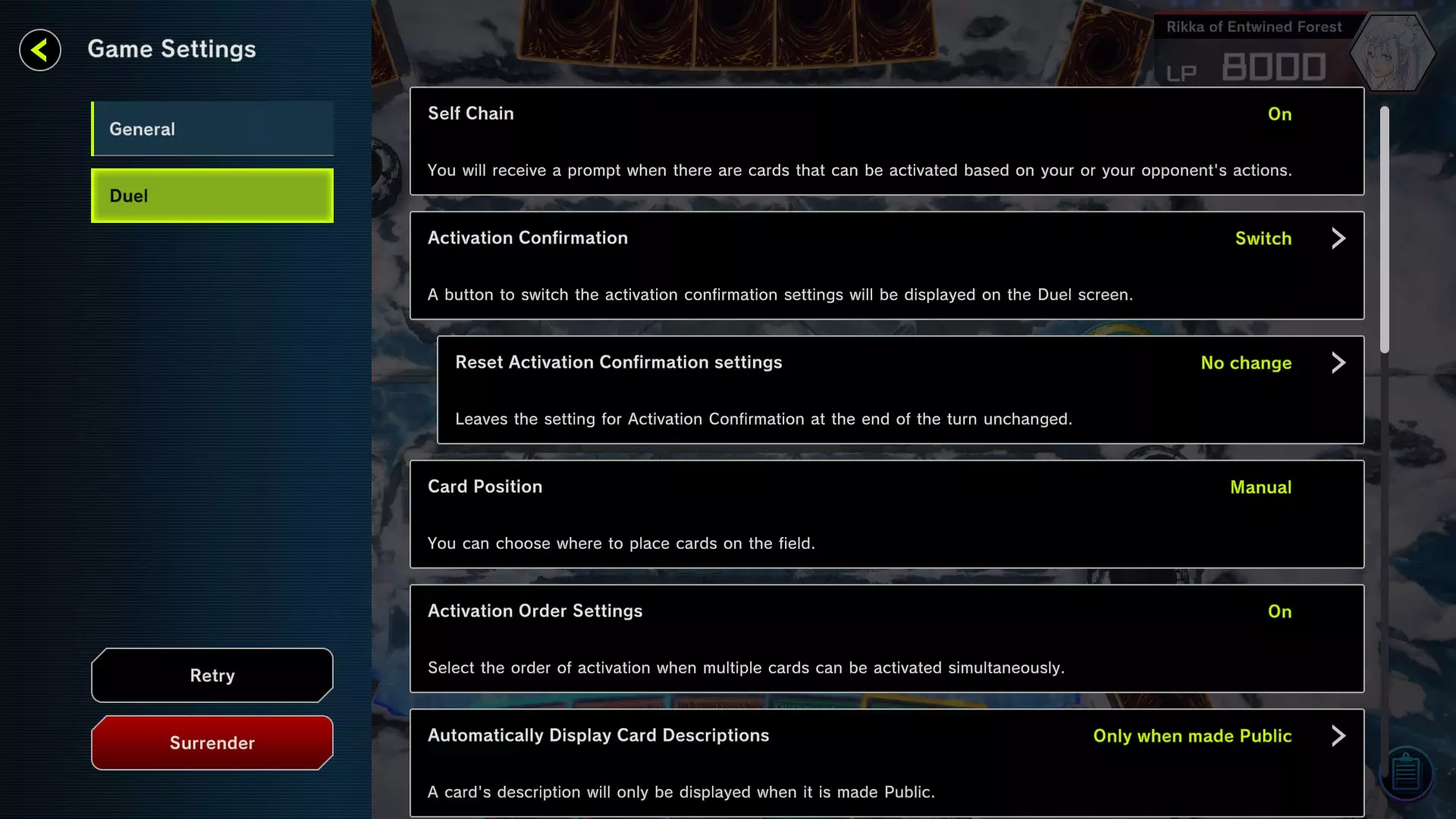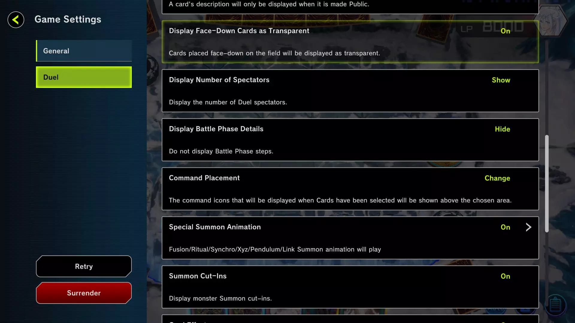 2 - 游戏设置 以下是我使用的设置,我认为这些设置更直观,并且在决斗时不会过多占用游戏屏幕空间。 游戏语言我选择英语,因为我不太喜欢卡牌的葡萄牙语翻译,而且有些文本翻译后可能会占用卡牌文本框更多空间。所以如果你对语言没有问题,建议保持英语设置。