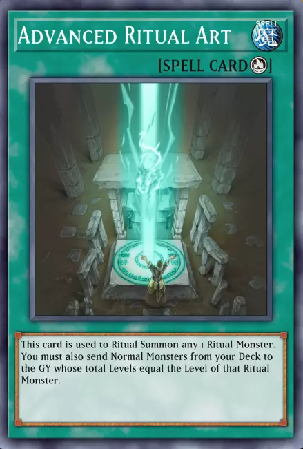 仪式魔法在其关键词旁有一个类似火焰的小符号。它们仅用于召唤仪式怪兽,但如前所述,它们可以被其他同样具有仪式召唤效果的卡片替代,不过在以仪式为主题的卡组中,你肯定会看到其中之一。 高等仪式术允许你将卡组中的通常怪兽送入墓地,以召唤手牌中的仪式怪兽。仅此而已。 让我们来看最后一种魔法卡。 6 -> 我最喜欢的场地魔法卡: