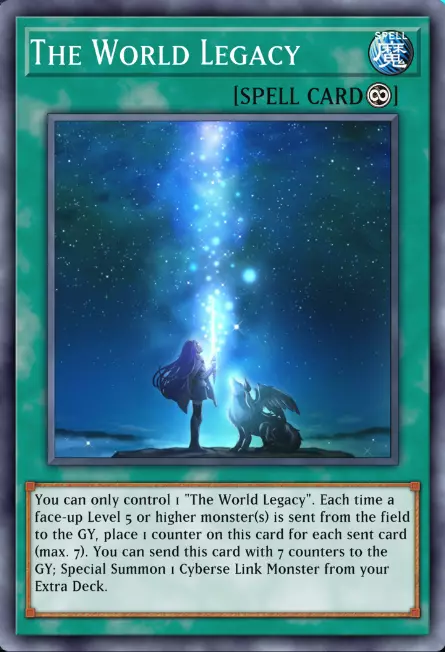 这里她的关键词中带有无限符号,以证明她确实是永续的。但永续到底是什么意思呢?永续魔法在发动后会一直留在场上,直到以某种方式被移除。 世界遗产具有以下效果:每当有5星或以上的怪兽从场上被送去墓地时,你就在它上面放置一个指示物。当有7个指示物时,你可以将其送去墓地,从额外卡组特殊召唤1只电子界族连接怪兽。 5 -> 现在来说说仪式魔法: