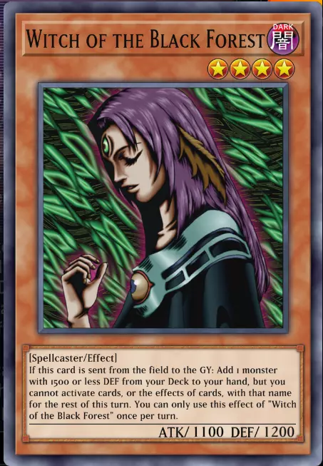 带有效果的怪兽卡周围有橙色边框,其文本框中会有“效果”(Effect)关键词,并且和普通怪兽一样,它们也拥有属性、种族和等级。《黑森林的魔女》是一张暗属性、4星、魔法师族的怪兽卡。 现在我们来试着理解它的效果。《游戏王》需要你具备良好的文本解读能力,所以务必逐句仔细阅读。我们开始吧: - 首先它写着:当此卡从场上被送去墓地时:。看到这两个冒号就先停下来。注意标点符号很重要,能避免混淆。所以第一点,它的效果发动有一个条件:它必须以某种方式从【场上】被送去【墓地】。- 第二部分内容为:从卡组将1只守备力1500或以下的怪兽加入手牌。简单来说,当她从场上送入墓地时,你可以从卡组选择任意1只守备力1500或以下的怪兽加入手牌。 - 第三部分内容为:这个回合的剩余时间内,不能发动那张卡的效果,也不能发动同名卡的效果。简单来说,这里的意思是你刚加入手牌的那只怪兽不能发动其效果,其他同名怪兽也一样,但你仍然可以召唤它。 - 最后一部分内容为:【黑森林的魔女】的这个效果1回合只能使用1次。这就是所谓的“Hard Once Per Turn(每回合只能使用一次)”。稍后我会详细解释这意味着什么,但基本上如果你使用一次她的效果,就必须等到下一个回合才能再次使用。其他复制体也是如此。这是什么意思呢?如果你在同一回合将多张黑森林的魔女送入墓地,只有1张会触发效果。所以要特别注意这一点。 3 -> 第三类是仪式怪兽。