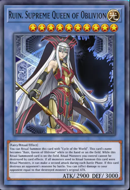 仪式怪兽的特点是边缘呈浅蓝色,并且在文本框中带有“仪式”关键词。它们的特殊之处在于必须先通过仪式召唤来进行召唤。 和之前的两种怪兽一样,它也拥有属性、等级和类型。【破灭之女神 露茵】是光属性、10级的仪式·天使族怪兽。 和之前一样,我们试着将它的效果分成几个部分来分析,慢慢阅读并在每个要点处停顿。 - 首先它提到你可以通过使用【世界循环】这张卡进行仪式召唤来召唤它。注意它说的是“你可以……”,也就是说你可以使用这张卡来召唤它,但并非必须使用这张卡。她提到这张卡是因为它是她的仪式标准卡,但其他具有仪式召唤效果的卡也可以召唤它。 - 接下来是它的实际效果: 1. 它在手牌或场上时,名称变更为【遗忘女王 露茵】。 2. 当它通过仪式召唤方式特殊召唤成功时,你所有的仪式怪兽不会被效果破坏。 3. 如果用于仪式召唤它的祭品全部是其他仪式怪兽,那么它在每个战斗阶段可以攻击两次。 4. 如果它通过战斗破坏了对手的怪兽:你可以给予对手等同于被破坏怪兽原本攻击力的伤害。 好了,看到了吧?没那么难。不必因为卡片文本框里有几行小字就感到害怕。正如我所说,只要从容阅读并注意标点,你就会发现没什么大不了的。像我这样将卡片效果分成几个要点,有助于阅读,也能让卡片不那么令人疲倦和困惑。 4 -> 接下来是很多人的最爱——融合怪兽(Fusion Monster)。