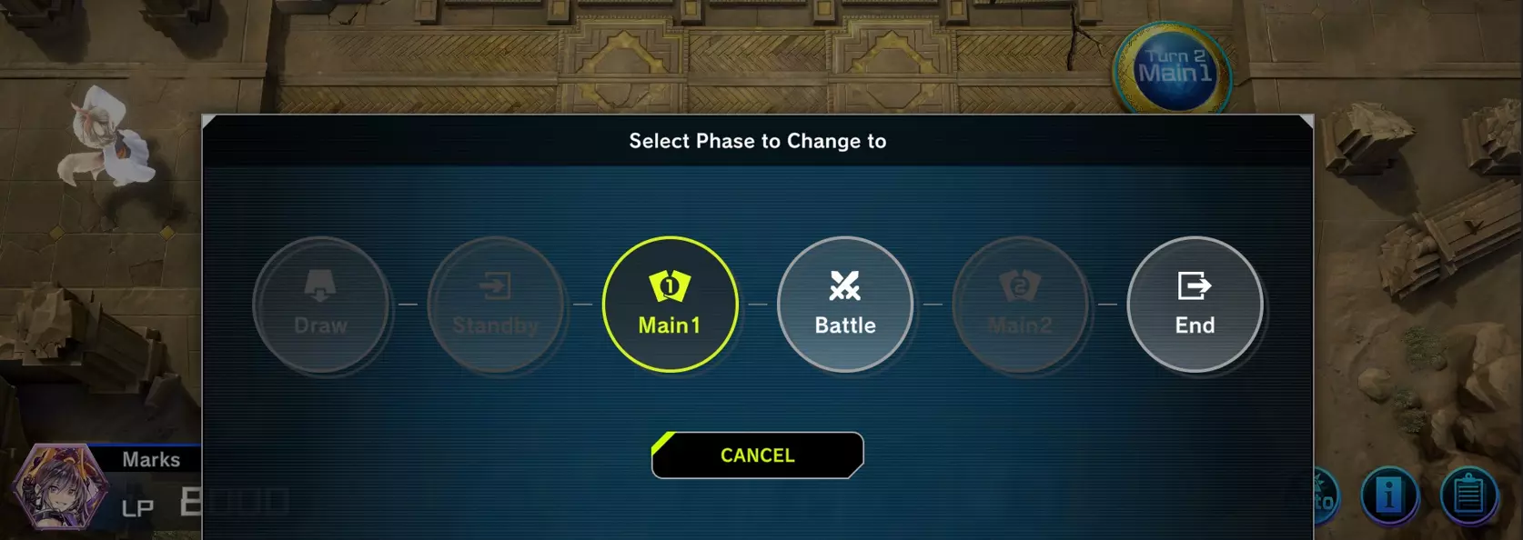 这是你可以用你的怪兽进行攻击并造成最大伤害的阶段。进入战斗阶段不需要场上有怪兽,同样你也不必强制进行攻击。 场上的每只怪兽在战斗阶段都有权进行一次攻击,你可以选择用哪只怪兽进行攻击,也可以选择攻击目标,但你无法选择用哪只怪兽进行防御。 如果有玩家场上没有怪兽,就可以对其生命值进行直接攻击,所以在场上没有怪兽的情况下结束回合时要非常小心。需要注意的是,第一回合无法进行攻击,因此即使对手召唤的怪兽攻击力超过你的生命值承受范围,你也将有机会在第二回合进行反击。主阶段2: