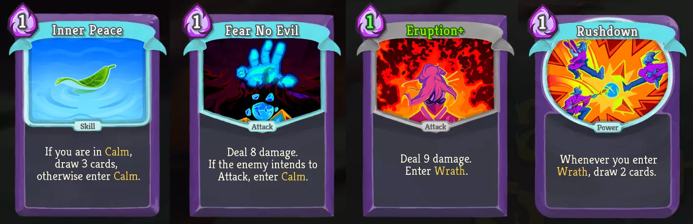 Strategy during combat 1.Place Rushdown 2.Enter calm via Blue 3.Enter wrath via Red, which will give you 2 energy via calm’s effect but also let you draw 2 cards due to Rushdown’s ability 4.Repeat steps 2-3: if you trimmed your deck sufficiently, the 2 cards you draw will be always be Blue and Red, so you can use the 2 energy you gained to enter calm (cost 1 energy) and then wrath (cost 1 energy) again, which will again give you 2 energy and draw Blue and Red again, thus triggering an infinite cycle of switching between stances. Since your Red card deals damage, you can use this infinite cycle to defeat enemies in one turn. Do note that if you use Fear No Evil as your Blue card, you can only trigger infinity on turns when your enemy is on attack mode. Strategy outside combat When you first start a run, I recommend choosing the route with the most shops along its path so that you can spend your coins on removing cards and obtaining the necessary cards for this deck if they show up on stock. The path with the most events (?) should be prioritized next as sometimes these events can offer options to remove cards from your deck or add cards you’re looking for. It is highly important you upgrade the Eruption card at a rest site as soon as possible because not only is it necessary for the infinite deck, it also helps a lot even if you deck isn’t infinite yet. Eruption+ cost 1 energy less than its non-upgraded version, meaning you will always net 1 extra energy whenever you use it to enter wrath stance (-1 energy) from a calm stance (+2 energy). This +1 positive energy differential helps a lot in defeating enemies when you're still working on making your deck infinite. Overall, the ultimate goal is to trim your deck as much as possible, upgrade Eruption and find the cards Rushdown and Inner Peace/Fear No Evil as soon as possible. Optional cards, relics and potions The following are unnecessary but are helpful for complementing this infinite deck: - Violet Lotus relic[slay-the-spire.fandom.com]: a boss relic that lets you gain an extra energy whenever exiting calm stance i.e. you get 3 energy instead of the usual 2. This means you will net 2 extra energy every time you use Eruption+ (-1 energy) to enter wrath stance from a calm stance (+3 energy). Thus, you no longer require Inner Peace or Fear No Evil (one-energy cost cards) as you can use the starting card Vigilante (two-energy cost card) for your Blue card instead. - Empty Cage relic[slay-the-spire.fandom.com]: a boss relic that allows you to remove 2 cards from your deck, which is helpful in trimming your deck - Runic Pyramid relic[slay-the-spire.fandom.com]: a boss relic that allows you to keep unused cards at the end of your turn, which is helpful for reaching infinity faster as well as reducing the number of card removals required for infinity - Scrawl card[slay-the-spire.fandom.com]: a skill card that lets you draw cards until your hand becomes full (10 cards), which is also helpful for reaching infinity faster as well as reducing the number of card removals required for infinity The following are especially useful in the fight against the Corrupt Heart (see next section below): - Medical Kit relic[slay-the-spire.fandom.com]: a shop relic that lets you play and exhaust status cards - Swift potion[slay-the-spire.fandom.com]: a potion that lets you draw 3 cards - Ornamental Fan relic[slay-the-spire.fandom.com]: an uncommon relic that gives 4 block every time you play 3 attack cards in a single turn - The Abacus relic[slay-the-spire.fandom.com]: a shop relic that grants 6 block whenever you shuffle your deck - Mental Fortress card[slay-the-spire.fandom.com]: a power card that provides 4 block every time you change stance - Talk to the Hand card[slay-the-spire.fandom.com]: an attack card that gives 2 block every time you attack the enemy you targeted this card with Hard counters The following bosses have hard counters to this infinite deck: - Time-Eater[slay-the-spire.fandom.com]: this Act 3 boss only lets you play up to 12 cards every turn, which means you can’t kill him in one turn with this infinite deck. In this case, keep attacking with the Blue-Red combo and make sure you play Blue as your 12th card. This ensures that you will end your turn in calm stance, meaning you won’t receive double damage if he's on attack mode and you can immediately enter wrath next turn. You can use Vigilance for defense if he’s going to attack you, but keep an eye on your energy level as it isn’t energy neutral to use a two-energy cost card as your Blue card unless you have the Violet Lotus relic. If you still have any Strike cards left, you can use them for more damage while in wrath stance as you approach your 12th card. - Corrupt Heart[slay-the-spire.fandom.com]: this optional Act 4 boss can only take a certain number of damage each turn so you can’t kill him in one turn with this infinite deck. You will also receive damage every time you play a card and he will always add 5 status cards to your deck on turn 1 which you will draw during turn 2. The Medical Kit relic is a great counter for the statuses as it lets you play and exhaust these status cards, while the Swift potion lets you draw 3 cards and enables you to use the infinite combo attack in turn 2 if you trimmed your deck to 4 cards or less. For defense, you can use the Vigilance card/Violet Lotus relic combo, the Ornamental Fan relic, the Abacus relic, the Mental Fortress card or the Talk to the Hand card. Achievements The following achievements can be easily obtained from using this deck: