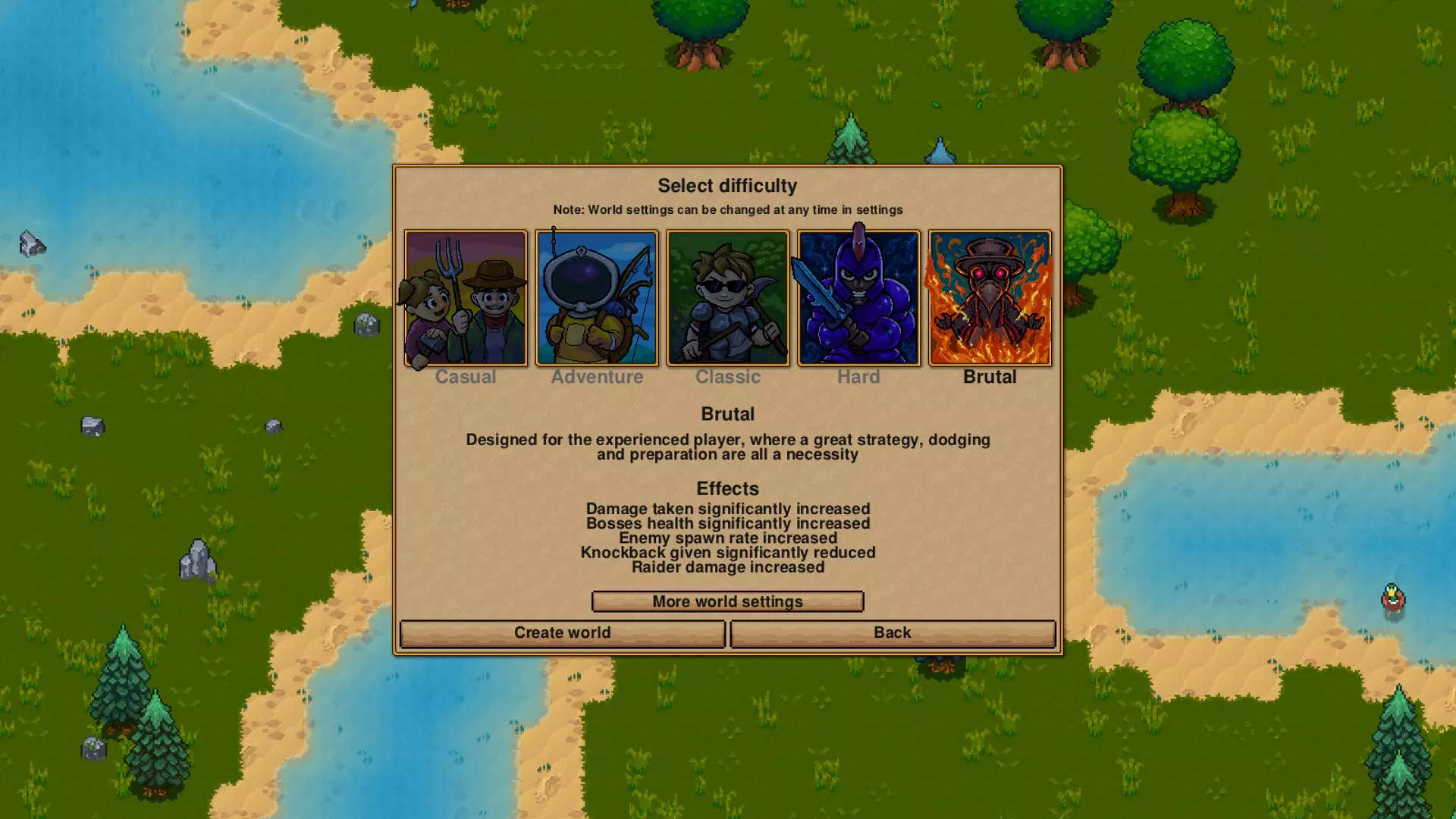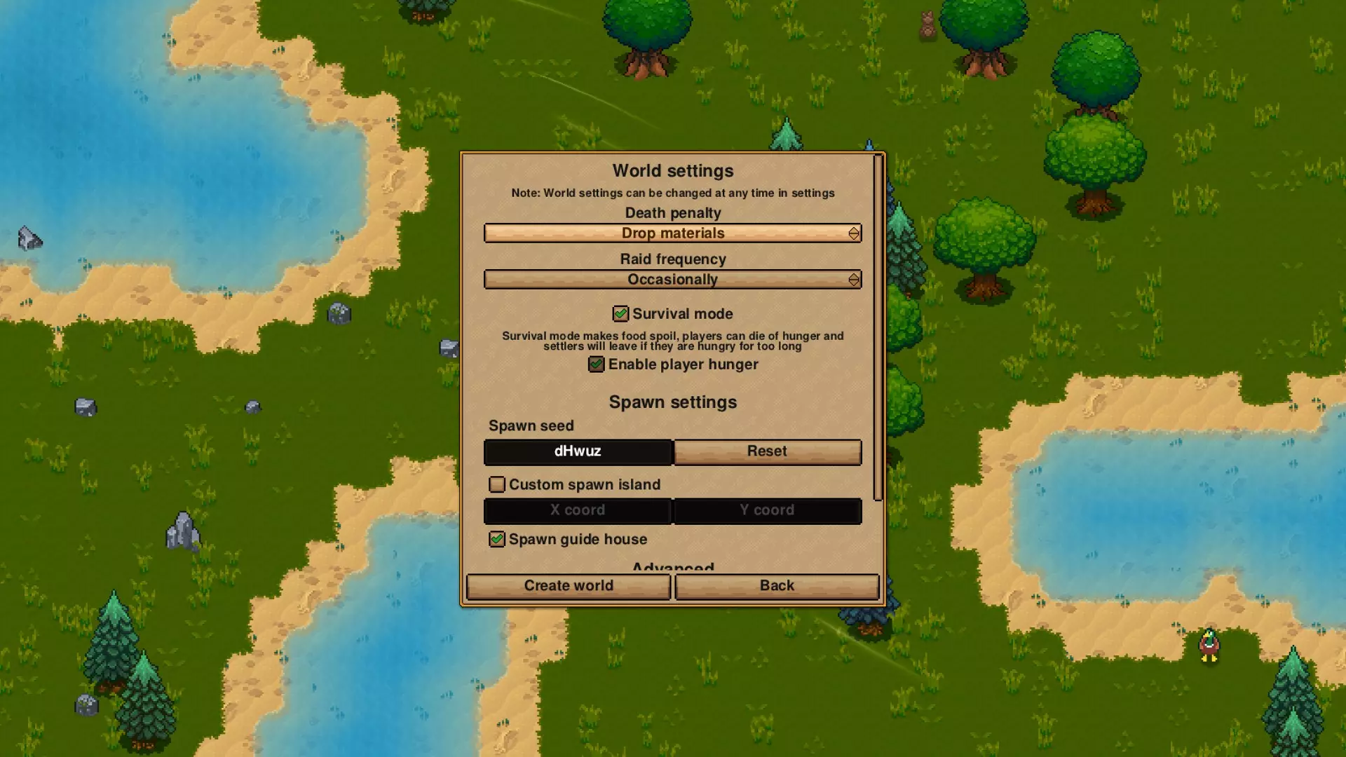 要残暴一点!绝对要……开玩笑的,我开玩笑呢,我可没胆子试这个,我还是选最简单的选项。 另外注意,有个小按钮可以调整更多设置,比如袭击的生成频率,还有食物方面的担忧程度! 如果你选择不生成引导屋,长老还是会和你一起出现,只是看起来会有点迷茫。