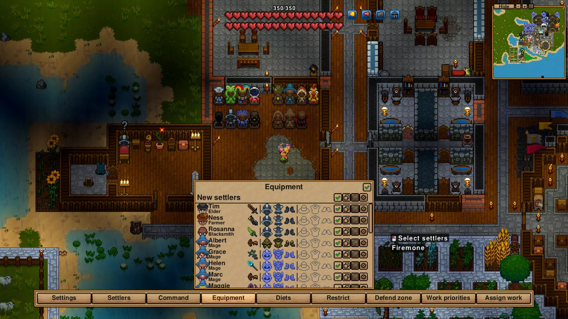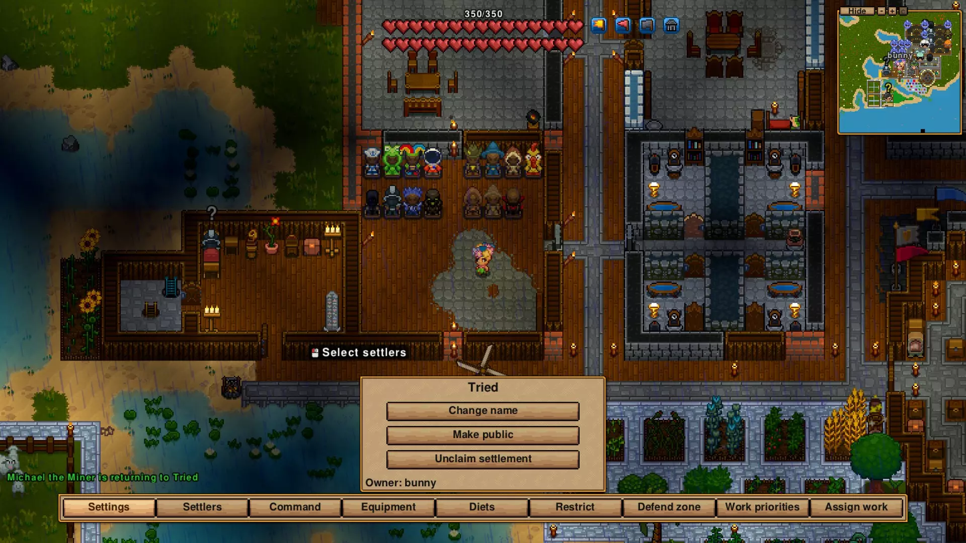 你可以告诉他们诸如农田需要施肥、树木需要砍伐和重新种植、动物需要照料以及数量过多时进行屠宰、箱子自动填充,还有物品自动制作等区域相关的事情。 我不确定这个世界是否有餐厅,这是我的疏忽……定居者们喜欢坐下来放松。 此外,他们喜欢食物,让所有作物生长并让他们在厨房制作食物会让他们非常开心,因为他们可以吃到各种各样的饭菜,想吃什么就吃什么。 除非你的食物不会腐烂,否则你可能需要一个冷却器。 游戏中有布线、大门、陷阱、按钮和其他东西,除了“home alone”成就外,我还没有接触过这些内容。这部分内容可能值得单独讲解,但现在只能给你提供这些信息。 【C键】对你的城镇很重要!默认用于调整聚落的按键是字母“C”,为什么呢?我也不清楚,难道是因为C代表饼干,而这对我来说就足够了?毕竟,饼干确实挺好吃的,对吧? 除非你像我刚开始玩时那样,在世界设置中勾选了村民无论如何都会留下的选项,否则你需要让村民保持开心。但我还没看到任何指南能完全解释清楚这意味着什么。这是我首先去查找的内容,因为我的村民抱怨6*4的房间太小了。 不过,就算他们抱怨房间小,只要生活中的其他方面都很棒,他们的幸福感仍然可以达到100。 哦,对了,如果他们的幸福感达到10,你就能获得【CLOUD NINE】成就。 在之前的指南里,我已经解释过我是如何建造他们的房间的。我喜欢用同一系列的家具,而且天哪,集齐地下城材料的完整堆叠太容易了(除了浴室用品,不知为何巫师领域里的如厕地点不多)。你可以制作家具,但我很懒,我的箱子里几乎装满了同一种木材,却既不自己动手制作,也不吩咐手下用这些木材做东西。 不过,人们不仅需要卧室,他们会勉强共用房间,但床越多,抱怨就越多。而且他们需要食物,还希望饮食多样化。他们喜欢套餐,这意味着你可能得尽快制作一口锅,因为在能制作烹饪站之前,同时拥有烤肉叉和锅,就能制作多种食物了。让村民进行制作会比你自己制作花费更多时间(顺便说一下,如果你按住【Ctrl】或【Shift】键点击物品,就能一键制作最多一整组),不过制作矿石除外,只需把材料扔进熔炉,村民就会把矿石取出来。当你让村民制作物品时,默认设置是制作到拥有100个为止,你可以多次下达制作指令并更改这个数量。我通常会把食物设置为100个,这样就总有充足的食物。矿石也是如此,通常一次不需要超过100个,你也可以直接把材料扔进熔炉,村民会把矿石放进箱子里。你的定居者不会重生,除非是长老,而且我确实认为你当前村庄里最年长的定居者会成为新的长老。定居者会防御被设定为防御的区域,或者他们被命令看守的区域。他们会很乐意偷走他们认为最适合自己的盔甲和武器,而且我相信你也可以让他们穿上装饰性服装,我还没试过,但确实有相关的装备栏。