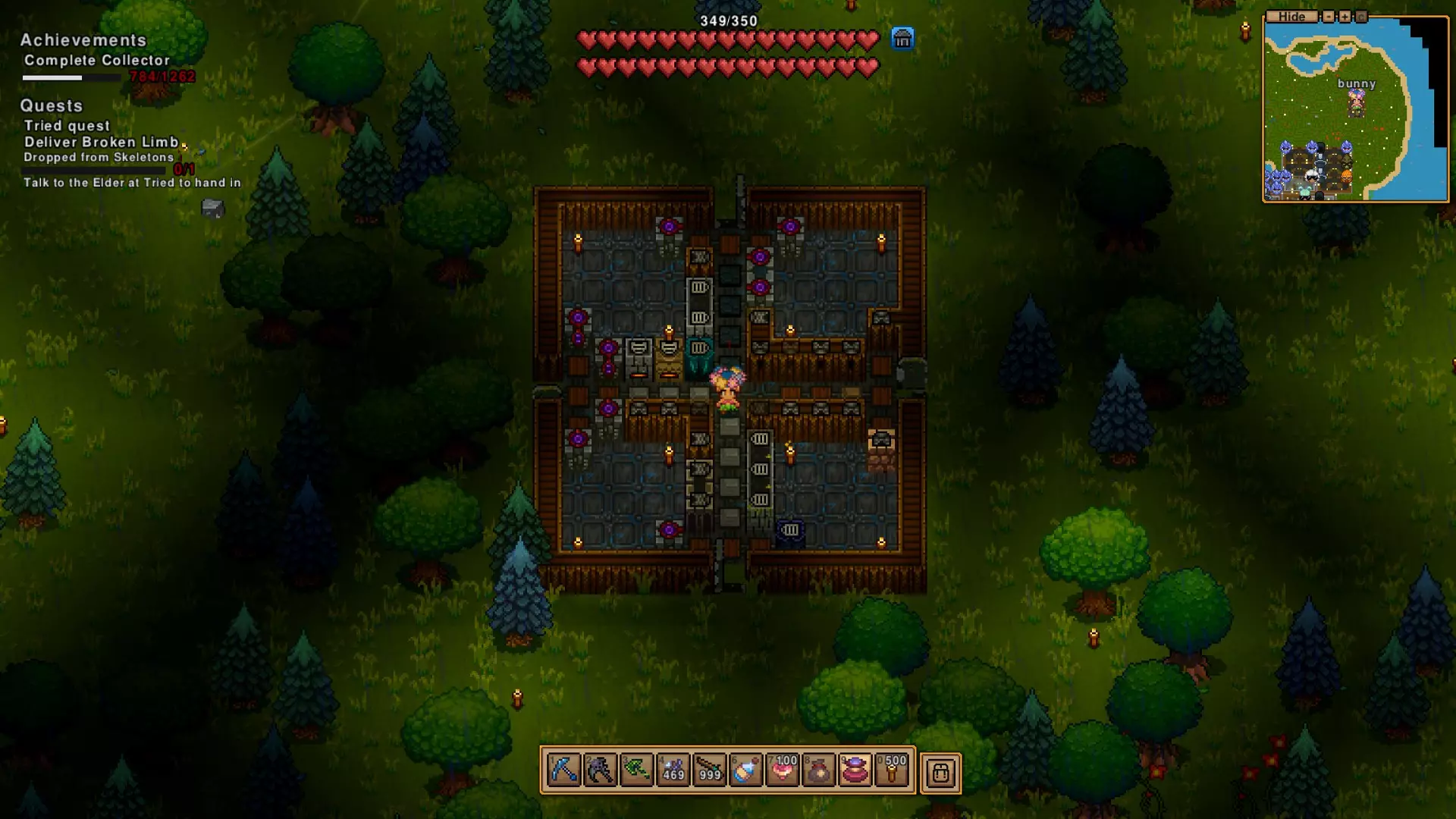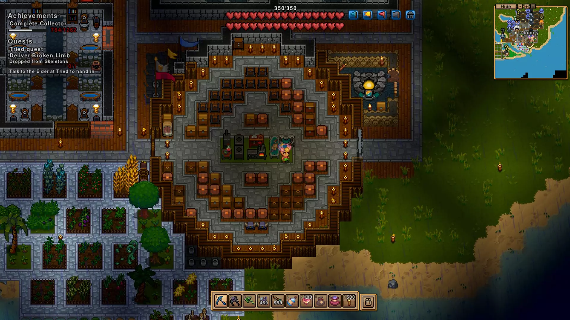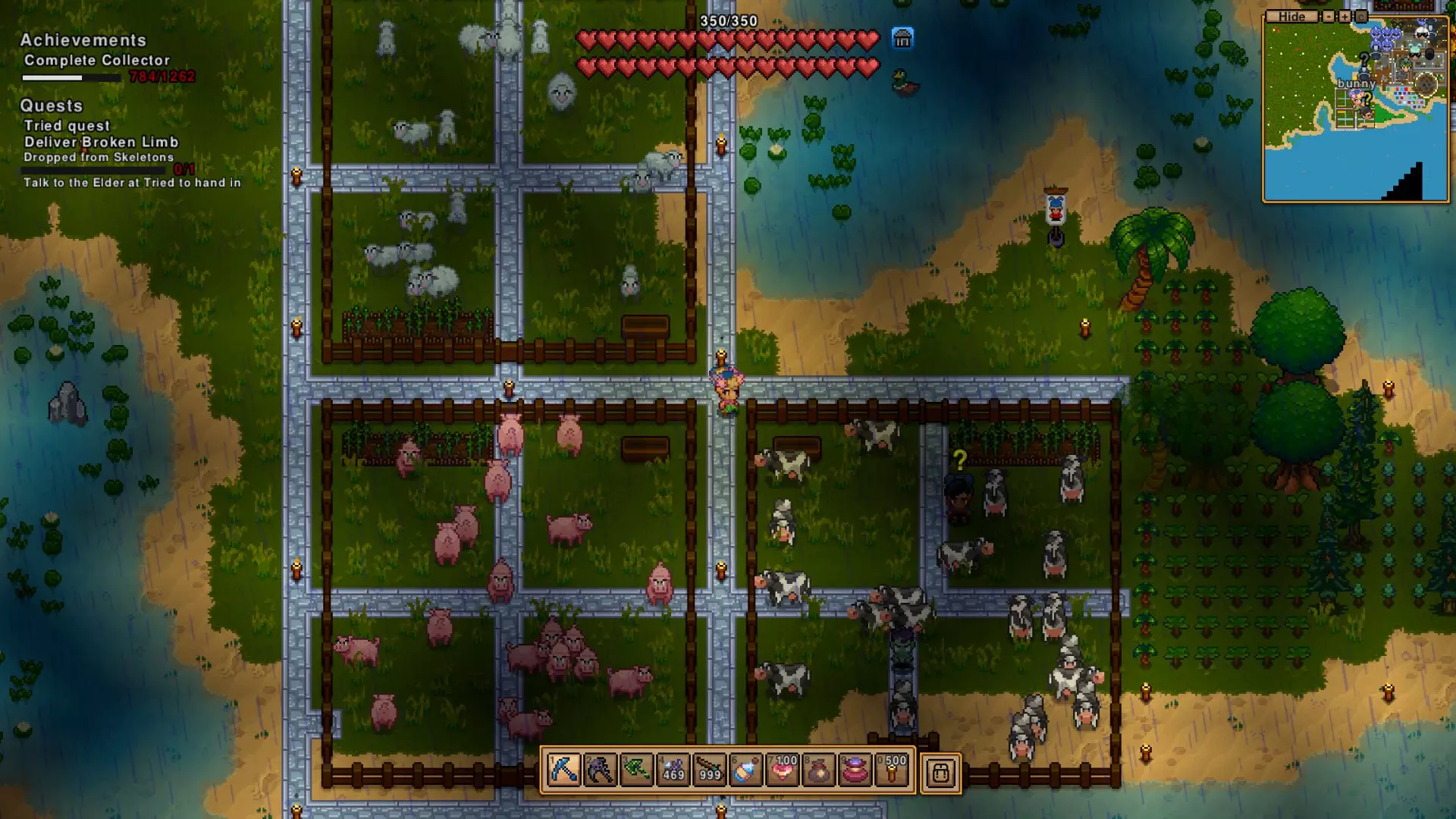 这是目前唯一无法让其与你同住的NPC。他们只愿意购买你找到的碎片地图,并出售一些随机物品。 不过也不是完全随机,完成任务后长老会给你的重要物品【绳索】、【海盗地图】、【脑浆棒棒糖】和【食谱书】始终有货。此外,【小丑的赌注】在某个阶段会加入并永久供应。 据我所知,这些NPC是获取【音乐播放器】的唯一途径,所以如果你需要那个成就…… 哦对了,还有【太阳镜】(可以在夜间佩戴),用于完成另一个成就。 他们还出售服装和其他随机物品,我会经常查看他们的库存。 由于最新更新,如果他们出售动物,会把动物拉在身后!不要杀死他们的动物,这会让他们生气! 我偷偷告诉你们,关于 farming,你有以下这些物品: 不是我的卷心菜 胡萝卜 南瓜 辣椒 玉米 番茄 茄子 大米 土豆 洋葱 草莓 小麦 - 用来给你的动物制作面包 还有火焰、冰霜、太阳、洞穴种子,它们都能种出东西 另外还有苹果、柠檬、香蕉,把酸橙放进椰子里。树苗可以在箱子里找到,或者你可以砍树来获取它们,还有黑色和蓝色的浆果丛。但要注意,有些蓝莓丛会刺你,不过之后它们会变成可爱的临时召唤物,你可以时不时使用它们。它们并不总是很有效……有时候它们不想动,有时候它们会跑到看不见的地方去攻击敌人。超级简单,几乎不费吹灰之力的成就攻略 这需要你付出一点努力,但不需要太多功夫就能很快完成。 这些成就没有特定顺序,我比较随性。 HORDER 你至少需要一把镐子,最好再准备一件武器。破坏你视野内的几乎所有东西(建议不要破坏你的初始房屋),只需让背包装满不同的物品即可。 WATCH ME! 你肯定会捡到饰品,它们在背包中有专门的位置,十分有用且功能多样。我喜欢那些能让我额外召唤生物的饰品,不过这个我之后再解释! TOURIST 按N键在这里很重要。如果你离开安全区域,可以尝试游泳,使用船或悬浮滑板会更快。当你来到世界地图,会发现有几种不同类型的生物群系,每个生物群系都有其独特的可探索内容。稍后我会详细介绍,但目前已知的有森林/平原(可能有村庄和地牢入口)、雪地(可能有村庄)、沙漠(可能有村庄)、沼泽。目前不确定是否需要访问地牢入口和海盗村才能达成相关条件。 我的爱好:你需要购买一个音乐播放器,然后在上面播放黑胶唱片。我目前正在尝试收集每种黑胶唱片,可能会列一个清单。 热水浴缸:如果你找到一瓶防火药水,喝一口然后在岩浆上跑来跑去,就能达成这个成就。 自封的:哦,你找到了一些黄金,把矿石熔炼,当然是制作一个皇冠并戴上它! 爆破专家:你一直在找到那些炸弹,对吧?或许可以向那些坏家伙扔一个或者十个。有些有延迟,需要花费一点点功夫。 独自在家 我一直在偷陷阱之类的东西,而且等了太久。你要尽快用铁丝之类的东西搭建小型杀戮区域,引导袭击者进入。到了游戏后期,我不得不让他们在我的陷阱周围绕了大概一分钟。