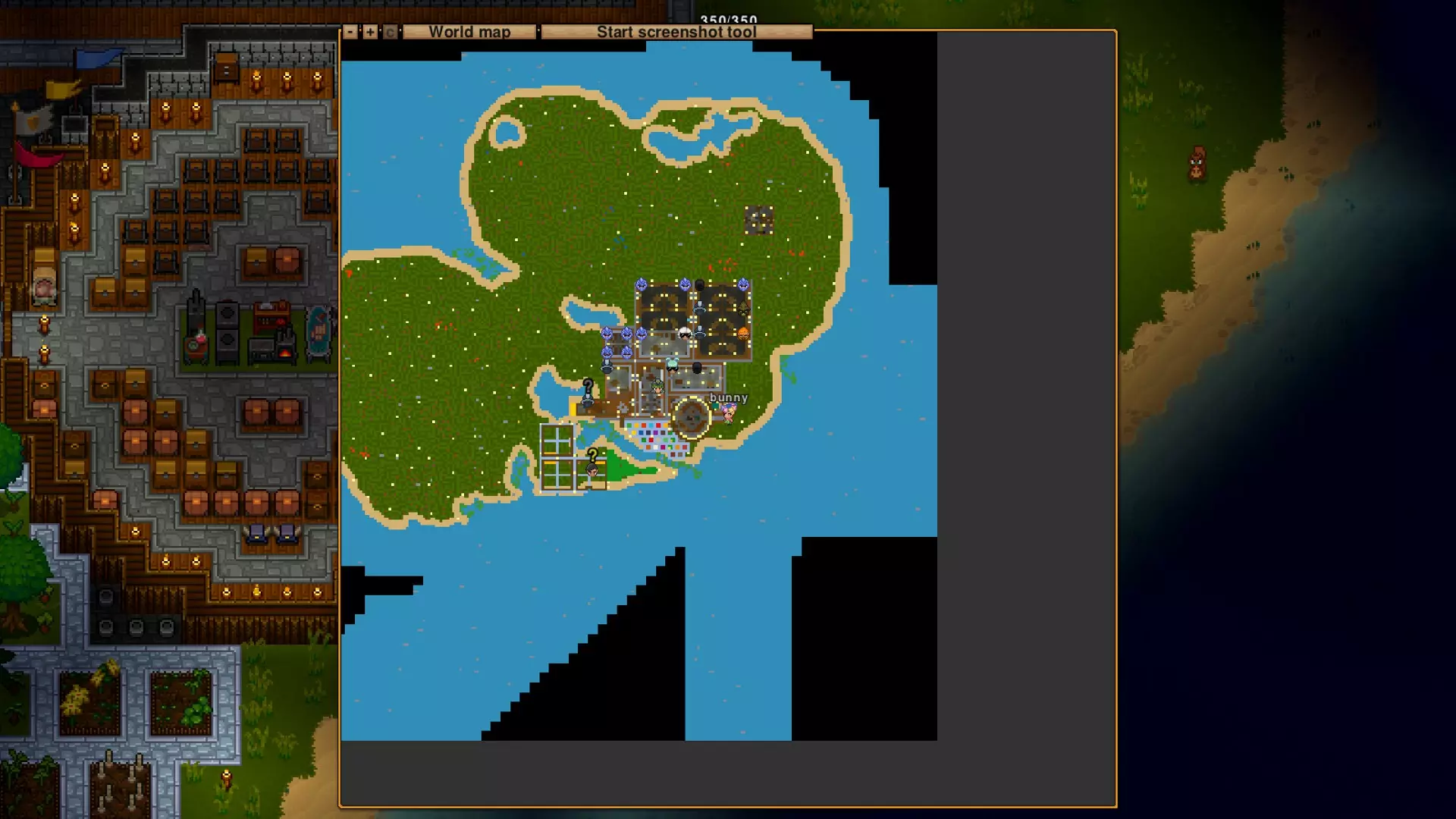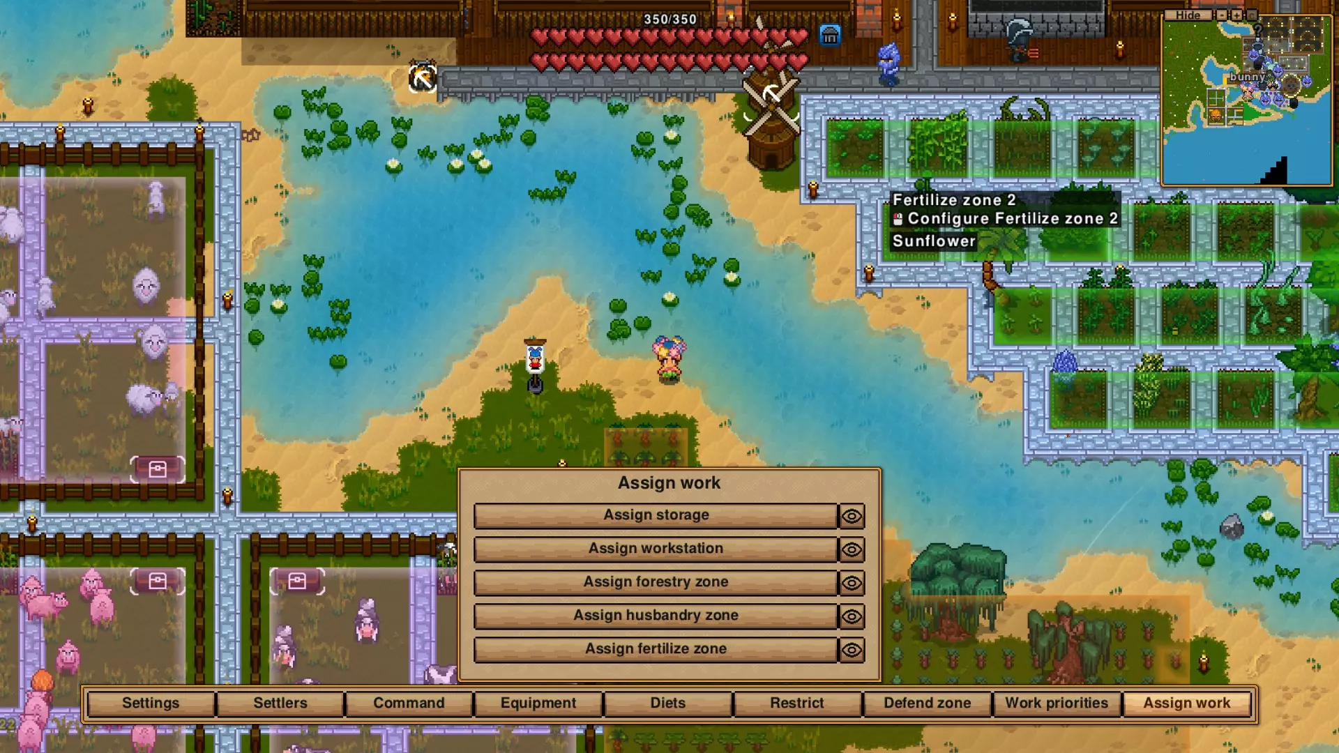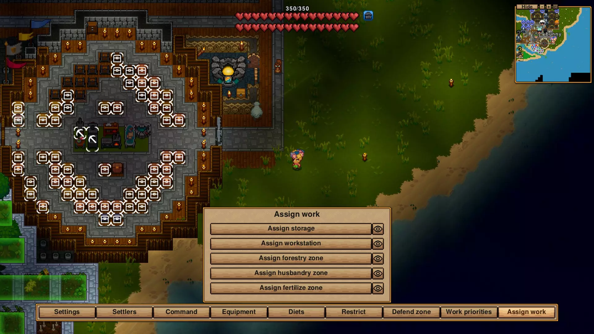 这张截图不太好,只能看到部分农场区域和我设置让村民填满的箱子。我觉得除了烹饪锅有让他们制作东西的指令外,其他地方应该没有了。你看不到林业区和处理区,但你可以添加区域,甚至还能给它们进行颜色编码。