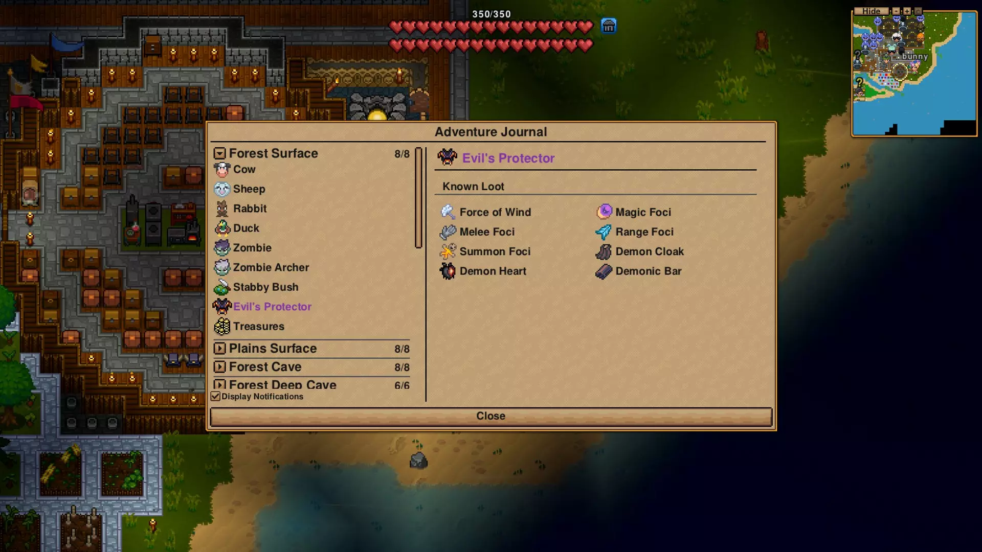 关注我的人都知道,我非常讨厌为了获取信息而点击无数个不同的地方。我也受不了看视频攻略,所以这会是一个纯文字和图片的指南。 既然我真的很喜欢这款游戏,并且正在努力达成100%成就,不如我来做一个指南帮助大家吧。 我的目标是在我玩这款游戏期间,尽可能把指南做得全面。我可能会停止更新,那是因为我不再玩这款游戏了,如果是这种情况,尽管来催我更新……我也许会更新。 有一些非常有用的内容我会直接链接,因为我无法超越他们的出色成果!不过,这些会是Steam链接。 在这里我会放上官方维基。请注意,截至创建本文档时,相关内容并非最新,我不会将其用作信息来源。我会在我的游戏流程或其他Steam指南中提供链接。 以下是免责声明: 我撰写本指南首先是为了自己,也是为了自娱自乐。我的写作风格可能会让某些人感到厌烦,如果你属于这类人,尽管去寻找其他指南,我不会为你改变我的写作风格,除非你给我大量的钱,说实话,即便那样也可能不会改。 我计划最终添加截图……不过我不打算费心添加所有的精灵图像……你可以在游戏中看到这些。对于盔甲之类的内容,我计划弄一个房间,里面放满所有盔甲/外观套装,这样你就能查看它们了……至于属性等内容,会提供指南链接。我会根据我拥有的选择以及我正在玩的风格来决定使用哪些物品。以**开头的章节意味着我有获取成就的技巧,由于成就列表在Steam上是公开的,我会在不剧透的情况下分享方法。据我所知,截至2024年10月5日,他们计划至少再进行一次包含物品的更新,因为平原地区的洞穴等地方将会有特殊内容……太好了,我只剩下几百件物品有待寻找(制作),这就像一场竞赛!那么,你准备好了吗? 已完成事项 - 2024年11月2日 目前共有43个成就,我已完成37个。顺序基于Steam网站。 Spelunker Instant nap Watch Me!以下是我尚未完成的成就,以及我在这些成就上的进度: 猎头者 初露锋芒 村庄帮手 工匠 马拉松跑者 一击必杀 掘墓人 冒险伙伴 囤积者 魔法坠落 观光客 九霄云外 渐入佳境 落魄潦倒 我的节奏 轻而易举 虚度光阴 冒险启程 自封称号 重赛 双重捕获 完美宿主 爆破专家 团队合作 安全第一 移动衣橱 更上一层楼 力量强化 热水浴 —— 时尚达人 —— —— 独自在家 —— 特勤局 尝尝这个! —— —— —— 从退出菜单中,你可以查看大部分内容的进度以及完成它们的基本方法。 不只是爱好 - ......我终究会完成的 9/500——又称,可能是最后一个 【Complete Collector】——784/1262个物品 1066-1333 1055(减少了10??而且我今天还获得了一些新物品!)/1353 感谢更新 【Master of Sun and Moon】——我只在4级难度击败过他们 【Crystallized】——胸甲丢了!需要获取更多全向水晶 【You and what Army?】——我有7套5级额外盔甲,1套4级,2套1级 【Me and this Army!】——我想和【You and what Army?】同时达成 我会在整个指南中详细说明如何获取它们。 游戏内证明