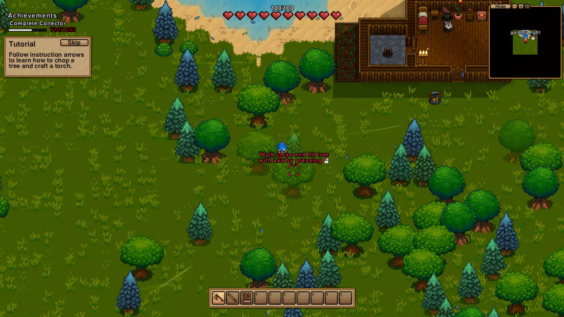 有一些非常容易获取的成就——需要向导小屋。如果你选择不生成向导小屋,获取这些成就就没那么容易了。 我打算花一点游戏时间进行困难难度的无小屋生成挑战,来好好完成这件事。 小屋的箱子里有一面定居点旗帜。把它放在外面就能获得【DO IT YOURSELF】成就。 点击床并将其设为你的新重生点,就能获得【INSTANT NAP】成就。 与长老交谈并接受任务,就能获得【ADVENTURE BEGINS】成就。 找到梯子并下去,就能获得【SPELUNKER】成就。 至于【marathon runner】【complete collector】和【time wasted】这三个成就,它们是被动触发的,一旦开始游戏就会自动进行,达成条件后会自动解锁。让你的角色四处跑动有助于提升奔跑能力,而在你积极游玩时保持游戏开启则能避免浪费时间。 Complete collector 是一个账号通用成就。 你可以在esc菜单的成就选项中追踪它,点击该成就即可查看你已发现的精灵列表。