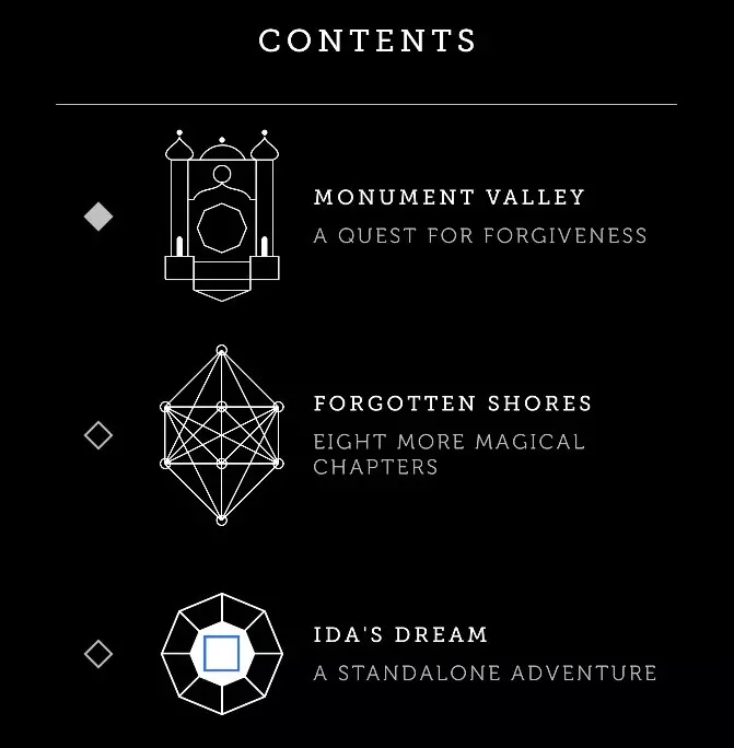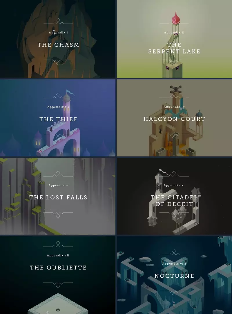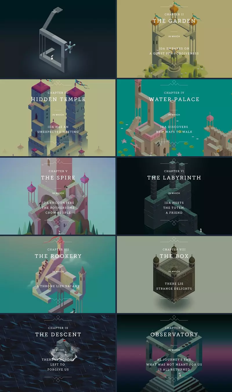 所有成就均已解锁。 成就数量:19 成就难度:简单 可100%完成:是 可错过的成就:无 有问题的成就:无 ◆《纪念碑谷》10个章节 10个成就 ◇《纪念碑谷:被遗忘的海岸》8个额外章节 8个成就 ◇《纪念碑谷:艾达的梦》1个冒险 1个成就 以下是各章节成就的标题和说明。 章节 ◇《纪念碑谷》10个章节 10个成就 此部分的章节与其他部分不同,有其各自的说明。