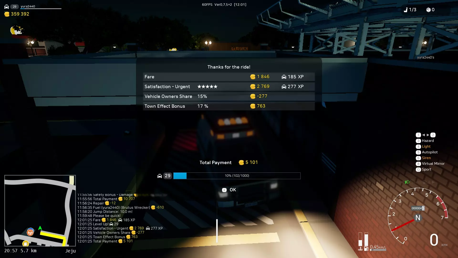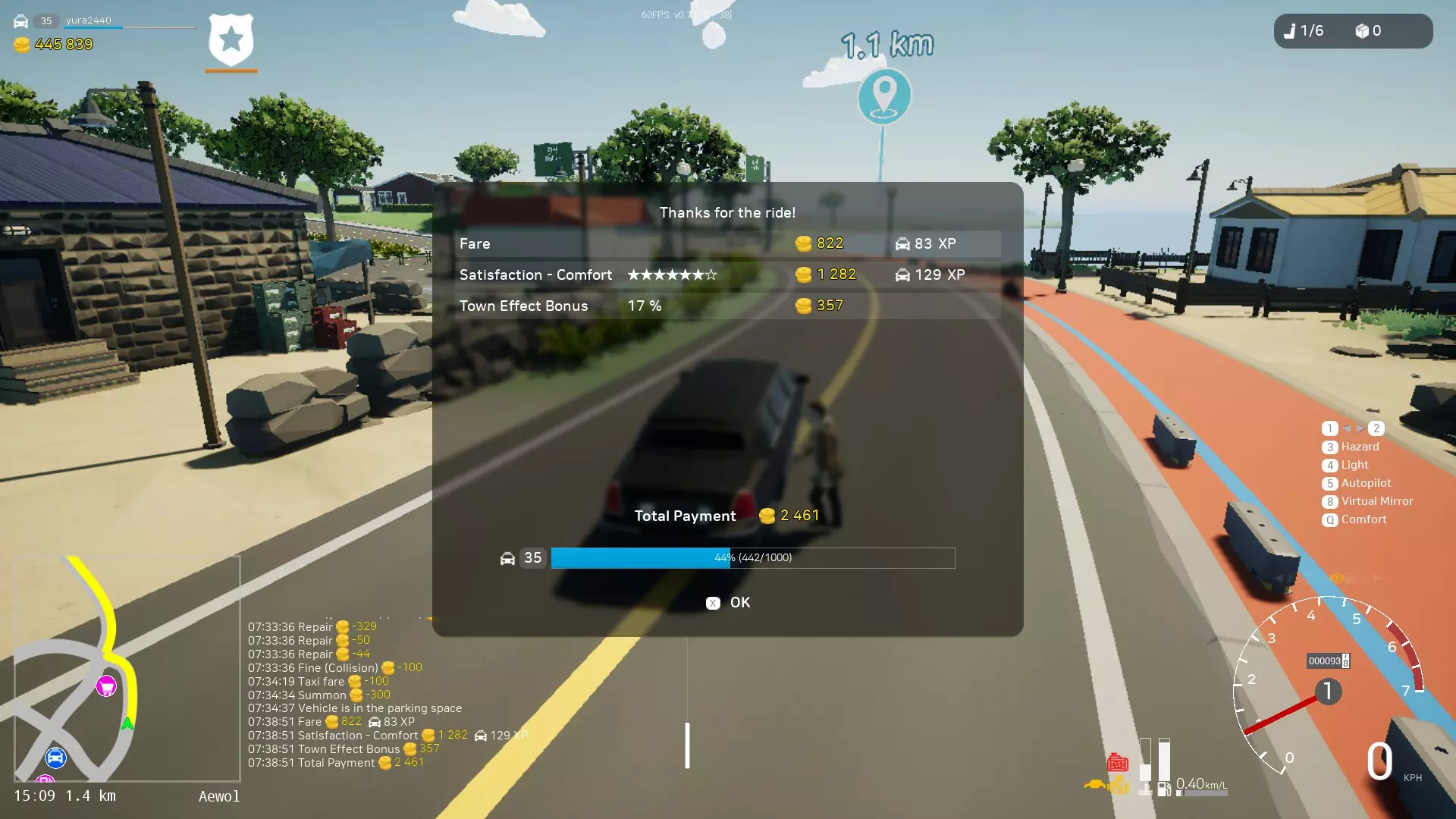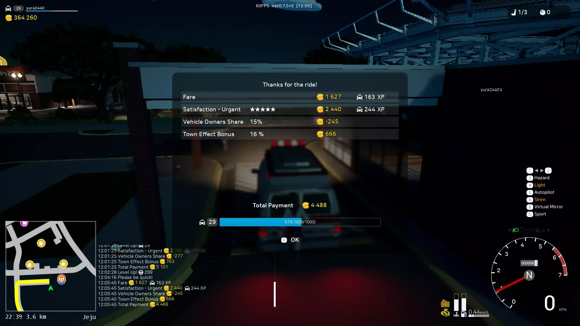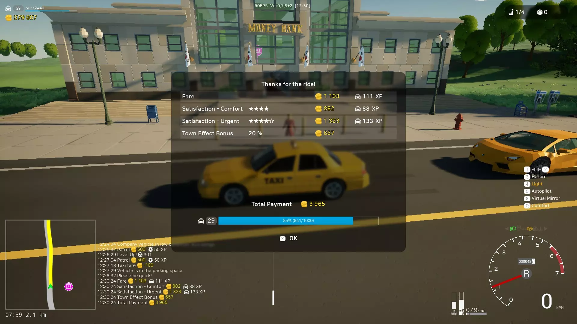 0.7.5版本更新中改进了警察工作机制。现在巡逻队数量从5个增加到10个,且出现速度大幅提升。因此,你现在可以赚取更多金钱。当你经过巡逻队时,每个巡逻队会对你收取10%的费用,但该费用会随时间减少。所以,如果你想从事出租车或公交车工作,就需要维持这个指标。当你达到100%时,从事出租车或公交车工作将在这些领域获得20%的额外收入。10%的巡逻度等于1%的出租车和公交车收入加成,首次巡逻会立即给予11%的加成。 为什么经过巡逻队会增加出租车和公交车的收入?这一切都与城市变得更安全有关,当城市安全时,人们愿意支付更多费用。━━━【出租车司机】━━━ 你需要接载乘客并将他们送往指定地点。人们会站在路边等待特定的车辆。你可以驾驶自己的车辆并将其改装成出租车。 有时,乘客可能会要求小心驾驶或快速行驶(关乎舒适度和时间)。 出租车控制面板: