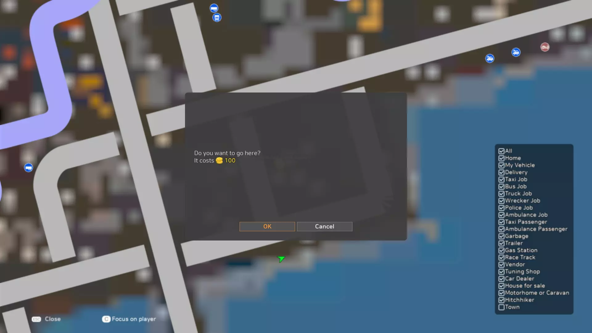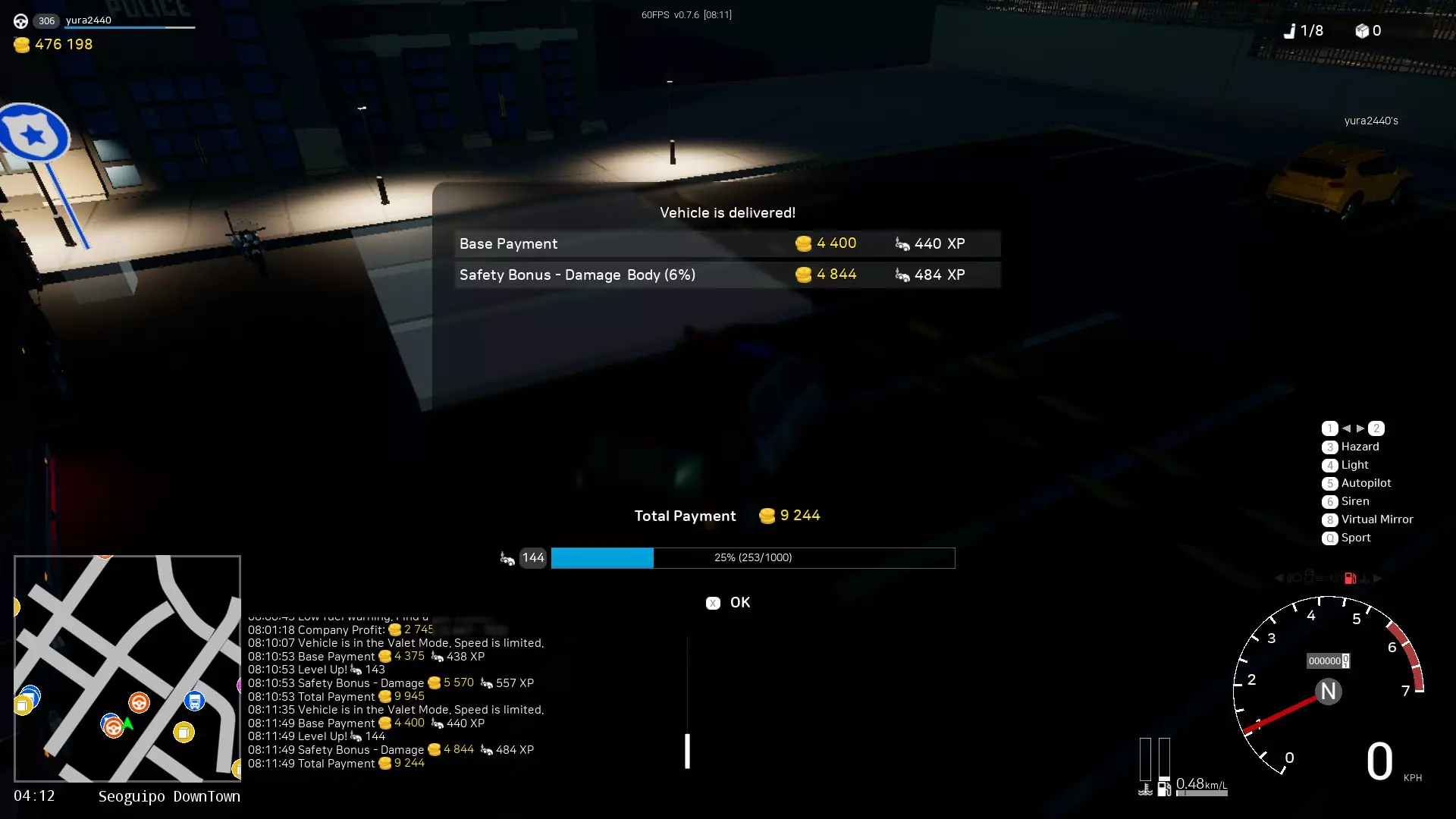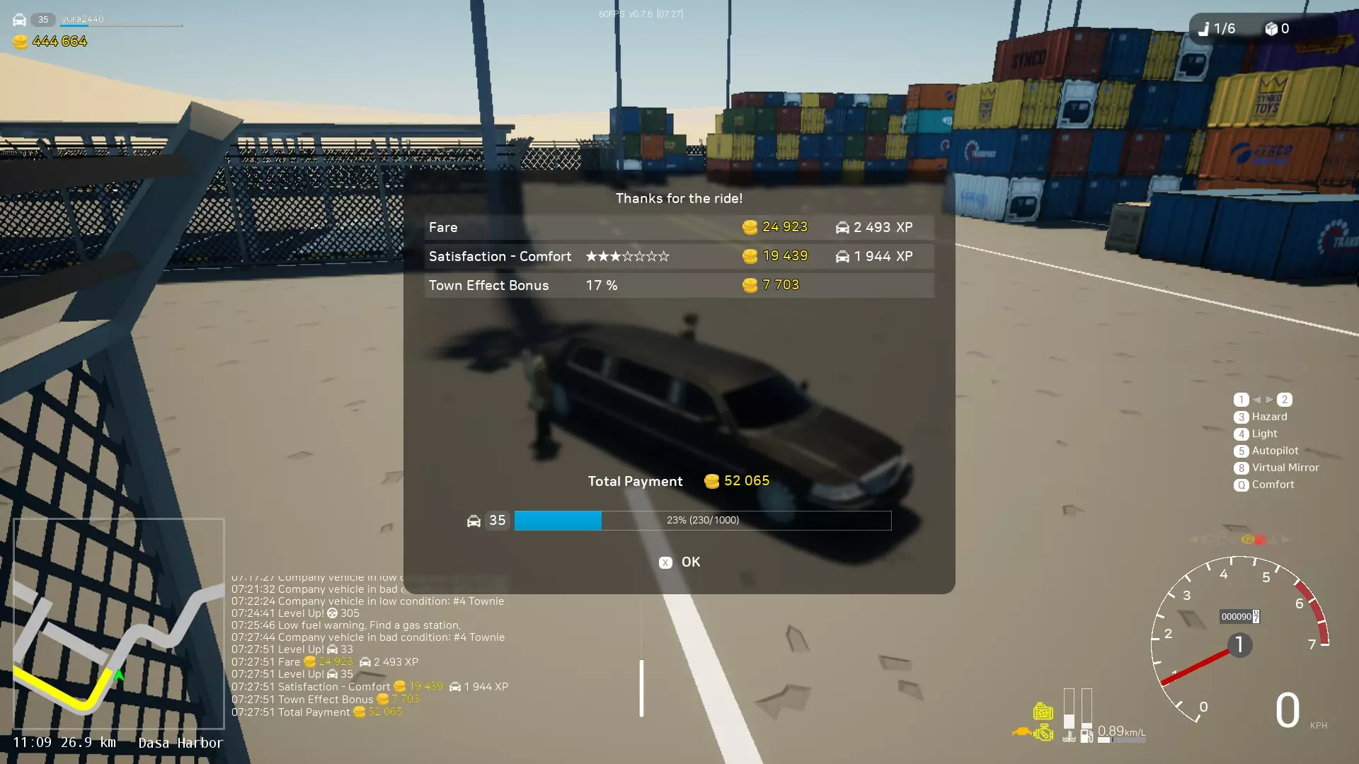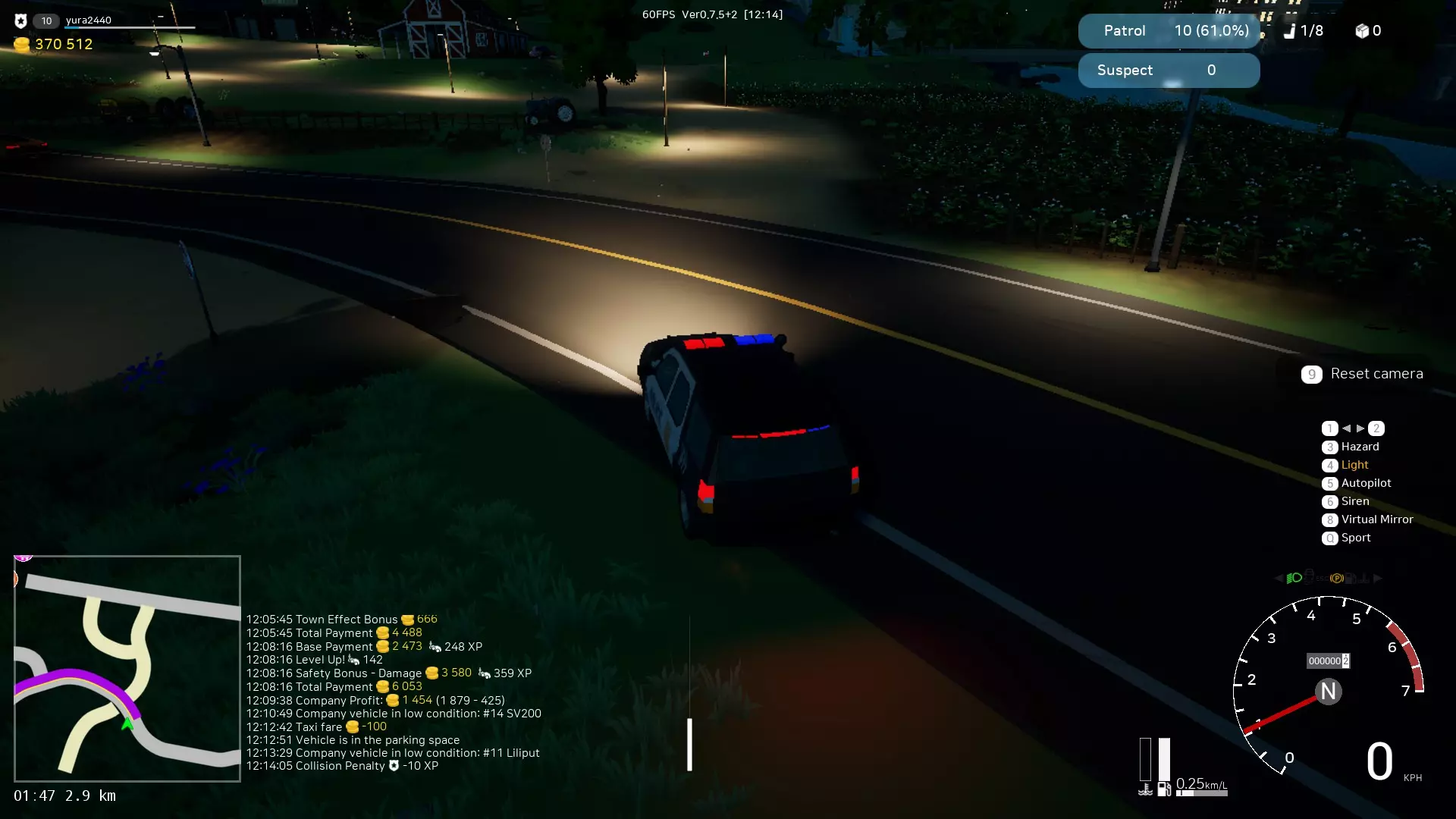 0.7.5版本更新中改进了警察工作机制。现在巡逻队数量从5个增加到10个,且出现速度大幅提升。因此,你现在可以赚取更多金钱。当你经过巡逻队时,每个巡逻队会对你收取10%的费用,但该费用会随时间减少。所以,如果你想从事出租车或公交车工作,就需要维持这个指标。当你达到100%时,从事出租车或公交车工作将在这些领域获得20%的额外收入。10%的巡逻度等于1%的出租车和公交车收入加成,首次巡逻会立即给予11%的加成。 为什么经过巡逻队会增加出租车和公交车的收入?这一切都与城市变得更安全有关,当城市安全时,人们愿意支付更多费用。━━━【出租车司机】━━━ 你需要接载乘客并将他们送往指定地点。人们会站在路边等待特定的车辆。你可以驾驶自己的车辆并将其改装成出租车。 有时,乘客可能会要求小心驾驶或快速行驶(关乎舒适度和时间)。 出租车控制面板: