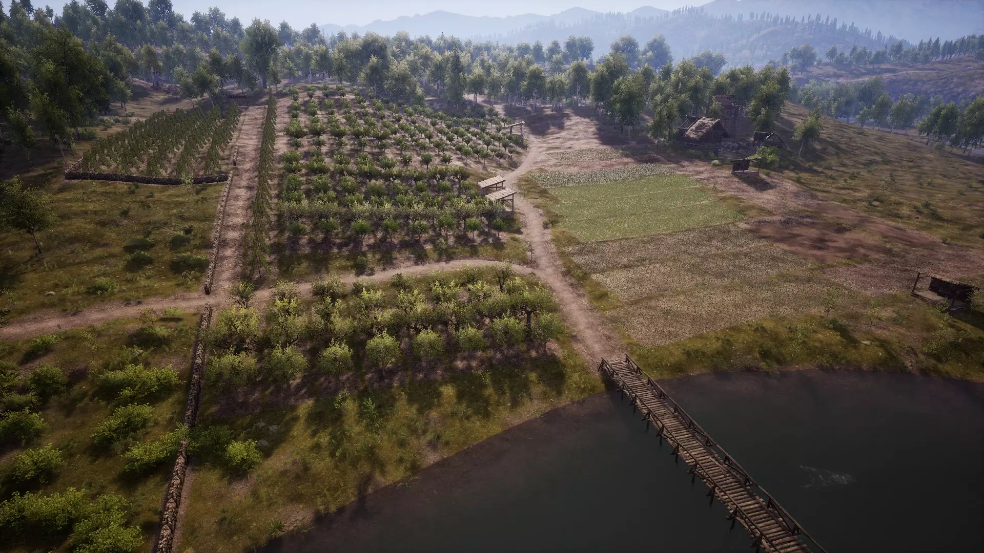 现在你应该掌握基础知识了。 在决定村庄建造位置之前,记得先保存游戏进度。 祝你好运,鲍勃 ^^ 【自建自给城镇所需条件(开发中)】 这部分内容仍在开发中,我需要更多时间来完善细节。不过可以先给大家一些初步建议: 初期让所有人都去当伐木工。你会需要大量原木,而且相比其他初期村庄职业(狩猎、采石、烹饪、打水),伐木工的效率要高得多。 即使到了后期不再需要那么多木材,我还是倾向于保留3个伐木小屋。我会用它们的箱子来分类存放一些物品(树苗、药水、个人装备等)。总之,在我看来,最佳建造顺序如下: 建造2个果园以解锁食物仓库和谷仓。 在矿场附近建造一个储物建筑。 在图片中标注X的位置建造一个储物建筑。 在X处为自己建造一座房屋。 建造一口井(最佳位置可能在X处)。 在X处建造食物仓库。 在X处或矿场建造2座房屋和4个伐木工人小屋(暂时的)。 在X处建造铁匠铺。 在X处建造厨房。 现在你有4个人在生产原木并使用储物系统(因此无需填满每个建筑的箱子),而且你仍处于可以决定在哪里建造真正村庄的阶段。 大部分内容无需多言,但关于农业方面:2名农民,3块田地,每块田地为4×16即64个地块,每种作物种植20-24株。这在2天的季节里基本可行。3个果园以及4x8的地块需要你亲自耕种。动物方面,驴不需要工人照料,你只需每隔几天添加饲料即可。蜂箱能最大程度提升你的定居者技能(而且蜂蜜可用来制作价格不菲的蜂蜜酒)。只要你不打算生产衣物赚钱,养几头牛获取牛奶,再建一个鸡舍就完全够用了。厨房是唯一能让工作的定居者发挥实际作用的生产建筑。目前就这些,我仍在努力打造一个尽可能小而完善的自给自足村庄,目标是用不到23名工人就能良好运转。