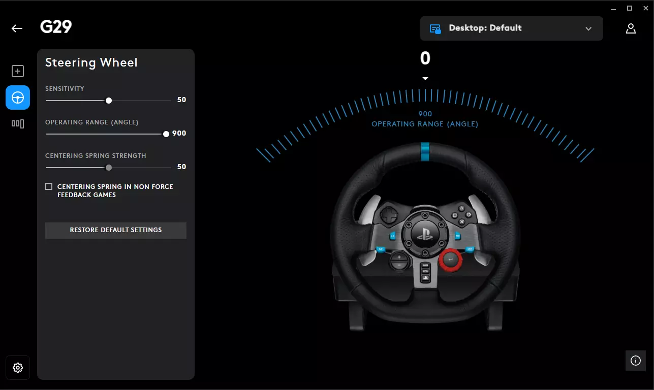 G HUB中的方向盘设置 如果您使用的是罗技方向盘,请先在G HUB中正确设置——否则《欧洲卡车模拟2》将无法提供正常的力反馈。以下是我测试后一直使用的设置,感觉稳固且响应灵敏,不会过于僵硬或飘忽。 灵敏度:50(中性,保持方向盘响应自然) 操作角度:900°(必须与游戏内设置匹配——卡车转弯幅度大) 中心弹簧强度:50(可选,增加一点回正力) 非力反馈游戏中的中心弹簧:关闭(取消勾选此项)