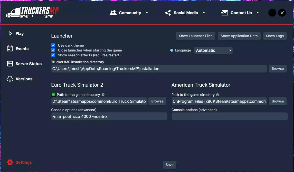 开始游戏前需要记住的事项: - 仅在模组服务器中关闭速度限制器(若追求真实感请保持开启,因为部分欧盟国家法律规定需始终保持低于90公里/小时的速度限制) - 遵守游戏内交通规则,否则可能被踢出或封禁 - 不要干扰交通或其他玩家,若违反迟早会被封禁 - 紧急情况下使用【/fix】修复卡车(使用次数有限) - 将CB无线电设置为19频道进行一般语音聊天 真实感说明:TruckersMP在模拟1服务器中强制要求真实驾驶。如果在弯道超车、在城市超速或发生碰撞,将会受到管理员处理。 想要完全真实的体验?请选择模拟1服务器,禁用辅助功能,并像对待工作一样认真驾驶。官方客户端下载 TruckersMP知识库 - 设置指南、规则和帮助文章 TruckersMP论坛 - 社区讨论、支持和更新 支持的模组(论坛主题) - 多人游戏中允许使用的模组列表 支持的DLC(Steam购买指南) - 可与TruckersMP配合使用的DLC 启动选项(Steam和TruckersMP启动器) 根据你启动欧洲卡车模拟2的方式,使用以下方法为游戏应用一些自定义启动选项。 对于TruckersMP启动器用户(多人游戏) Steam启动选项不适用于你,因为当你使用TruckersMP启动器时,它会绕过Steam。以下是手动添加的方法: 打开TruckersMP启动器 点击设置(⚙️)图标(左下角) 在控制台选项(高级)下,粘贴你的启动参数(空格分隔) 点击保存 从启动器启动欧洲卡车模拟2多人模式