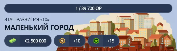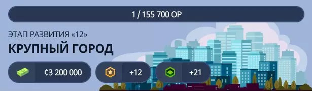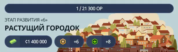 当前阶段您将获得2,200,000资金、9点发展点数以及额外12个扩张许可。此外,还将解锁以下内容: - 贷款限额(800,000):解锁贷款功能,可获取最高800,000的额外资金。 - 高密度商业区(欧洲):解锁建造欧式风格的新型高密度商业区的功能。高密度商业区(北美风格)- 解锁在北美风格中建造新的高密度商业区的功能。小型城市
