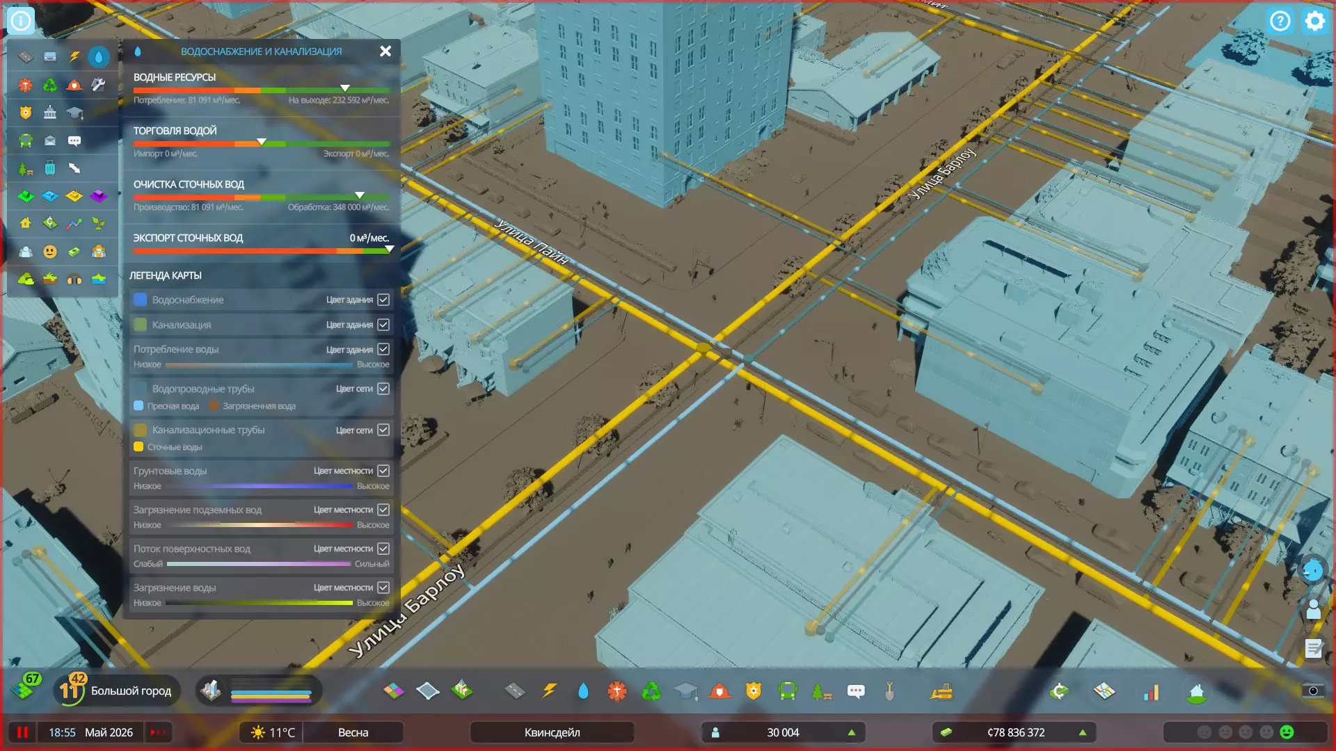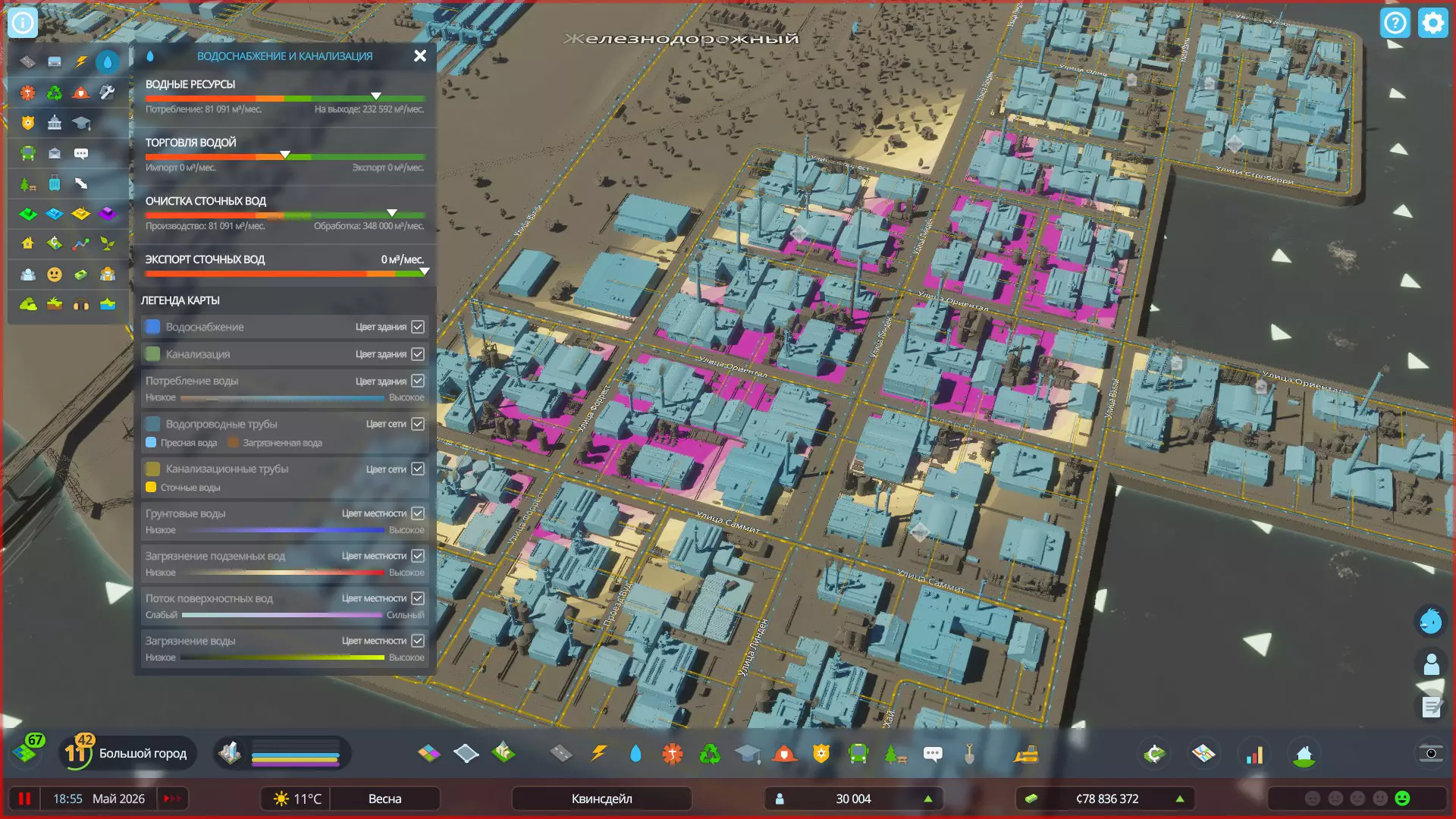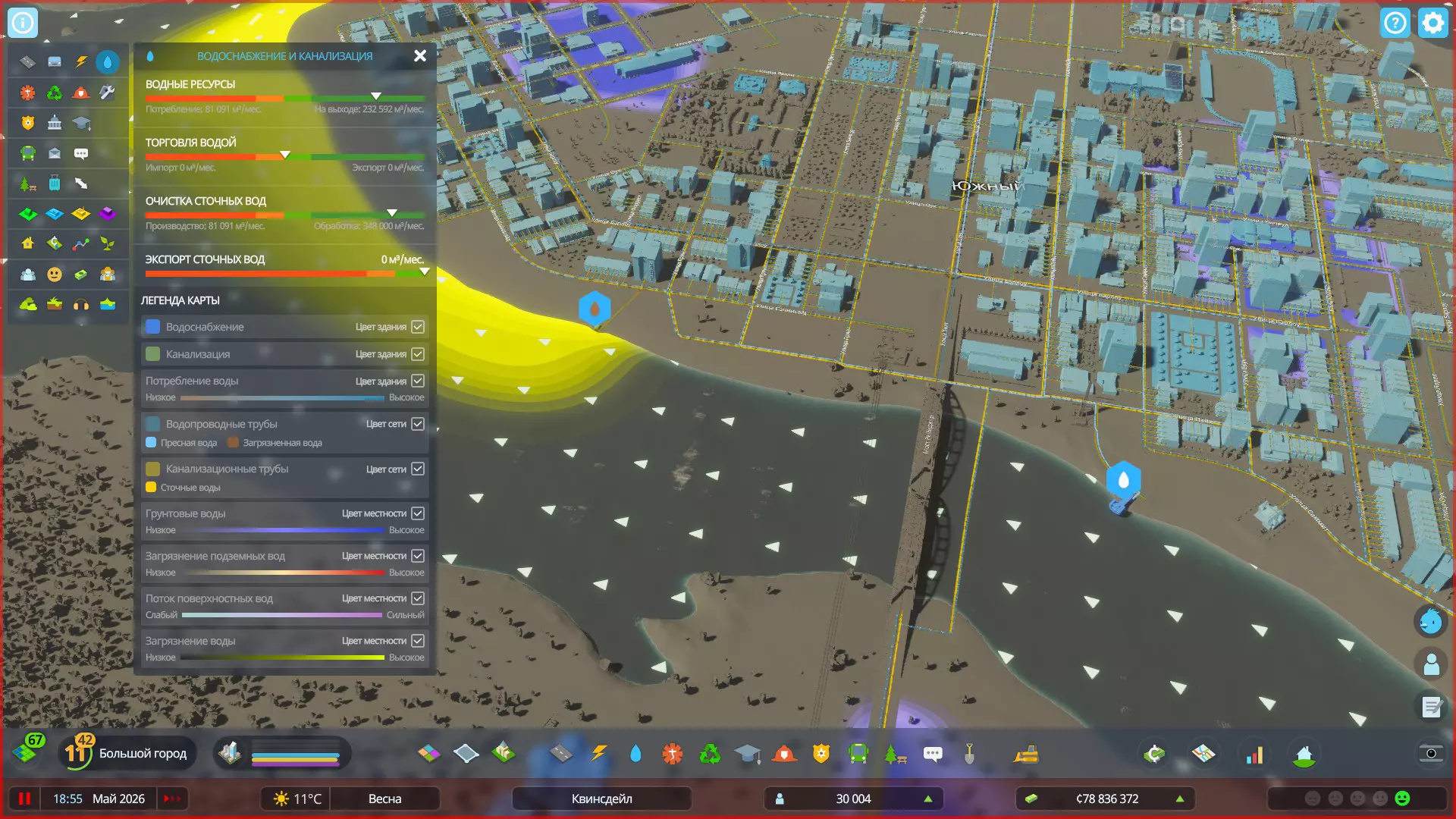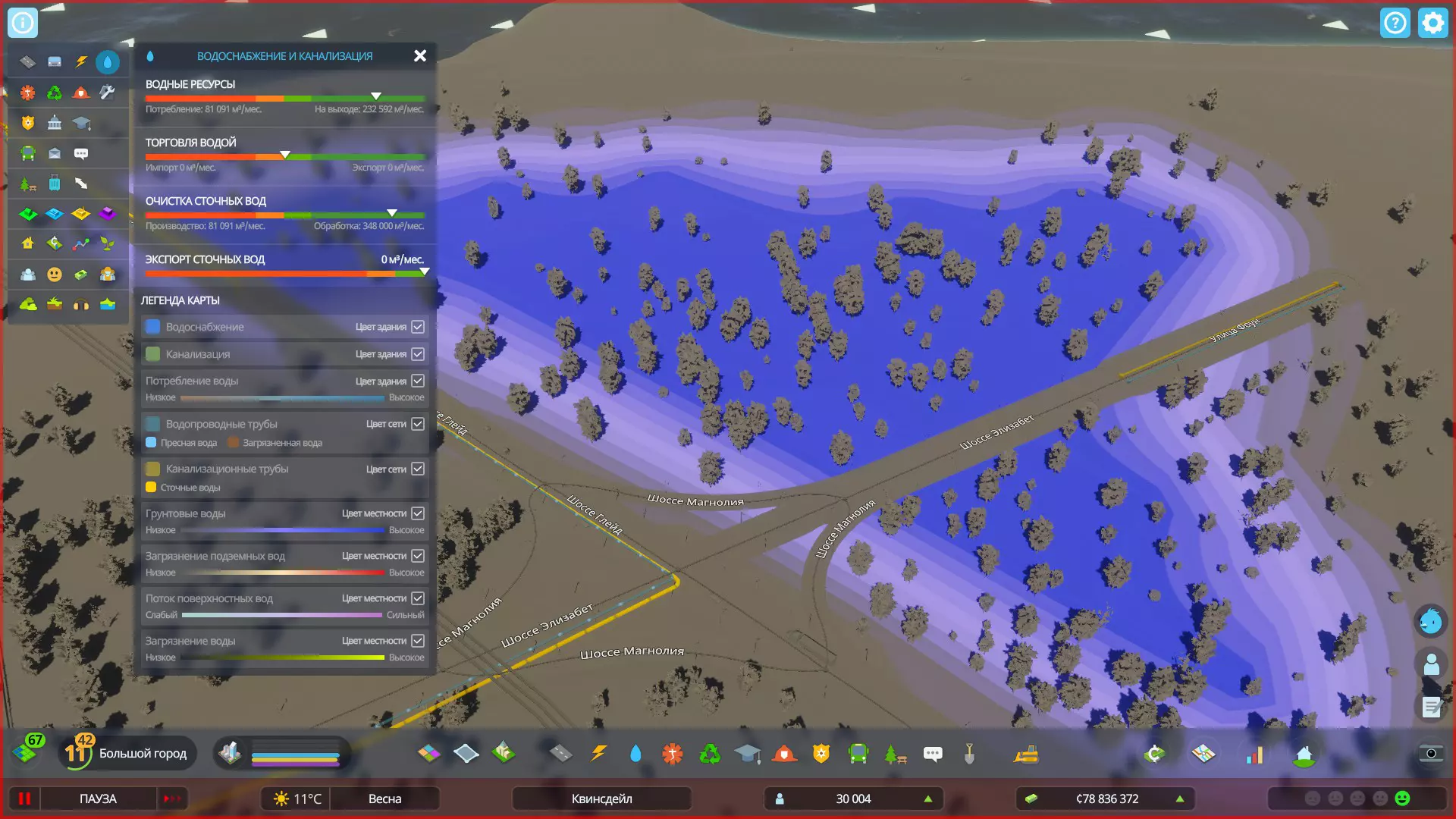 你也可以进行淡水的进出口贸易,为此需要在地图边缘建立外部连接。出口多余的淡水可以弥补城市预算的支出。 给排水管道:你的综合管道已纳入道路工程网络,现在无需手动铺设。是的,如果需要,您可以单独铺设管道,但现在这个过程变得简单多了!