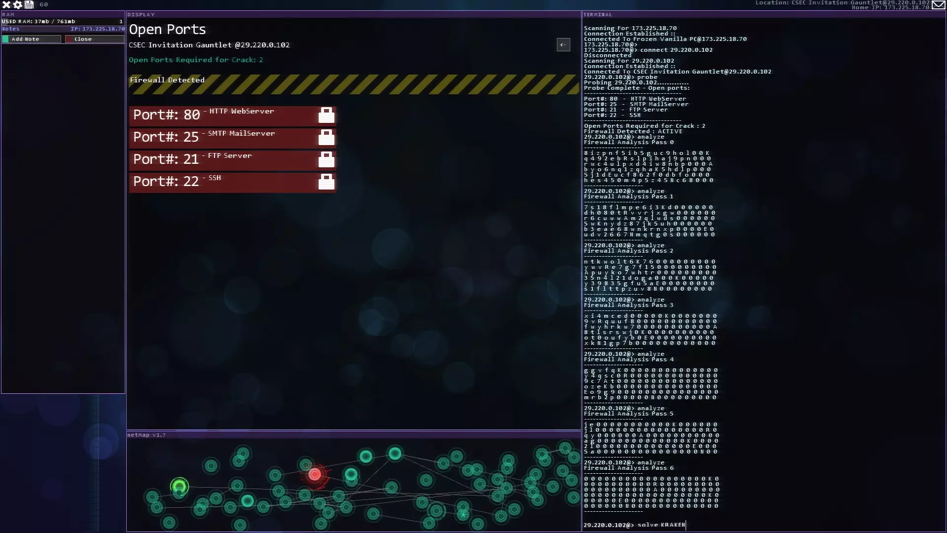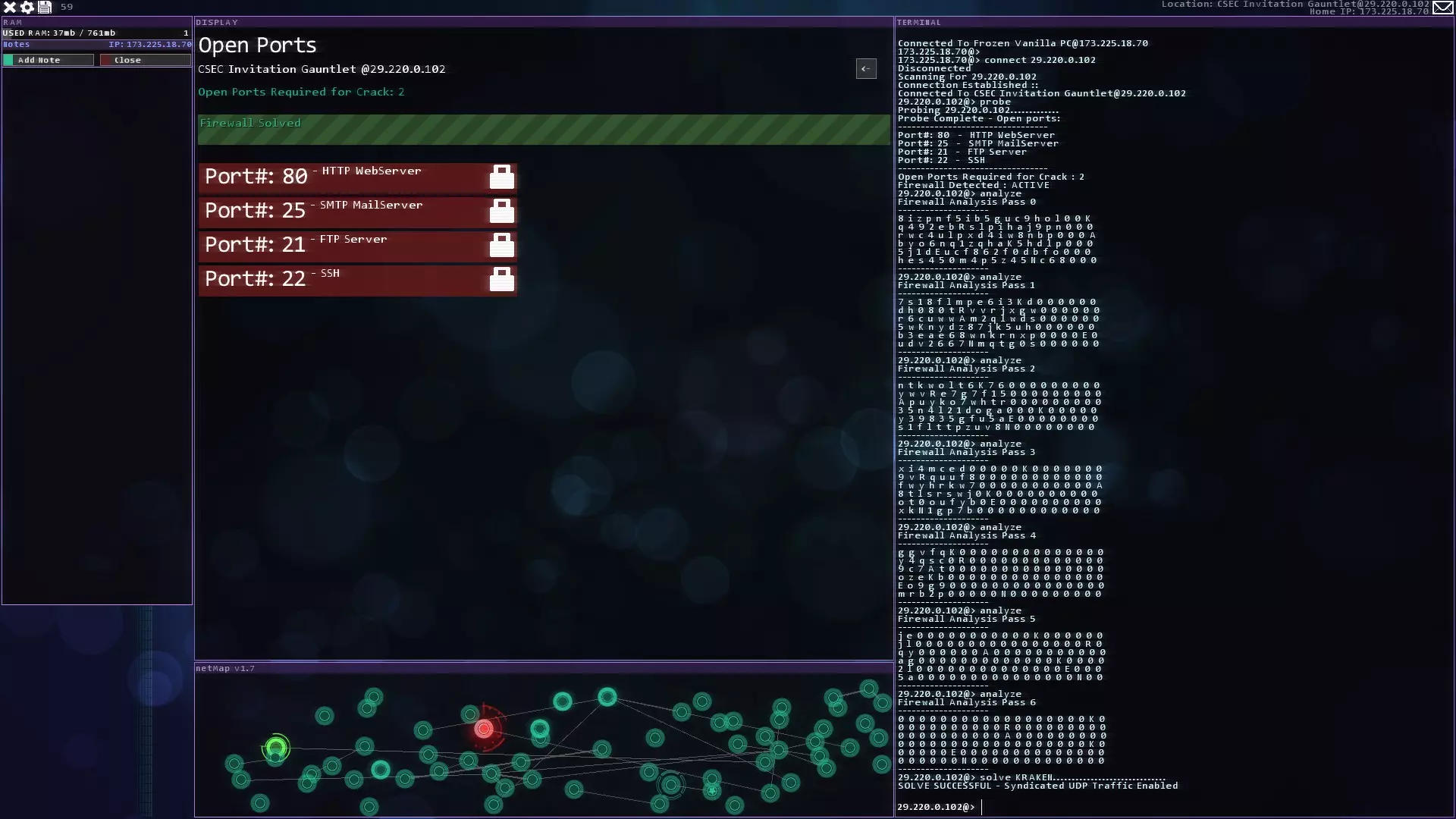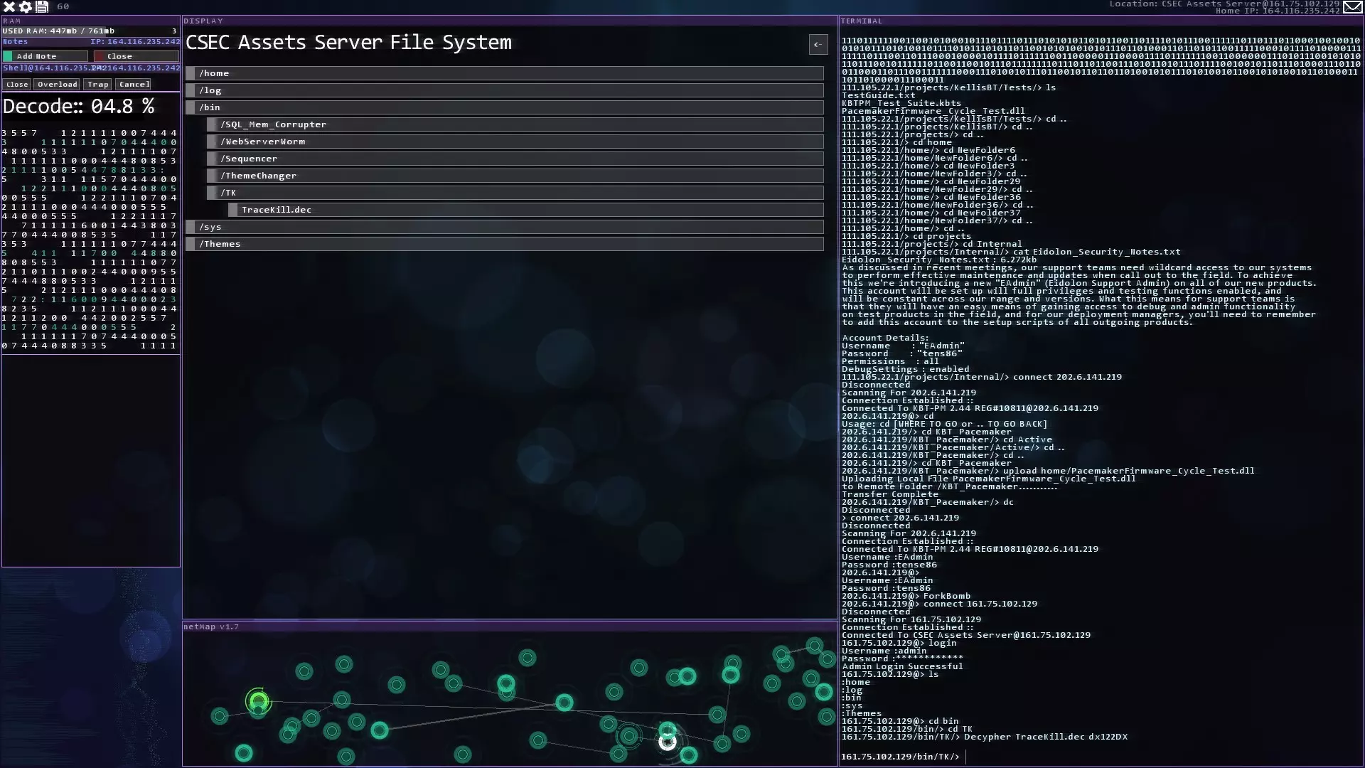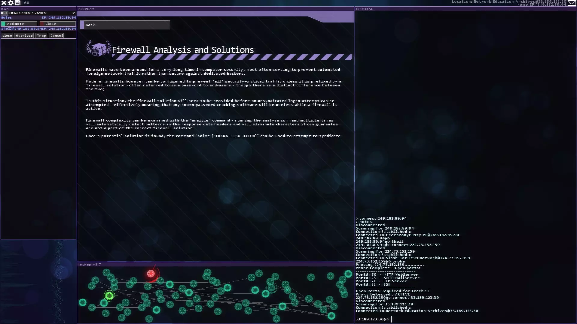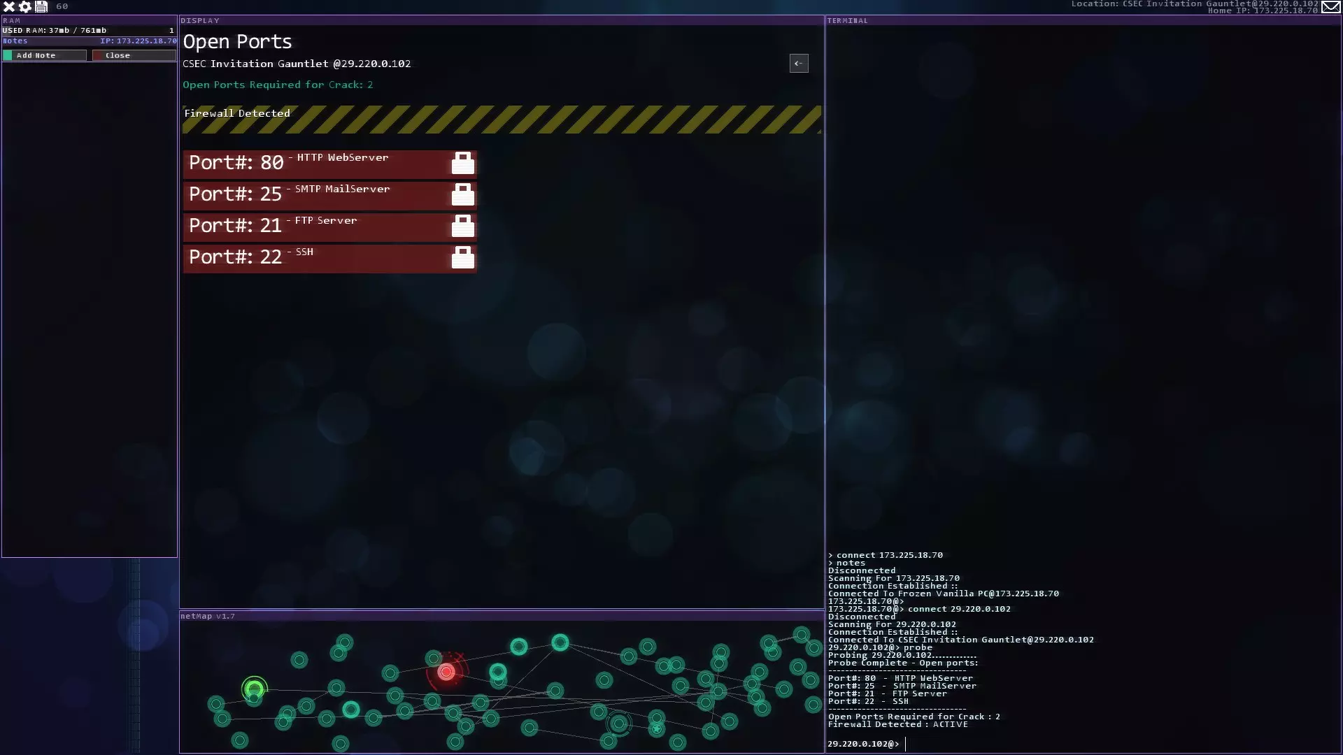 注意:紧急追踪规避序列(ETAS)将在你获得CSEC账户后立即可用 提示与技巧 - 如果你玩黑客网络,在旁边准备好纸和笔。这对后续的一些任务会有帮助。 - 使用多个Shell来绕过某些代理。这会减少绕过所需的时间。记住在绕过代理后关闭它们以恢复你的RAM。 - 像KBT_PortTest和SQL_MemCorrupt/SQLBufferoverflow这样的漏洞即使在防火墙或代理激活的情况下也能执行。 - 使用Tab键而不是手动输入内容。Tab键具有自动完成功能。 - 搜索每个服务器/节点以获取信息或秘密。它们可能会帮助你推进故事线。