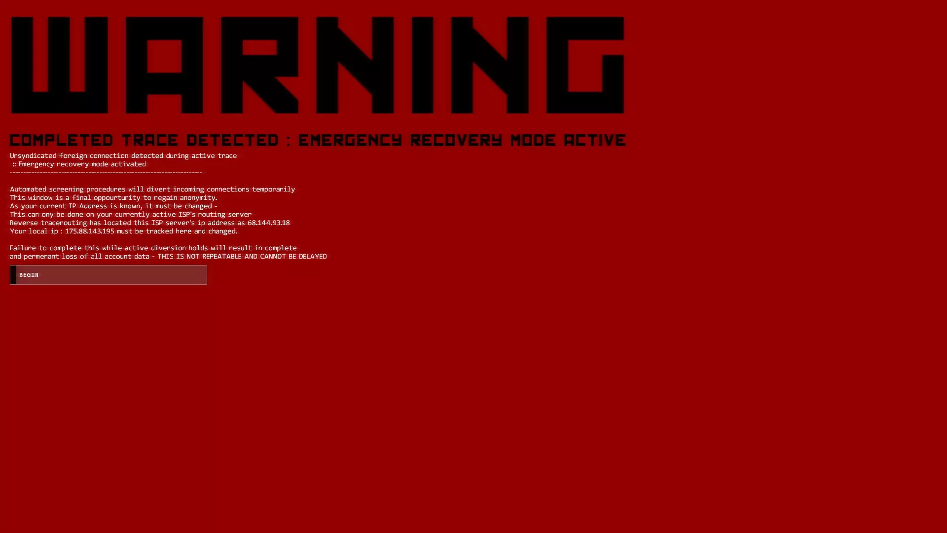 如果没有成功,你可能遗漏了某个字符或使用了错误的密码。 示例: ----------------------------------------------------------- 742.806.97.2> 分析 分析 6: ---------------------------------------- 000H000000000000000000000 00000000000000000O0000000 000R000000000000000000000 00000000000000S0000000000 E000000000000000000000000 ---------------------------------------- 742.806.97.2> 破解 HORSE............................. 破解成功 - 已启用联合用户数据报协议流量 742.806.97.2> 紧急追踪规避序列 当追踪进度达到0时,紧急追踪规避序列将被激活。一旦达到0,你会看到一个警告屏幕。