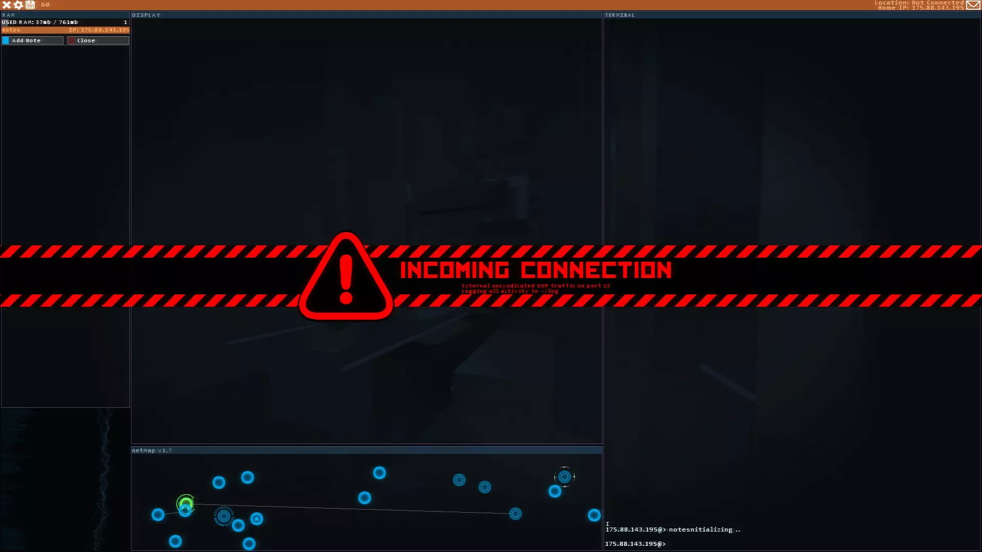 登录并启动【黑客网络操作系统】(HacknetOS)后,你应该会看到类似这样的界面。