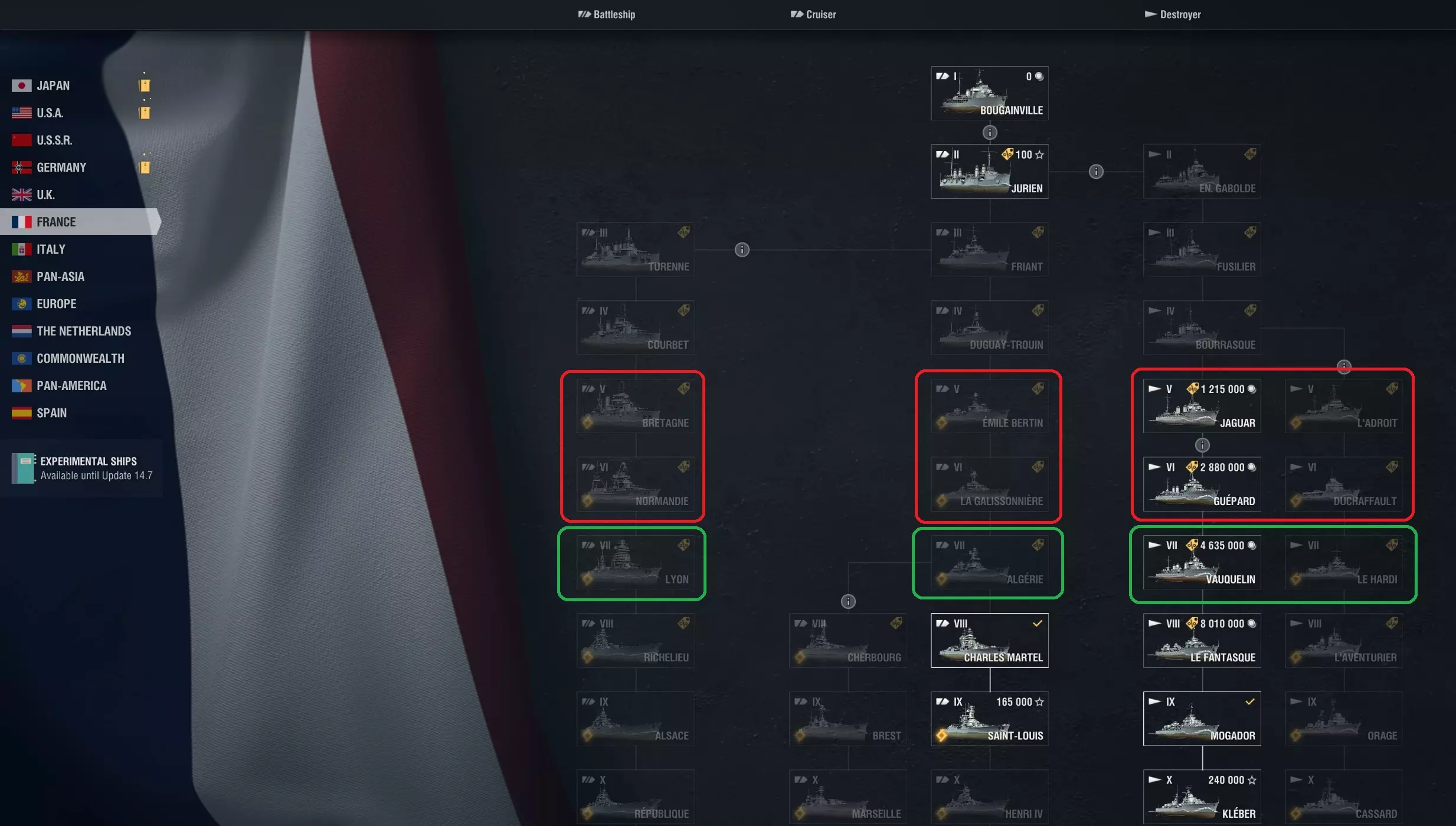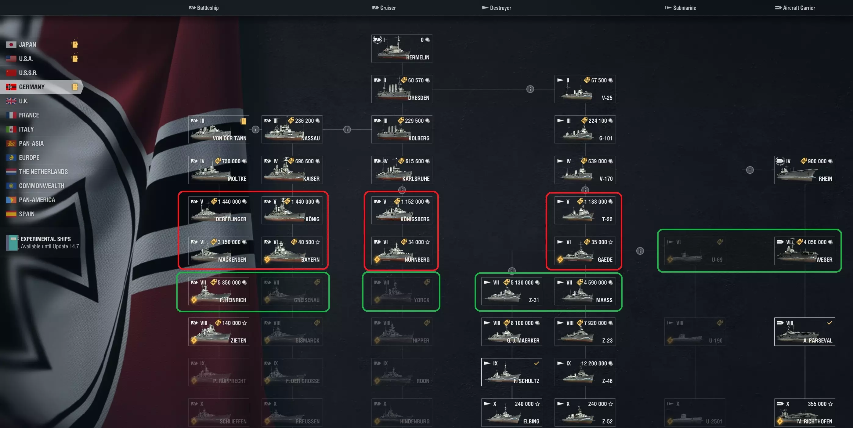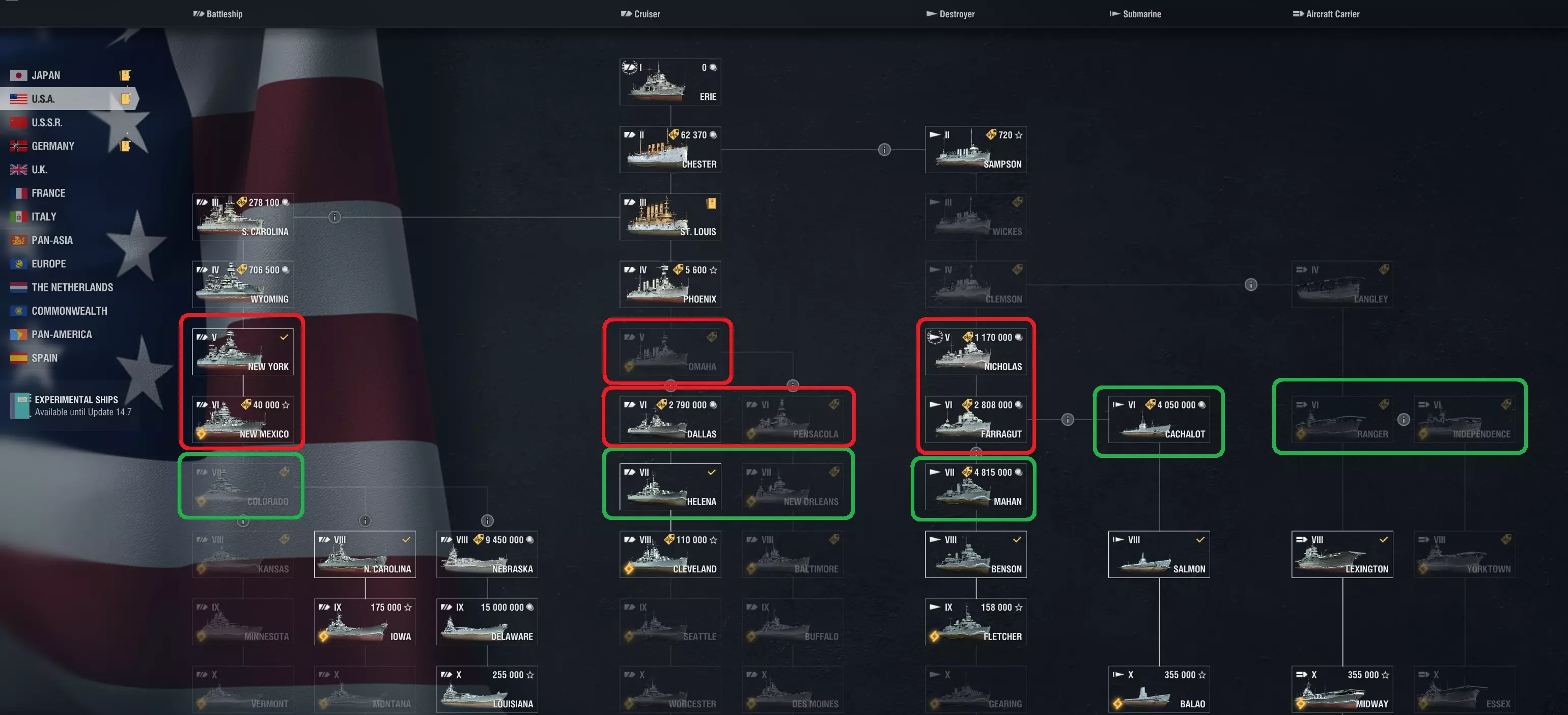 主要优势在于能够更集中地整合指挥官经验(CXP)以加速技能培养,尤其是当某个国家没有需要多种舰船类型专精的庞大科技树时。 注意:相同方法适用于任何主要国家,但仅在重新训练技能点少于18点的指挥官时使用,以避免高昂的精英指挥官经验(ECXP)消耗。 重要的研发节点 每个主要国家都有不同的科技树分支,可能并非包含所有舰船类型。