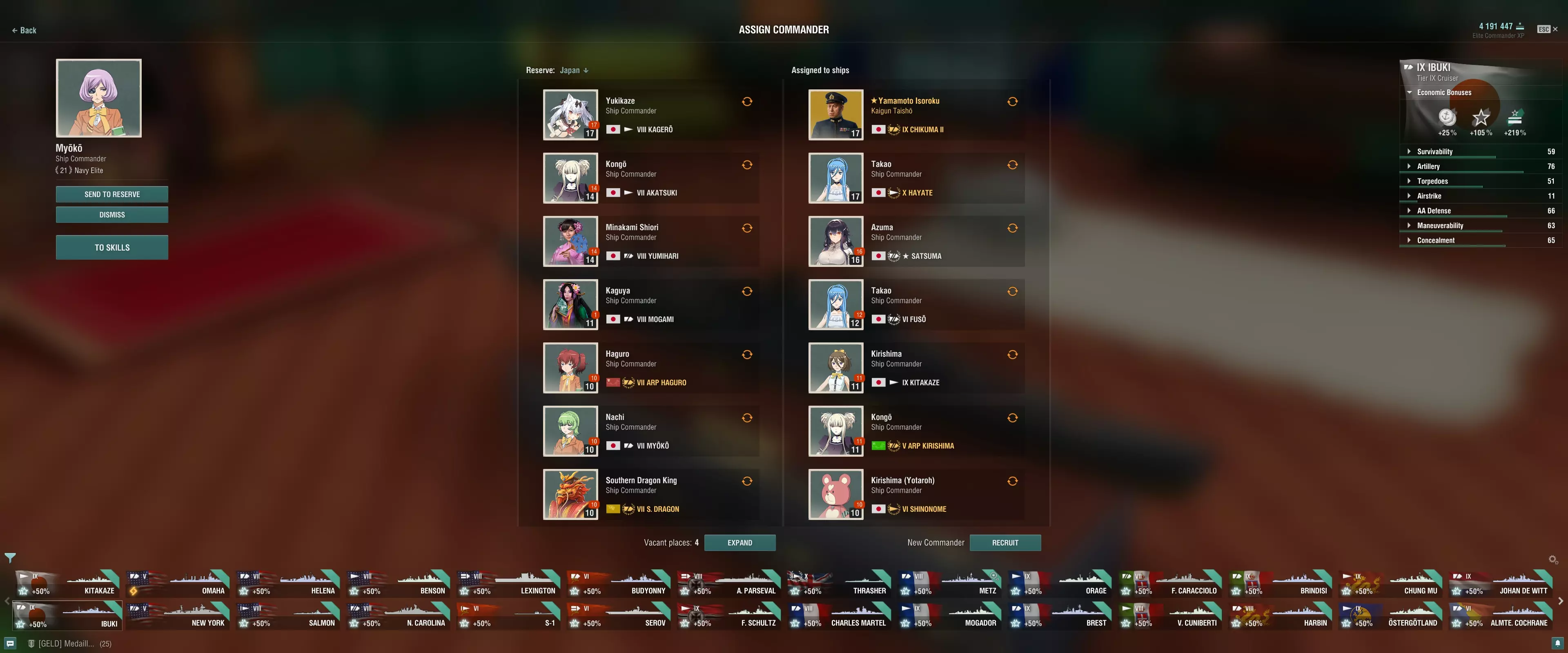 像日本这样的主要国家通常会通过年度活动获得数量不成比例的非正规军。随着他们数量的增加,在各种适用情况下,解雇正规军会显得更具吸引力。 注意:解雇必须仅以 credits 为代价,因为全额精英指挥官经验值不值得花费 doubloons。 【金币船是免费的备用空间】 当有闲置指挥官时,可以将他们安排在使用频率较低的金币船上,无需花费 100 doubloons 来额外扩展 4 个预备役槽位。 【获取精英指挥官经验值(ECXP)】 任何达到 21 级的指挥官现在都成为海军精英,所获得的所有指挥官经验值(CXP)都将转换为可用于其他指挥官的精英指挥官经验值(ECXP)。注:海军精英不仅能在原指定舰船上继续获取精英指挥官经验,还能在对应国家的所有高级舰船上获取。更高效的再训练:拥有13个或更少技能点的指挥官进行再训练时性价比最高。