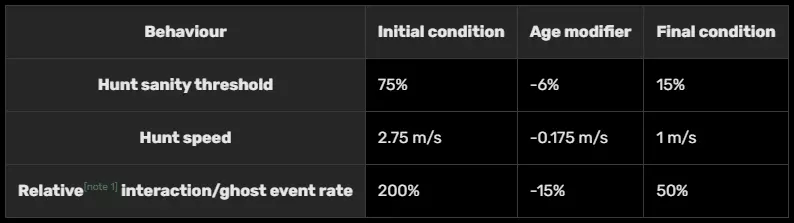 此外,它可以缓慢抬起物体并将其放回原处,直接从地面投掷物体,或者将物体举到空中后向你投掷。重要的是,它可以同时移动多个物体。 女妖 游戏开始时,女妖会选择一名玩家作为目标。 女妖在尝试发起猎杀时,只会影响其目标的理智值,而非团队的平均理智值。猎杀期间,女妖不会杀死非目标玩家,也不会试图追逐他们。圣木对非目标玩家同样有效,但无法完成【用圣木在被追逐时击退鬼魂】这一成就。 如果目标不在屋内,女妖会进行正常猎杀。女妖有时会使用其能力传送到目标所在位置。这与幻影的能力类似。 女妖会触发一种特殊事件,在此事件中它的歌声比其他鬼魂更多。如果你在它唱歌的事件中离它太近并导致它消失,你的理智值流失率会降低15%,而非通常的10%。 当使用 parabolic microphone 时,女妖有机会发出独特的尖叫声般的超自然声音。 精灵 在狩猎期间,如果精灵探测到玩家,它会以2.5米/秒的更快速度冲向玩家,直到距离玩家3米为止。之后,它会以标准的鬼魂速度跟随玩家。如果保险丝盒处于开启状态,会在保险丝盒上产生2级或5级的电磁场读数,并使附近(3米范围内或同一房间内)所有玩家的理智值流失速度降低25%。 梦魇 如果玩家在梦魇附近打开灯光,有几率导致灯光立即熄灭。梦魇无法开灯,且通常会关灯。 当梦魇所在房间的灯处于开启状态时,其狩猎所需的平均理智值流失为40%;若灯处于关闭状态,则需要60%。 梦魇通常会在灯泡爆炸的房间内触发幽灵事件。 (此外,如果其最喜欢的房间内灯是亮着的,它会倾向于前往没有玩家的黑暗房间。) revenant 在狩猎期间,如果 revenant 没有看到任何人,它的移动速度会很慢(1米/秒)。revenant( revenant)看到人并开始追逐时,其移动速度会大幅提升(3米/秒)。 shade( shade) shade可以在极低的平均理智值(约35%)时发起猎杀。 总体而言,它的互动频率低得多。 如果房间内不止一人,shade几乎无法进行互动和发起猎杀。 当平均理智值为100%时,该鬼魂的所有互动尝试都会失败。理智值每降低1%,互动尝试成功的几率就增加2%。因此,当理智值降至50%时,shade的所有互动尝试都会成功。 shade通常喜欢在玩家耳边低语作为互动方式,并且在事件中经常以影子或半透明的形态出现。使用召唤阵和音乐盒更容易探测到它。