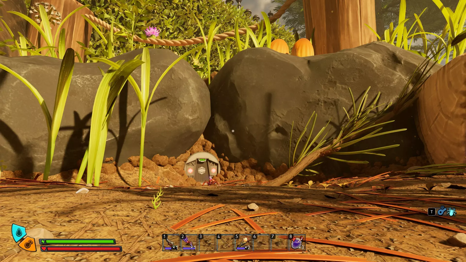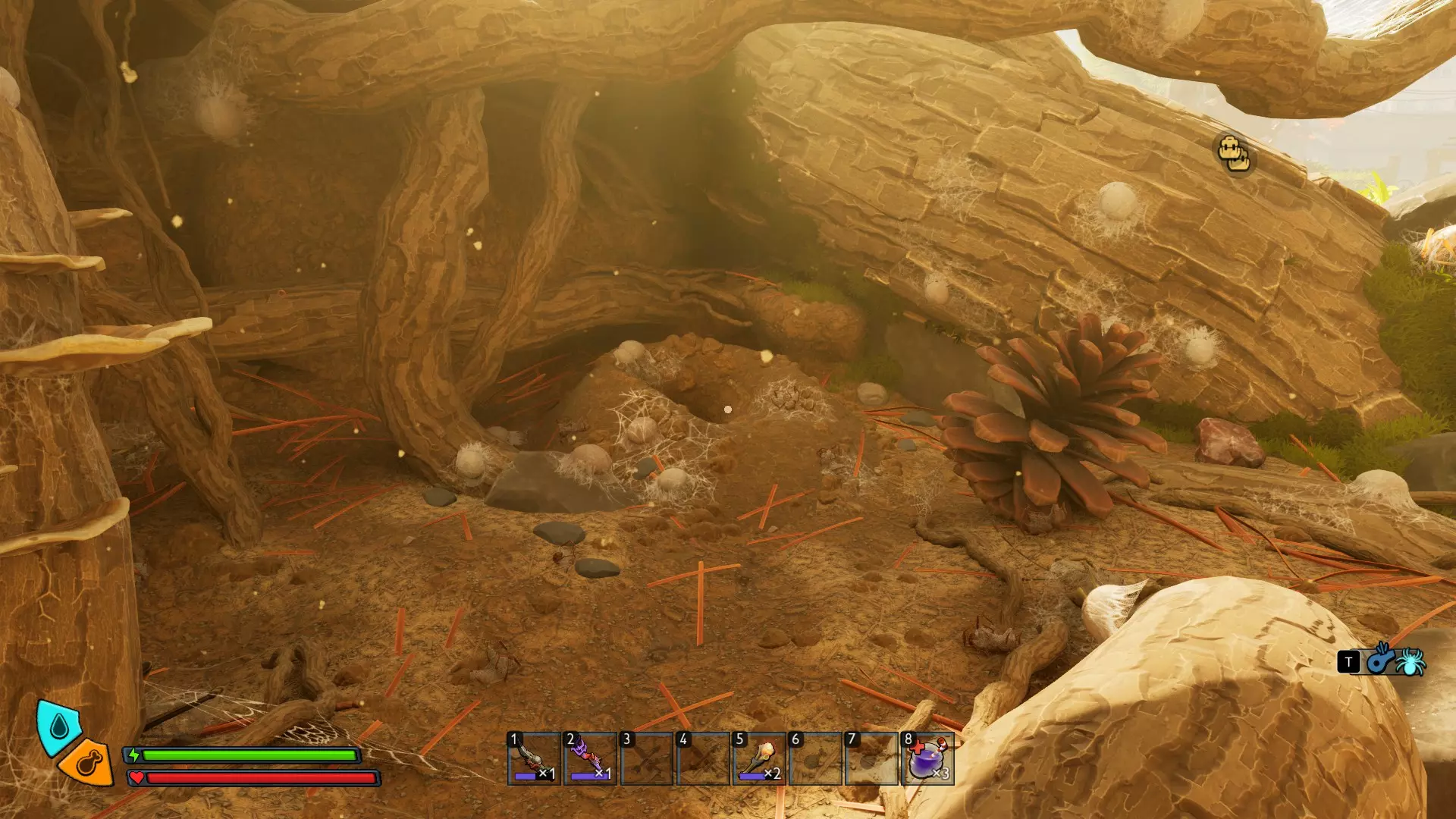 3. 蜘蛛巢穴蚁丘:北入口 在松树北侧一些杂乱的树根下方,靠近一个【虫洞糖果盒】。